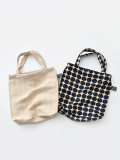 こちらは、ドット柄が目を惹く縦型トートバッグ。生地は程よい生地厚のあるジャガード地。光沢感のあるボディです。A4ファイルや雑誌などある程度の容量があるサイズ感。丈夫な作りで、ぎりぎり無理やり肩下げもできます。