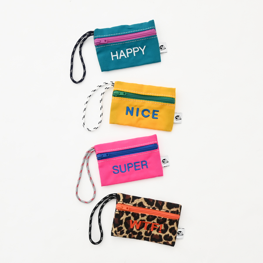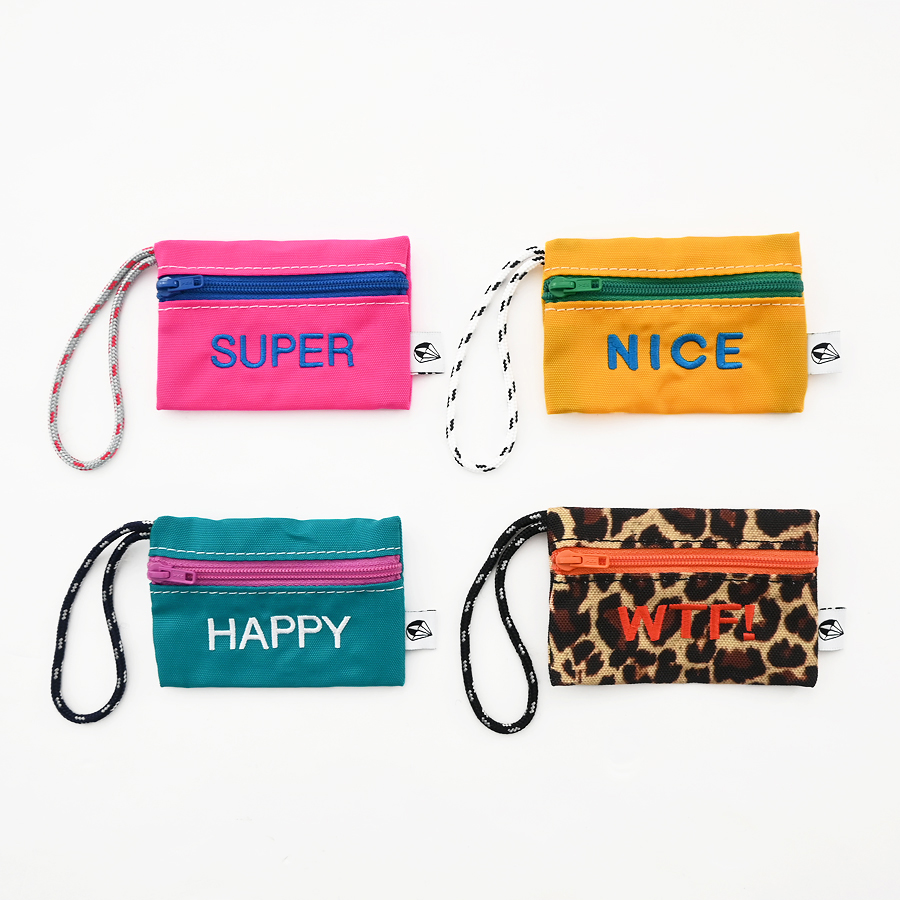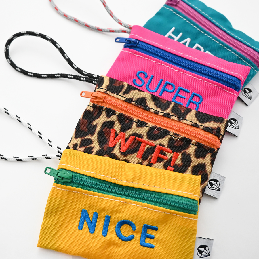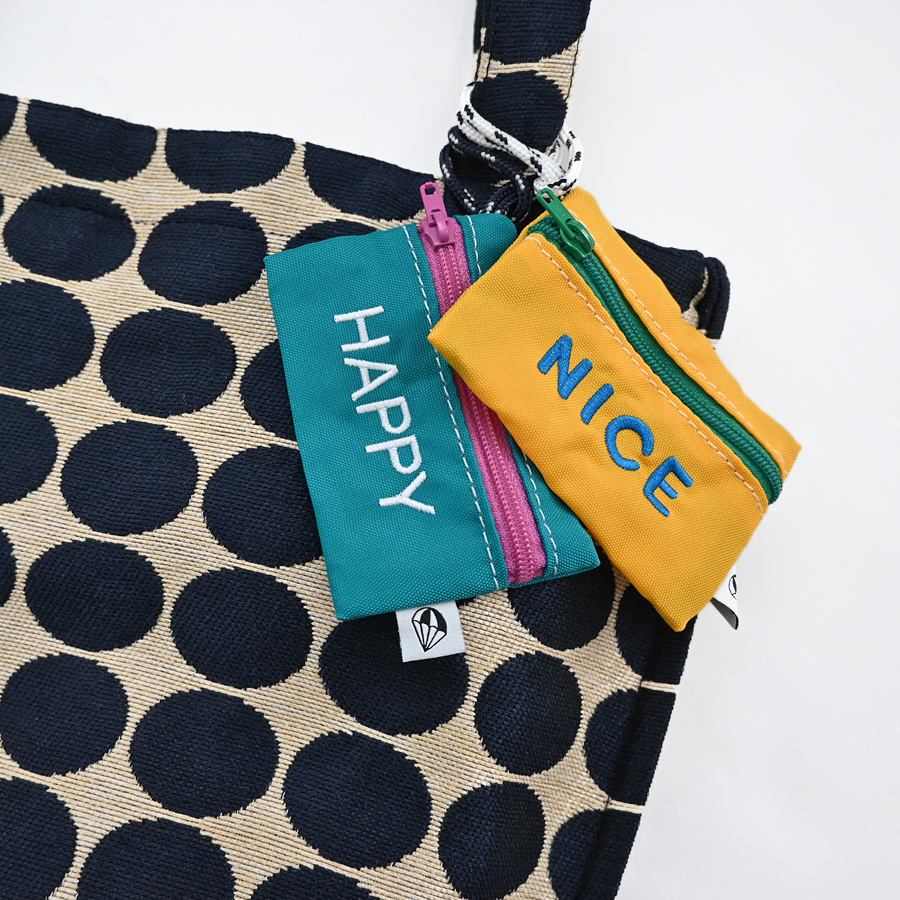 こちらは、バッグのハンドル等への取り付けが可能な長めのロープと可愛らしい刺繍が特徴的なチャーム型のミニポーチ。名刺やクレジットカード・ICカード等がピッタリと収まるサイズ感ですが、Bluetoothイヤホンや電子機器周りのアクセサリ等の収納にも最適なアイテムです。