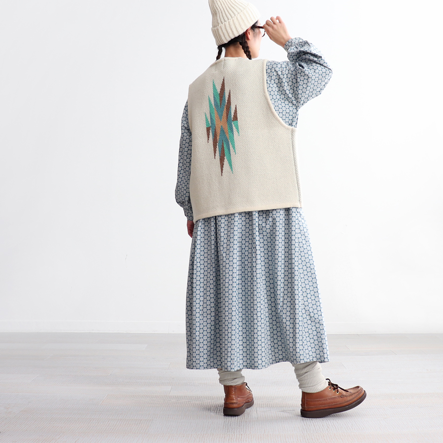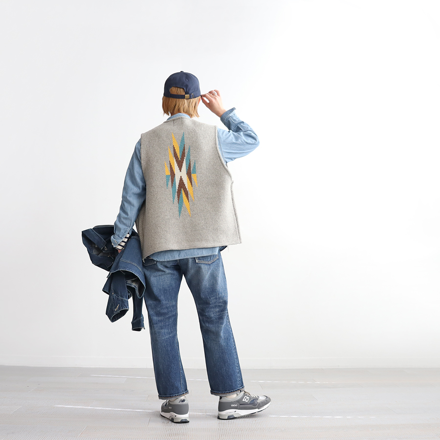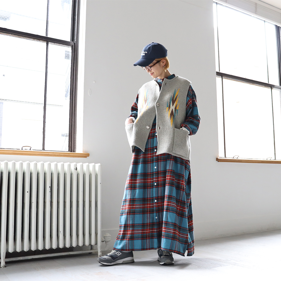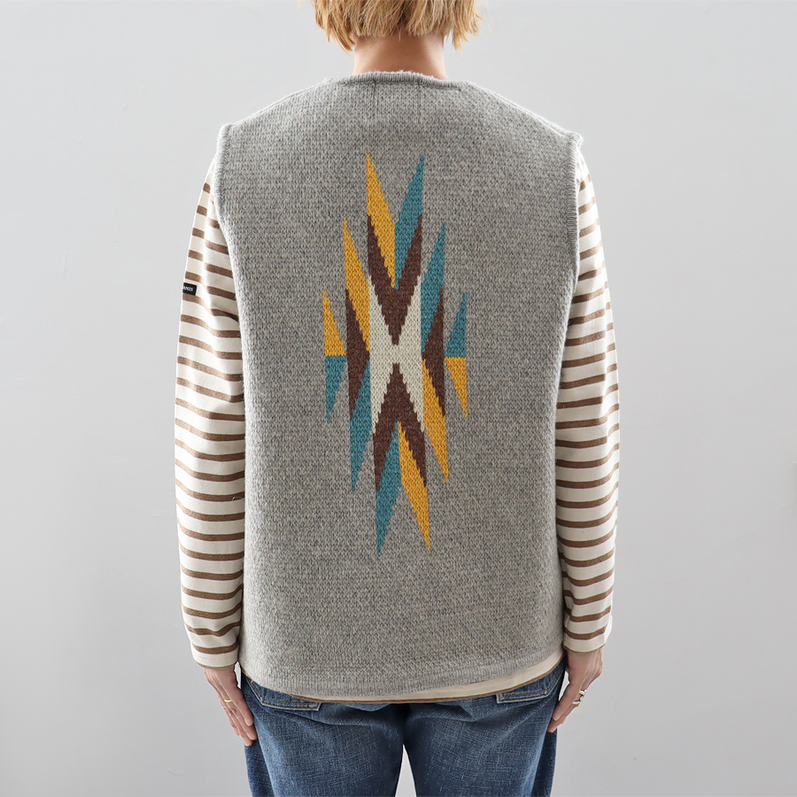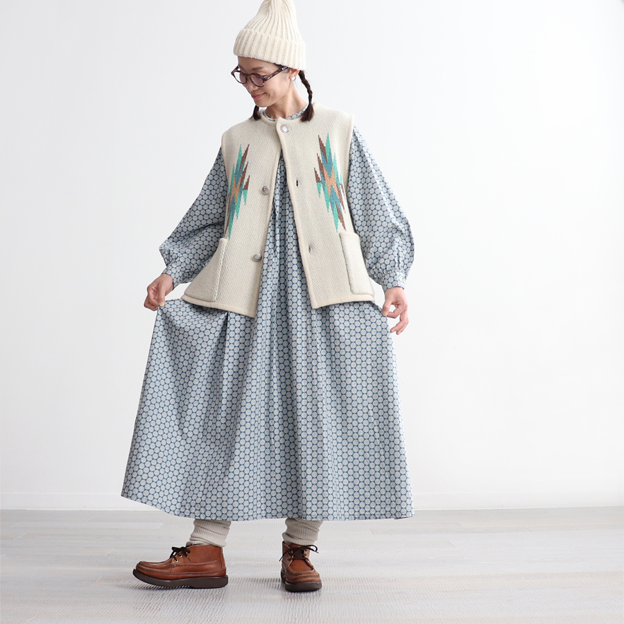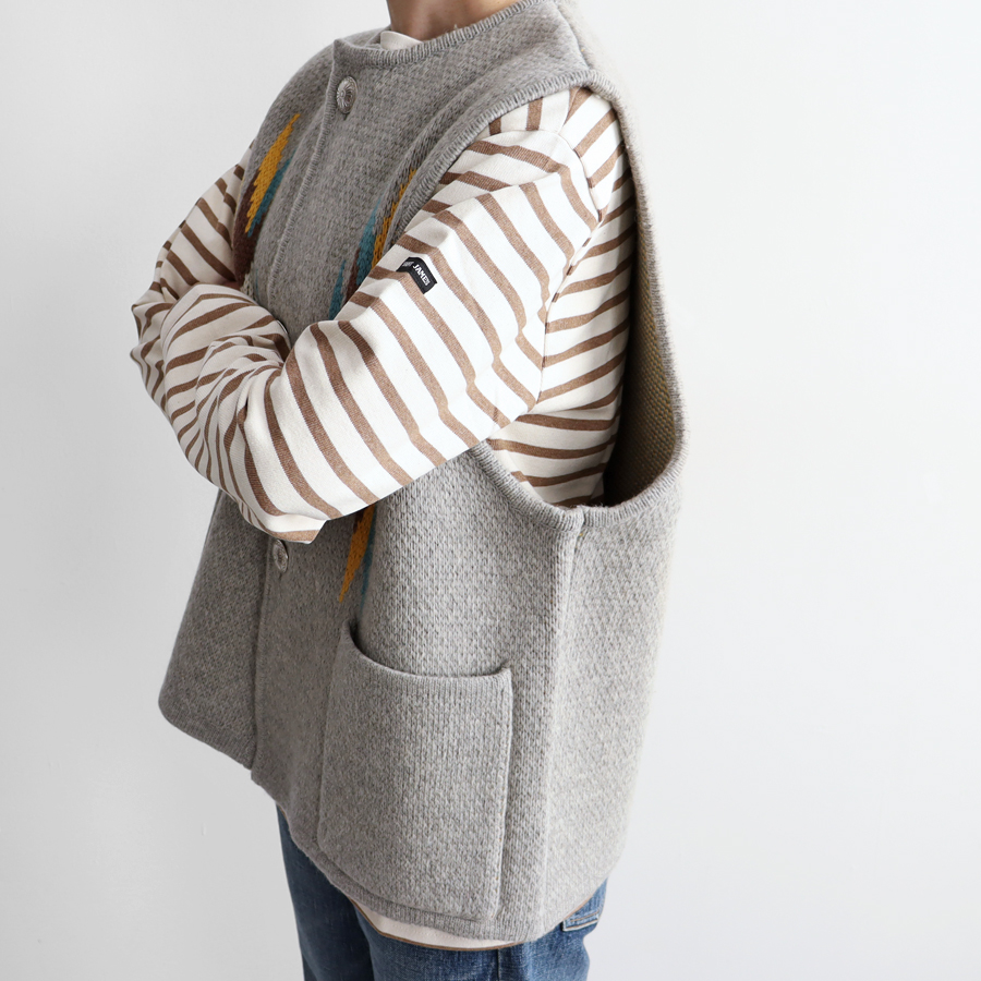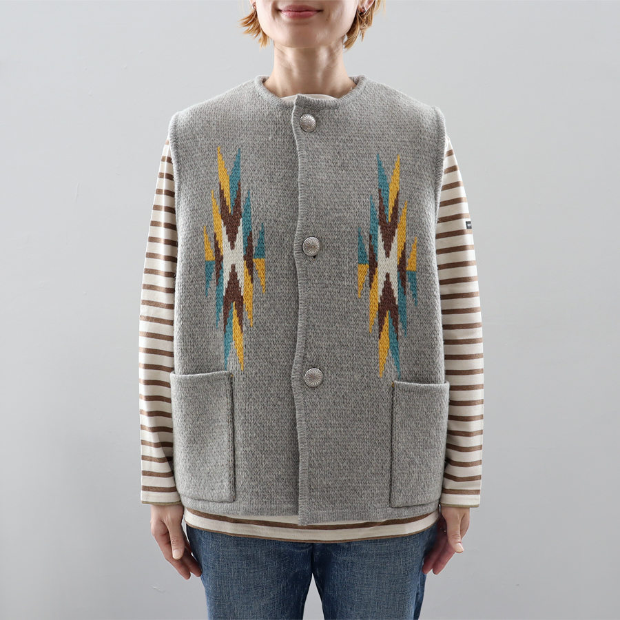 ボディは、肉感のあるニット地。ソフトながらも目の詰まったしっかり目の編地で、ごつすぎではありませんが、安心感のある厚みです。スウェットやドルマン系と合わせやすいようにアームを広くしています。フロントはもちろんコンチョボタン ! 重ね着しやすいように全体的にゆとりある今風なサイズ感にしました。そして、大苦戦したのがチマヨ柄の配色と色合い。正直とっても大変でした。本気のチマヨの色合いよりも、もっと女性らしく、今っぽく、着やすく合わせやすく、そして柔らかくソフトな雰囲気にしたかったのです。それで完成したのがこの2色です ! アイボリーは前回といっしょで、昨年すぐすぐに完売した人気色。グレーは新たに色合わせをリニューアルしました。なかなか良い出来です。