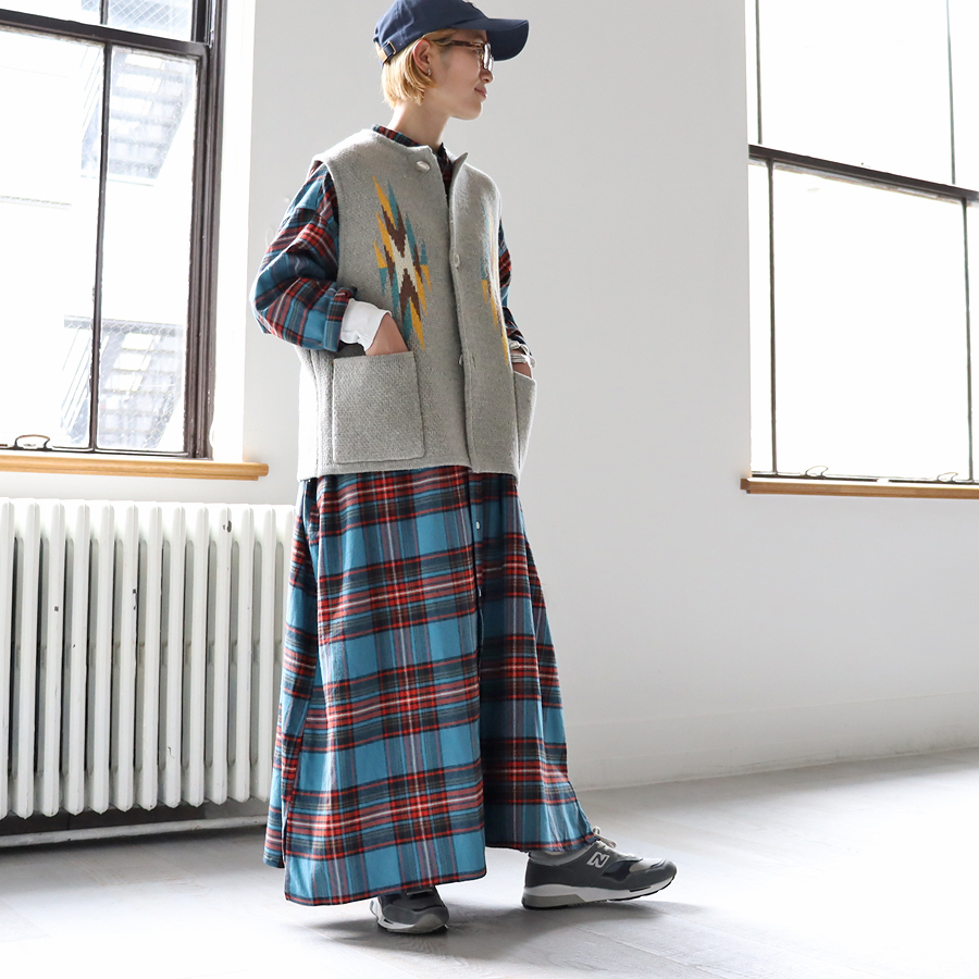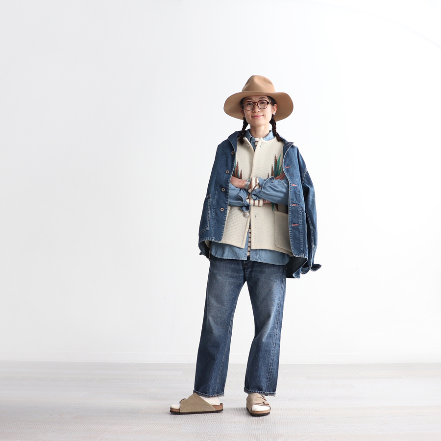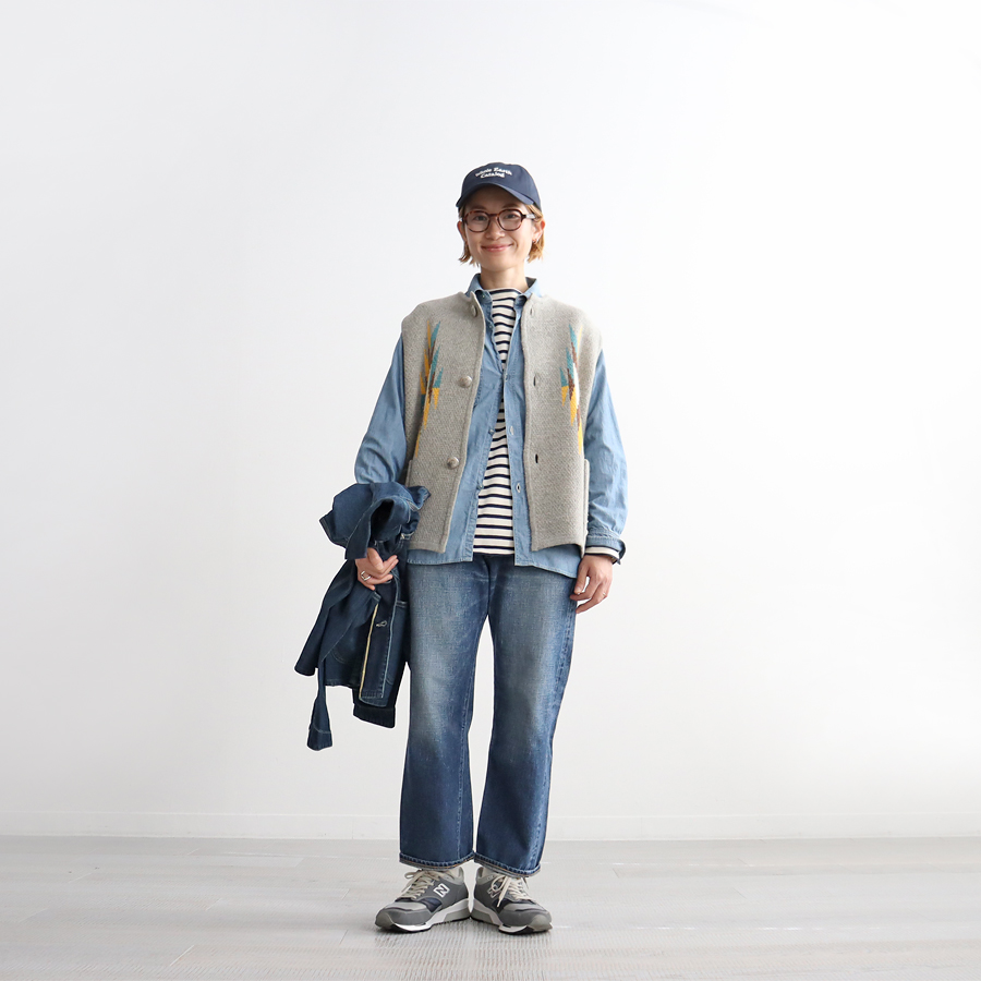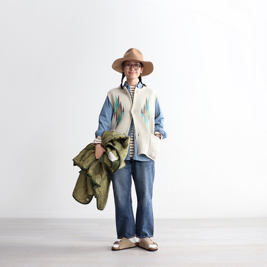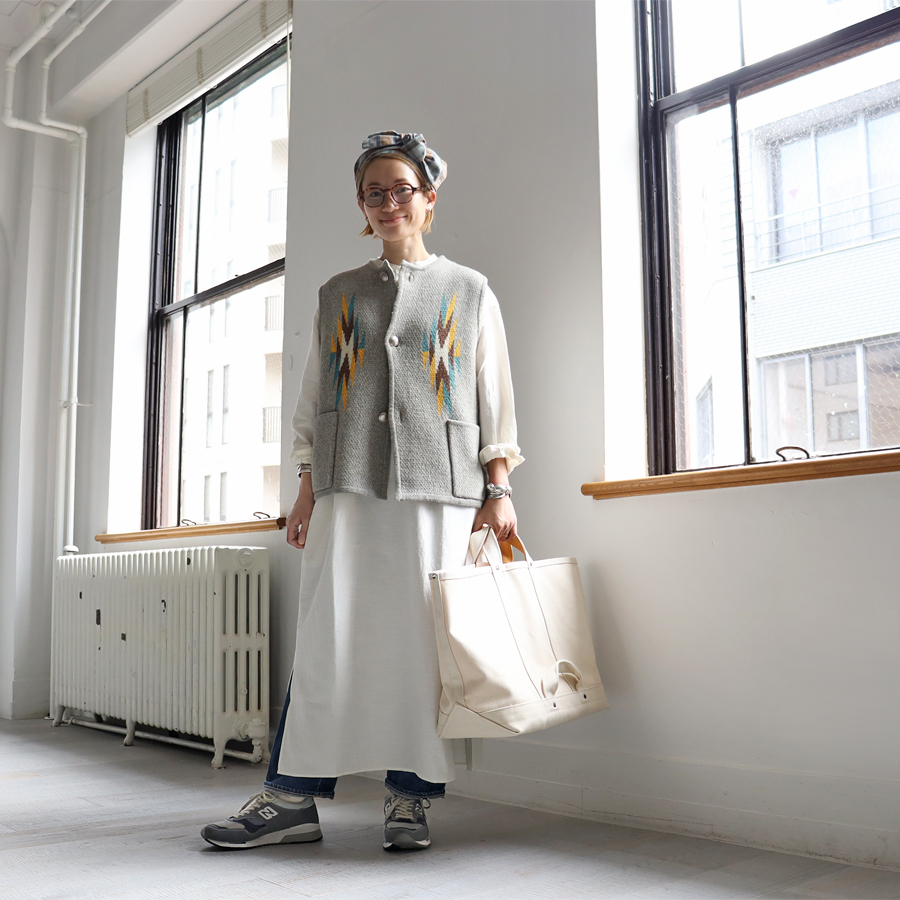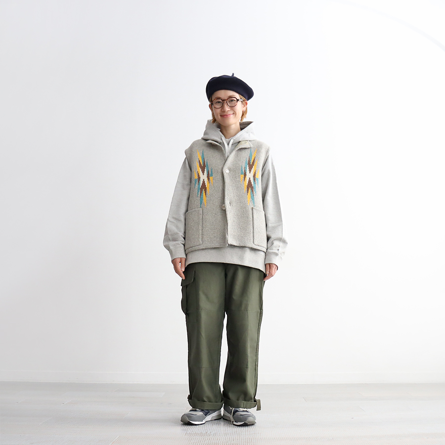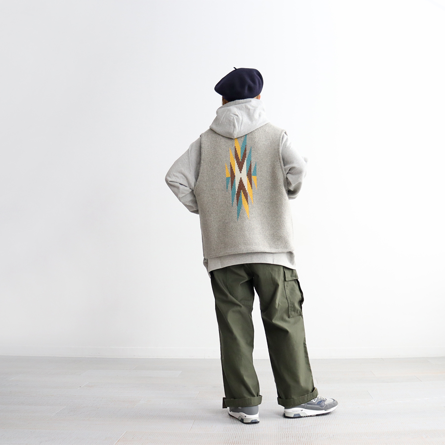 ボディは、肉感のあるニット地。ソフトながらも目の詰まったしっかり目の編地で、ごつすぎではありませんが、安心感のある厚みです。スウェットやドルマン系と合わせやすいようにアームを広くしています。フロントはもちろんコンチョボタン ! 重ね着しやすいように全体的にゆとりある今風なサイズ感にしました。そして、大苦戦したのがチマヨ柄の配色と色合い。正直とっても大変でした。本気のチマヨの色合いよりも、もっと女性らしく、今っぽく、着やすく合わせやすく、そして柔らかくソフトな雰囲気にしたかったのです。それで完成したのがこの2色です ! アイボリーは前回といっしょで、昨年すぐすぐに完売した人気色。グレーは新たに色合わせをリニューアルしました。なかなか良い出来です。
