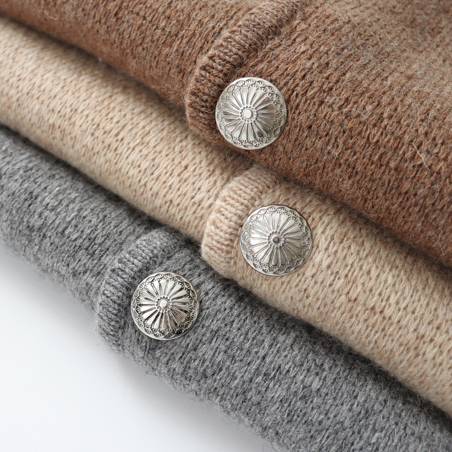ボディは、肉感のあるニット地。ソフトながらも目の詰まったしっかり目の編地で、ごつすぎではありませんが、安心感のある厚みです。スウェットやドルマン系と合わせやすいようにアームを広くしています。重ね着しやすいように全体的にゆとりある今風なサイズ感にしました。