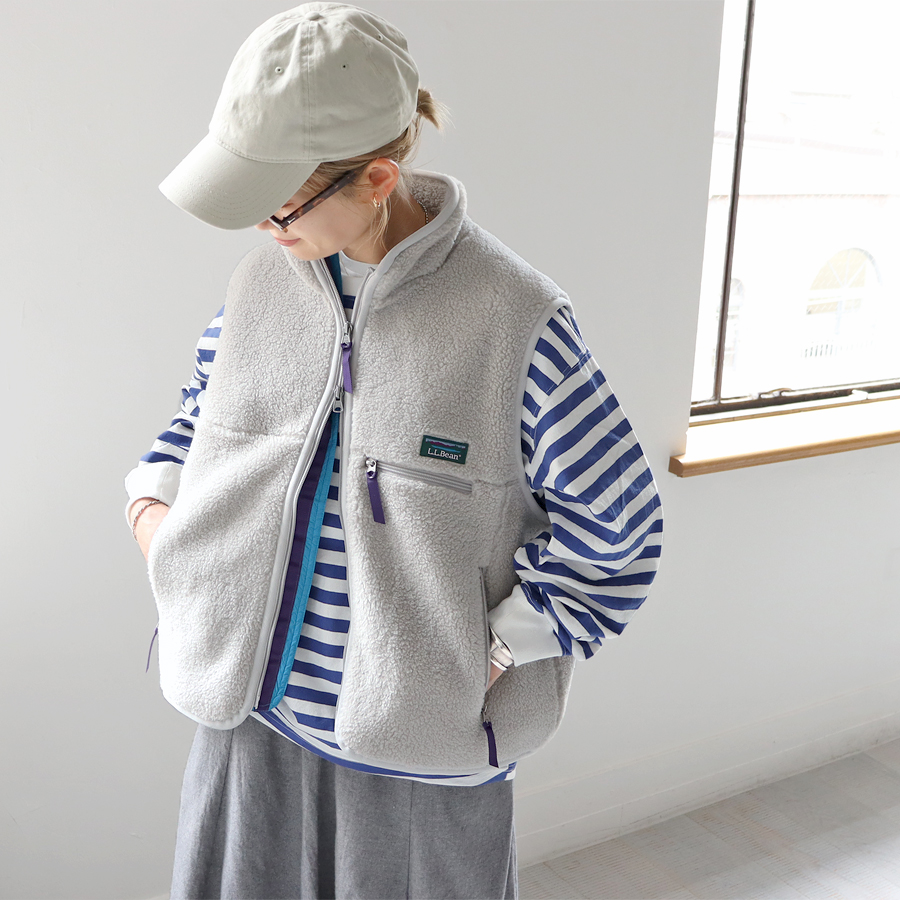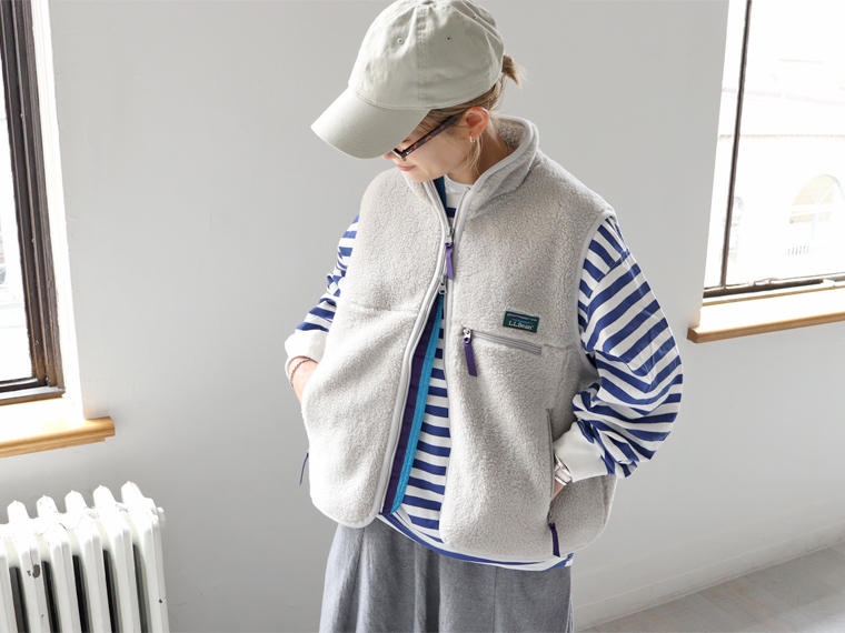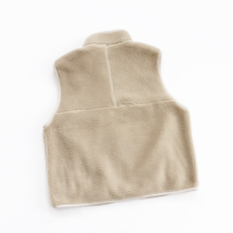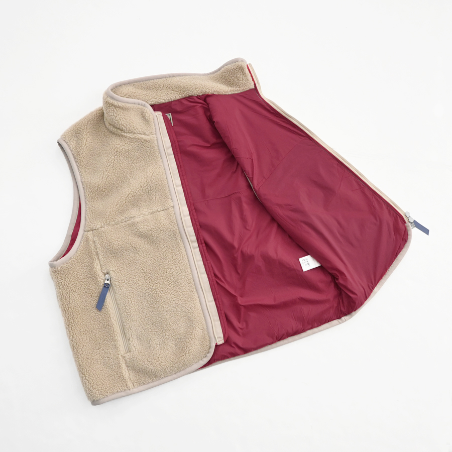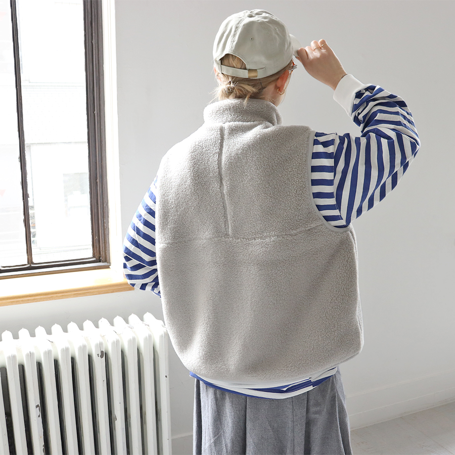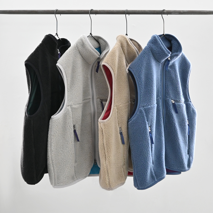 90年代のアーカイブのフリース・ジャケットをベースにデザイン。素材は、高機能繊維サーモライト糸を使用した、とてもソフトで膨らみのあるオリジナルのフラッフィー・ボア・フリースを採用。裏地にナイロン・タフタを配し、軽量ながらも保温性に優れた防風機能のあるベストに仕上げています。前はコーディネートによって開け方を変えられるダブルジップ仕様。