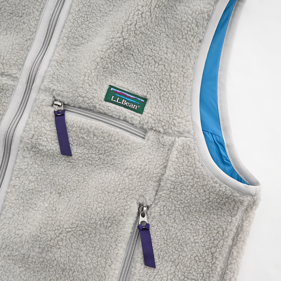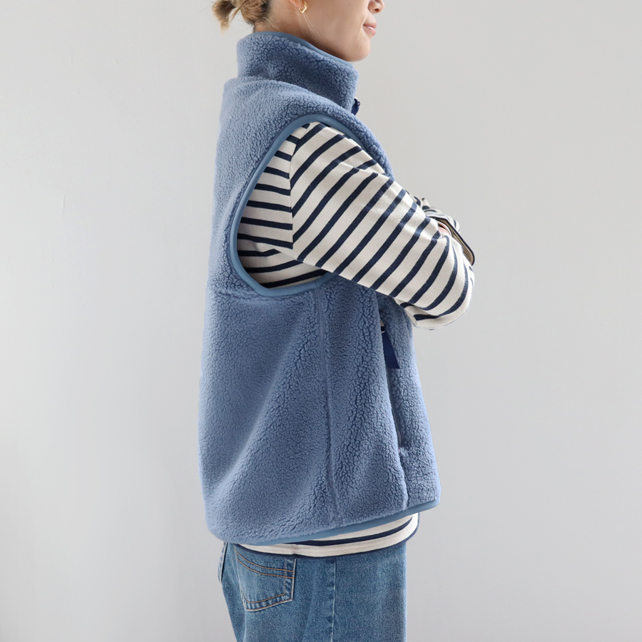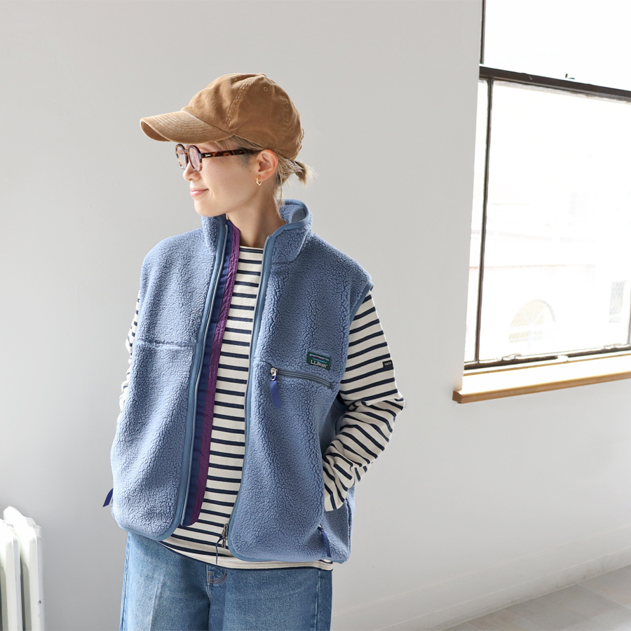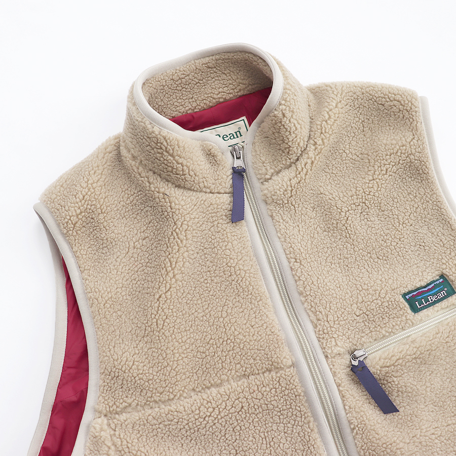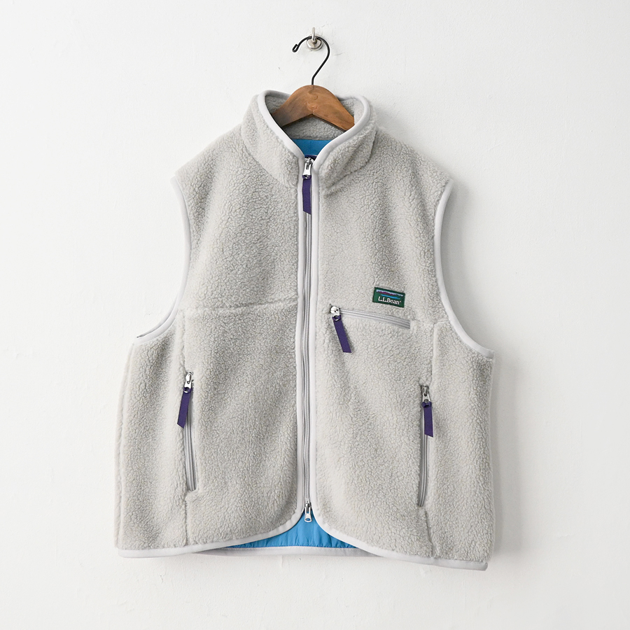 90年代のアーカイブのフリース・ジャケットをベースにデザイン。素材は、高機能繊維サーモライト糸を使用した、とてもソフトで膨らみのあるオリジナルのフラッフィー・ボア・フリースを採用。裏地にナイロン・タフタを配し、軽量ながらも保温性に優れた防風機能のあるベストに仕上げています。前はコーディネートによって開け方を変えられるダブルジップ仕様。