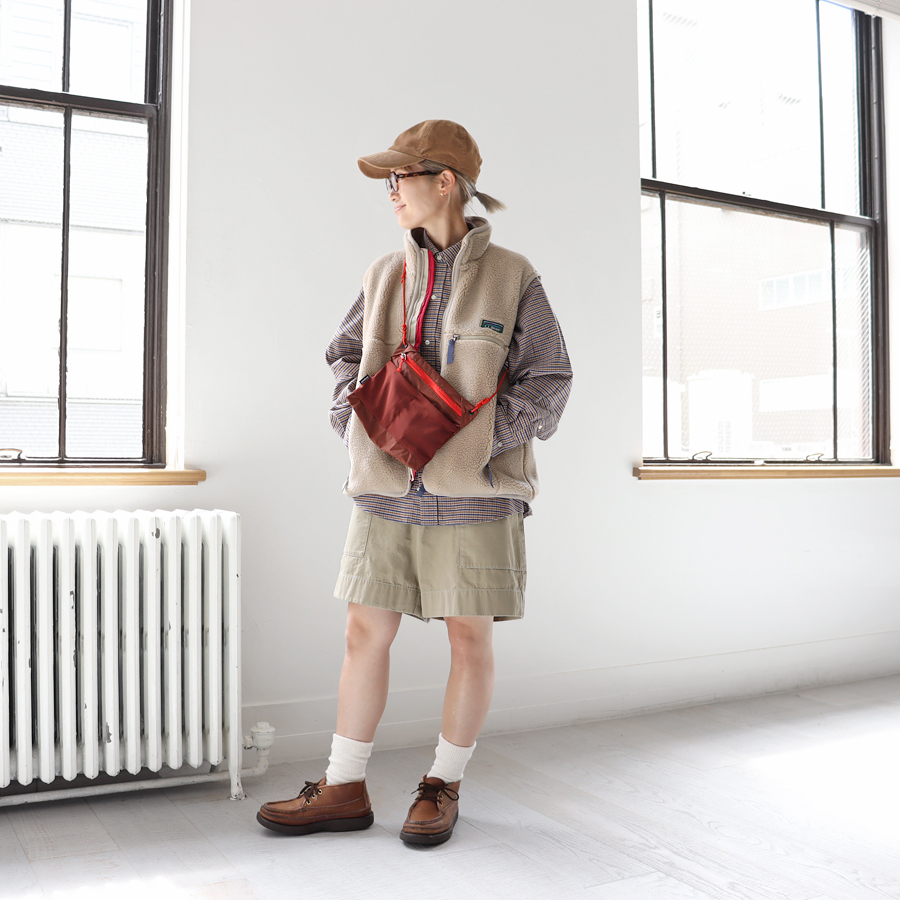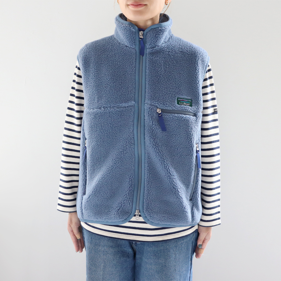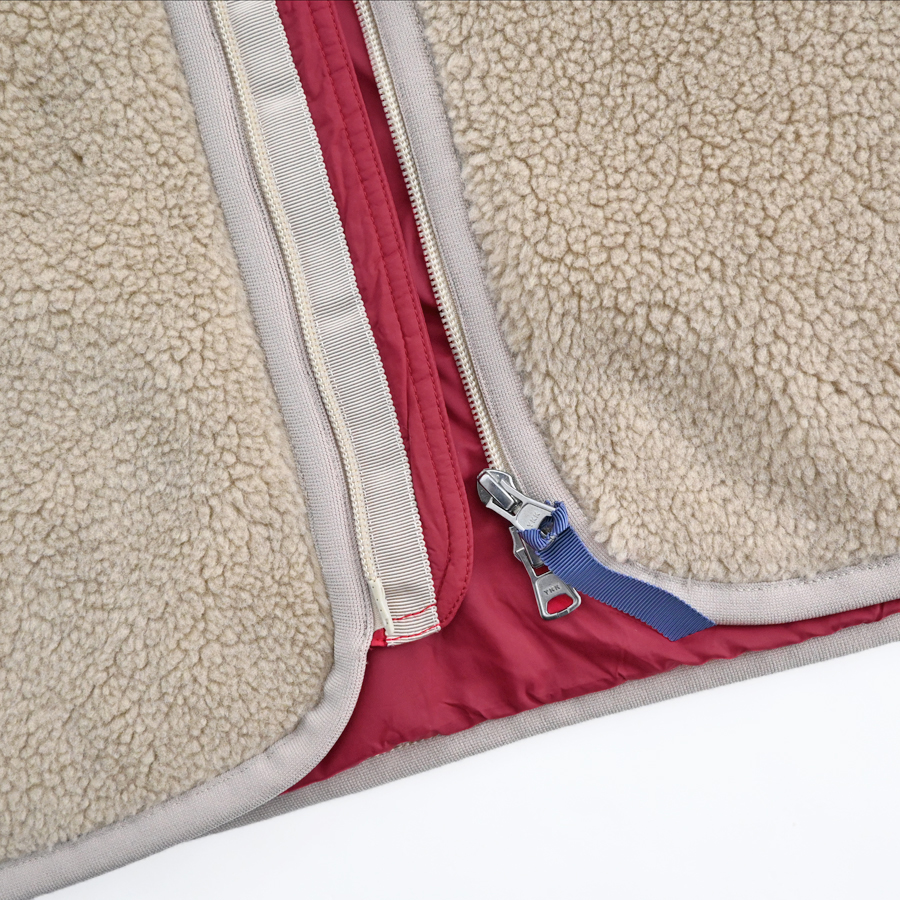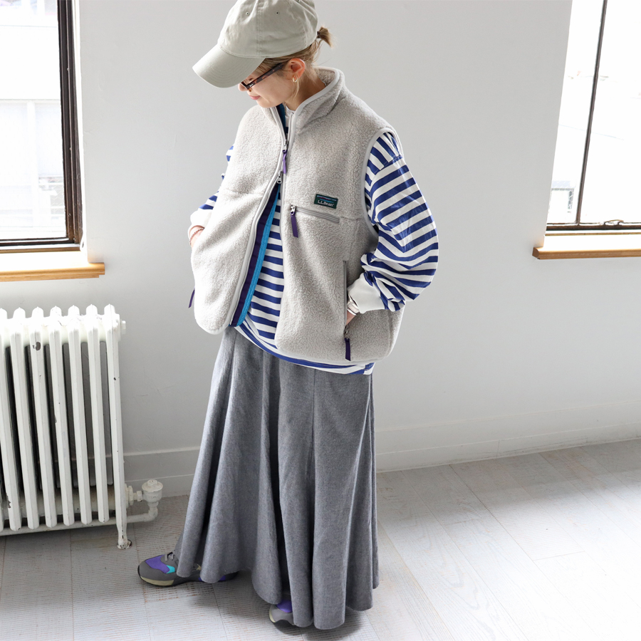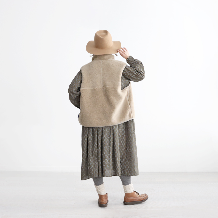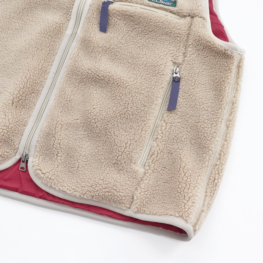 90年代のアーカイブのフリース・ジャケットをベースにデザイン。素材は、高機能繊維サーモライト糸を使用した、とてもソフトで膨らみのあるオリジナルのフラッフィー・ボア・フリースを採用。裏地にナイロン・タフタを配し、軽量ながらも保温性に優れた防風機能のあるベストに仕上げています。前はコーディネートによって開け方を変えられるダブルジップ仕様。