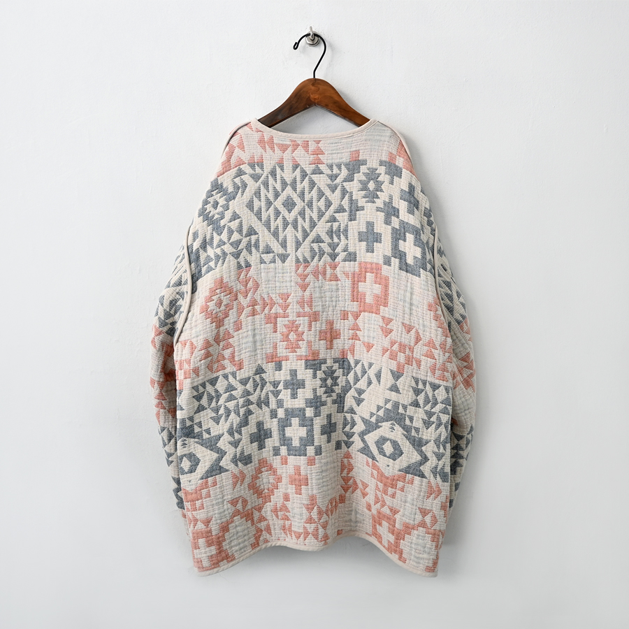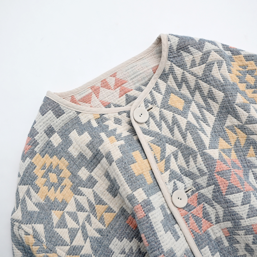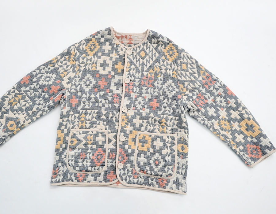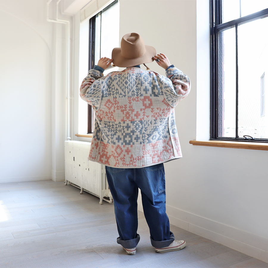 こちらは、男女兼用サイズのリバーシブルジャケット。Pendletonにて展開していた寝具用ベッドカバーから着想した、アメリカンレトロなキルトのような生地は、3重織りガーゼに太番手糸を入れて軽量かつ嵩高に仕上げています。ジャカードにすることで立体感のある柄を表現しています。表裏で異なる素材やカラーを採用し、その日の気分やコーディネートに合わせて着こなしを自在にアレンジが可能。軽い保温性もあり、季節の変わり目のアウター代わりとしても重宝しそうです。男女兼用のフリーサイズ、ゆったりめなサイズ感です。