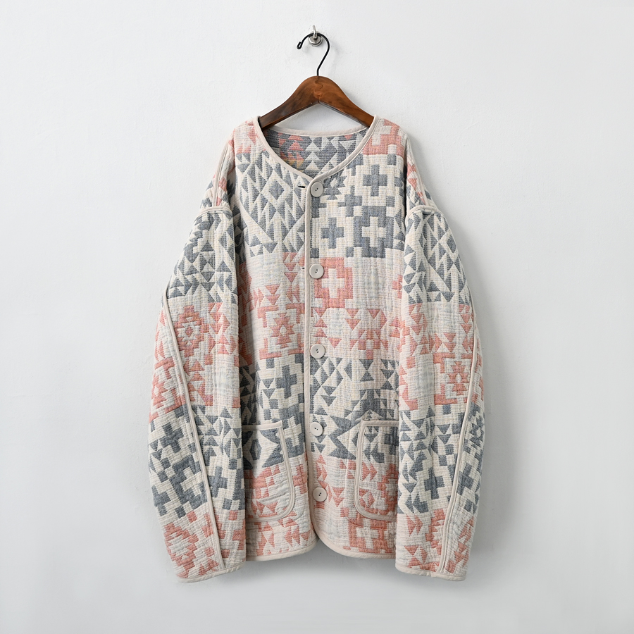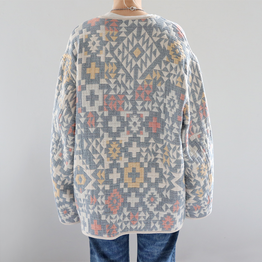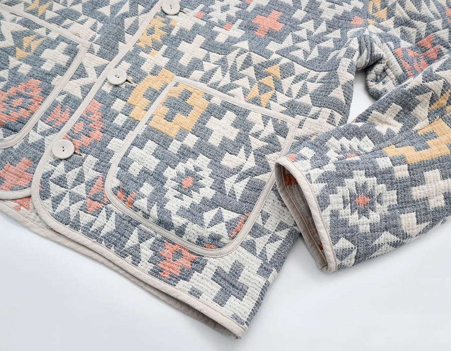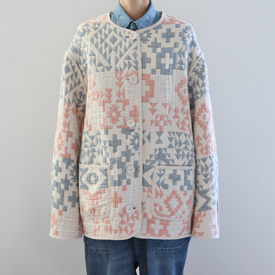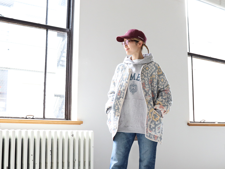 こちらは、男女兼用サイズのリバーシブルジャケット。Pendletonにて展開していた寝具用ベッドカバーから着想した、アメリカンレトロなキルトのような生地は、3重織りガーゼに太番手糸を入れて軽量かつ嵩高に仕上げています。ジャカードにすることで立体感のある柄を表現しています。表裏で異なる素材やカラーを採用し、その日の気分やコーディネートに合わせて着こなしを自在にアレンジが可能。軽い保温性もあり、季節の変わり目のアウター代わりとしても重宝しそうです。男女兼用のフリーサイズ、ゆったりめなサイズ感です。
