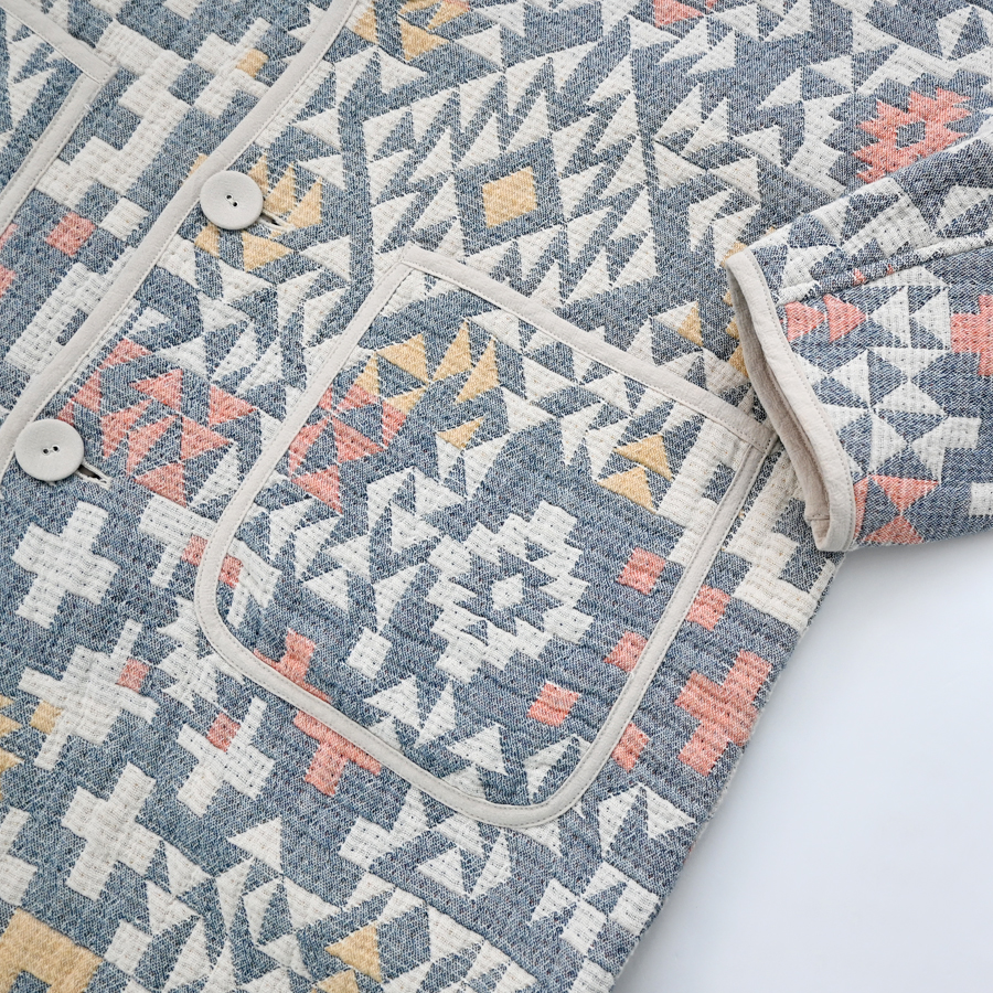 こちらは、男女兼用サイズのリバーシブルコート。Pendletonにて展開していた寝具用ベッドカバーから着想した、アメリカンレトロなキルトのような生地は、3重織りガーゼに太番手糸を入れて軽量かつ嵩高に仕上げています。ジャカードにすることで立体感のある柄を表現しています。表裏で異なる素材やカラーを採用し、その日の気分やコーディネートに合わせて着こなしを自在にアレンジが可能。軽い保温性もあり、季節の変わり目のアウターとしても重宝します。男女兼用のフリーサイズ、ゆったりめなサイズ感です。