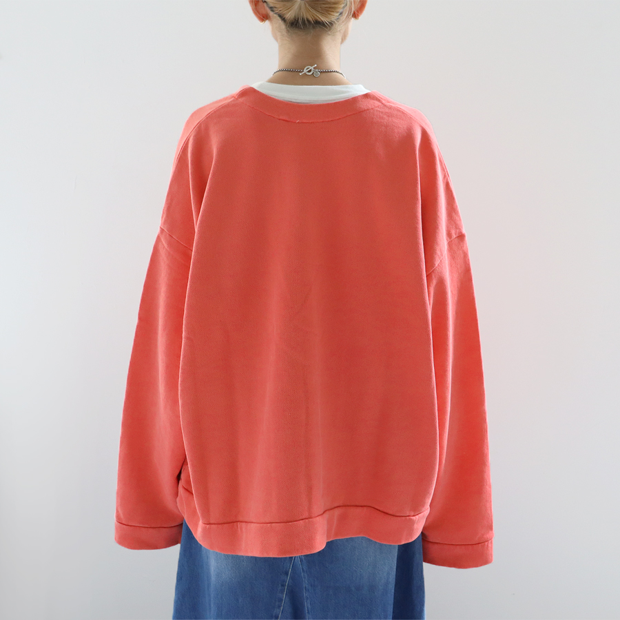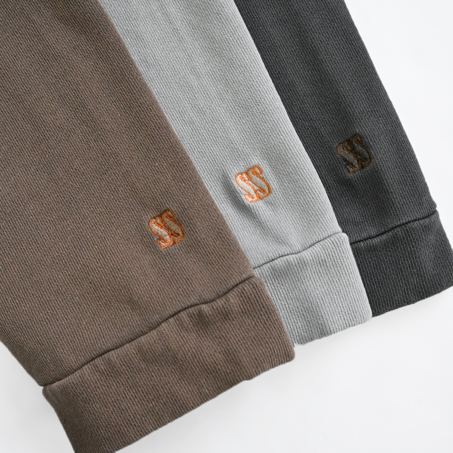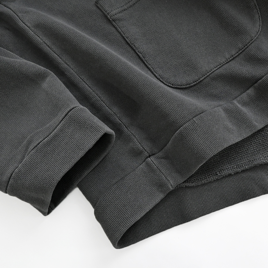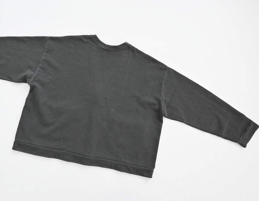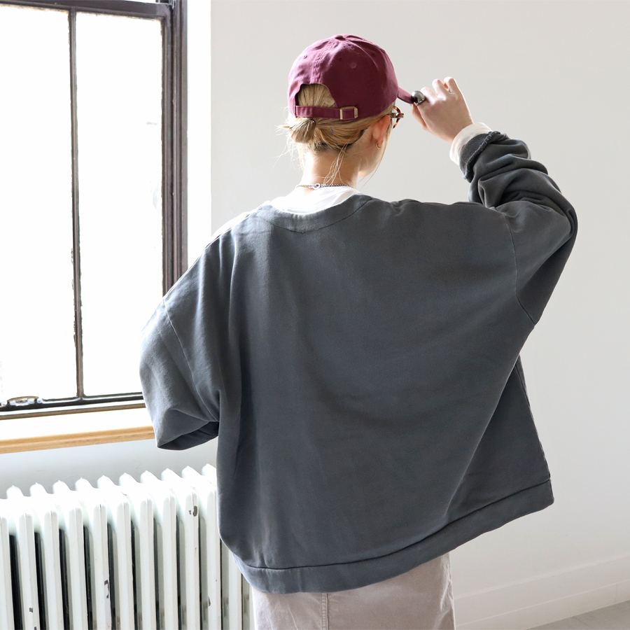 生地は薄くもなく厚すぎない程よい生地厚のコットン裏毛素材を使用。 ドライで素朴な風合いが特徴。 ウォッシュ加工が施されており、ヴィンテージ感のある表情を作り上げています。