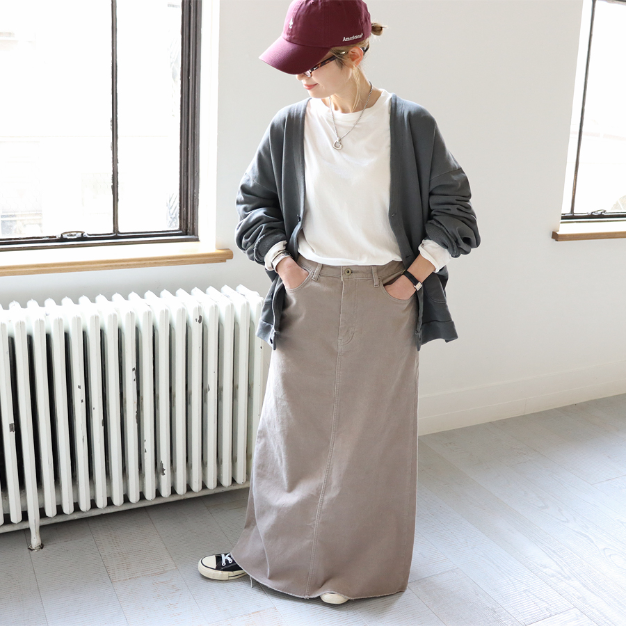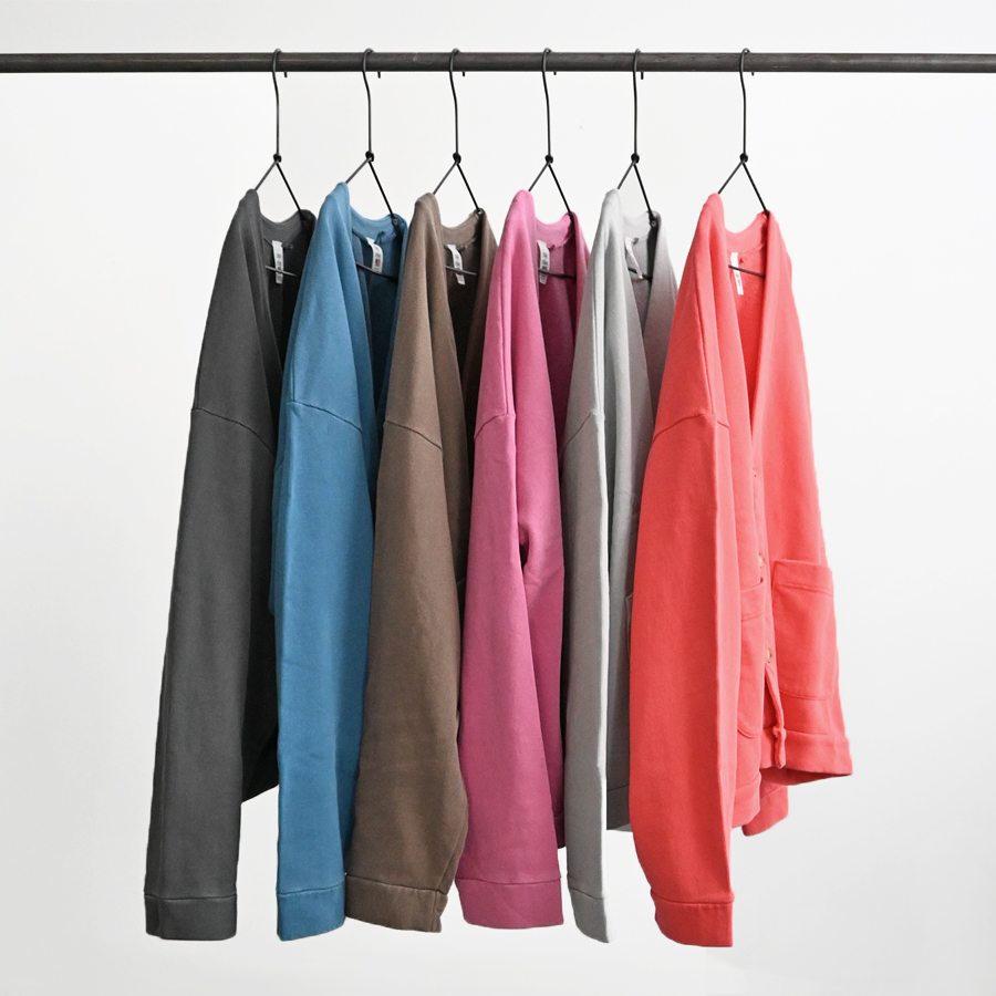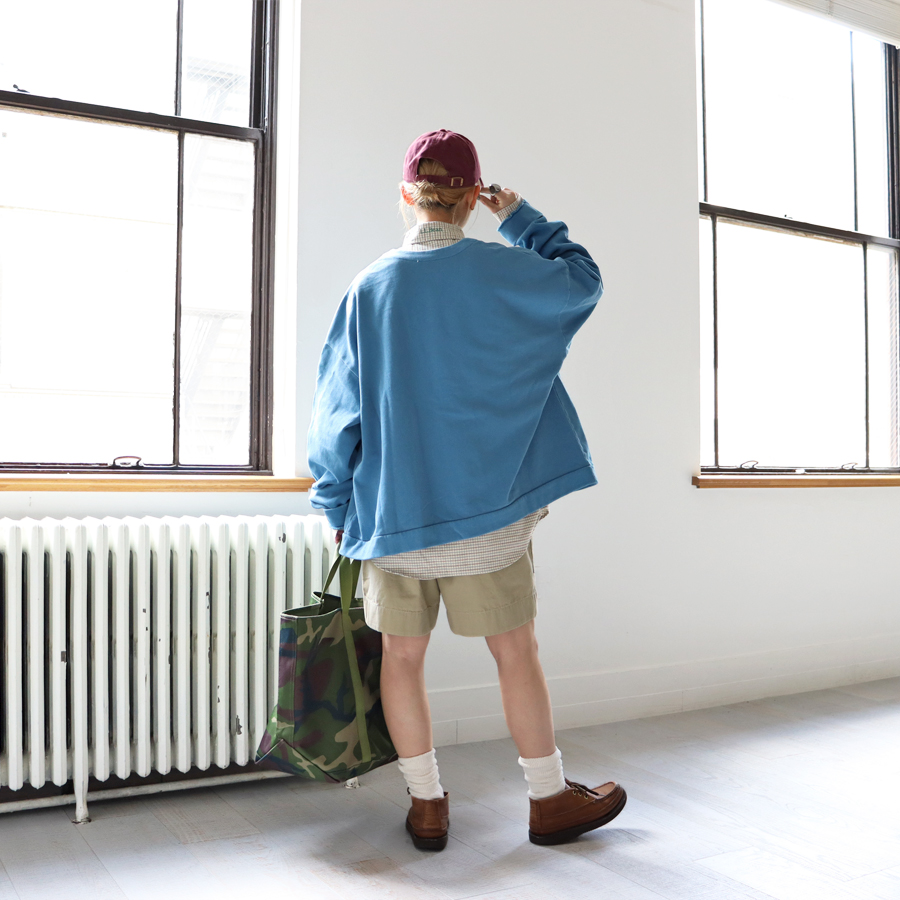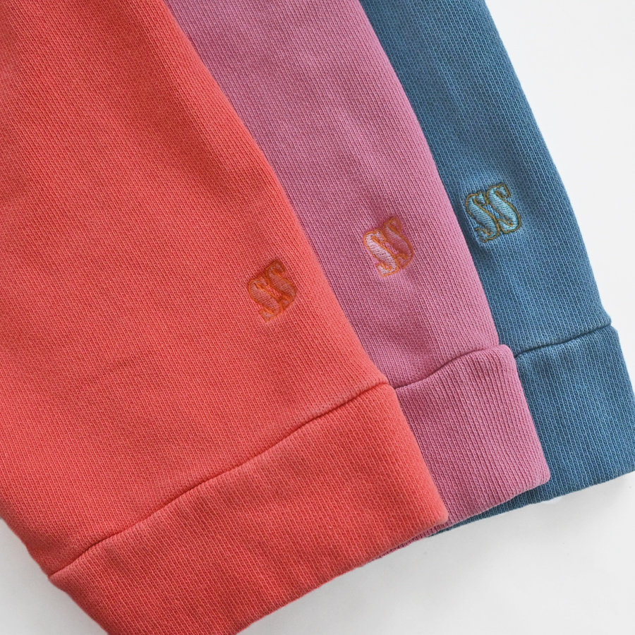 生地は薄くもなく厚すぎない程よい生地厚のコットン裏毛素材を使用。 ドライで素朴な風合いが特徴。 ウォッシュ加工が施されており、ヴィンテージ感のある表情を作り上げています。
