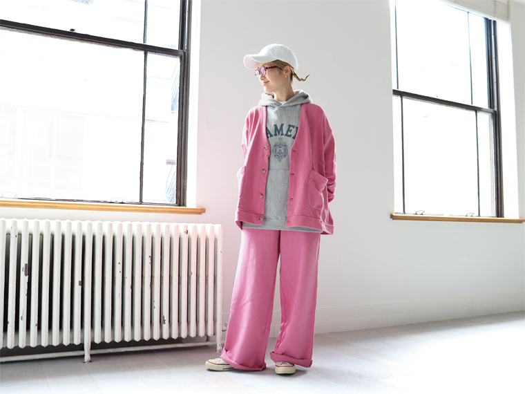 お揃いのスウェットパンツとセットアップでの着こなしもオススメです。