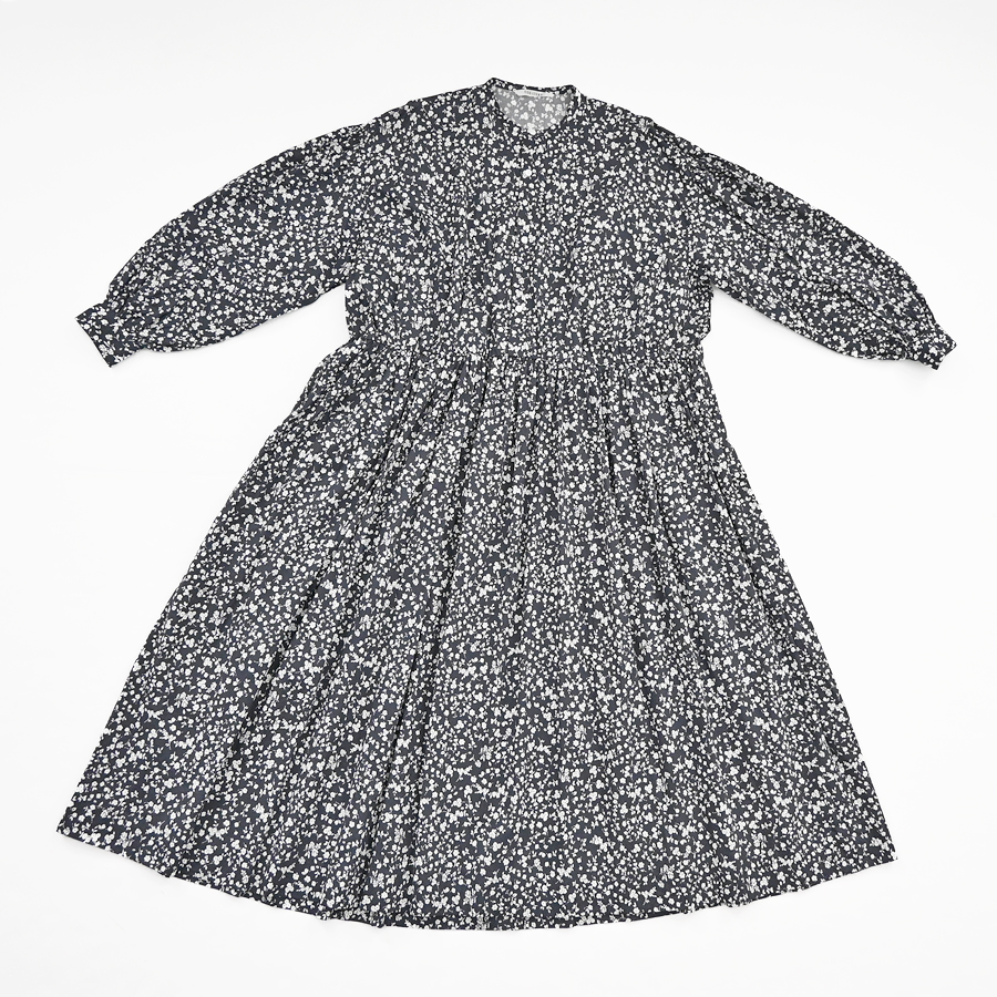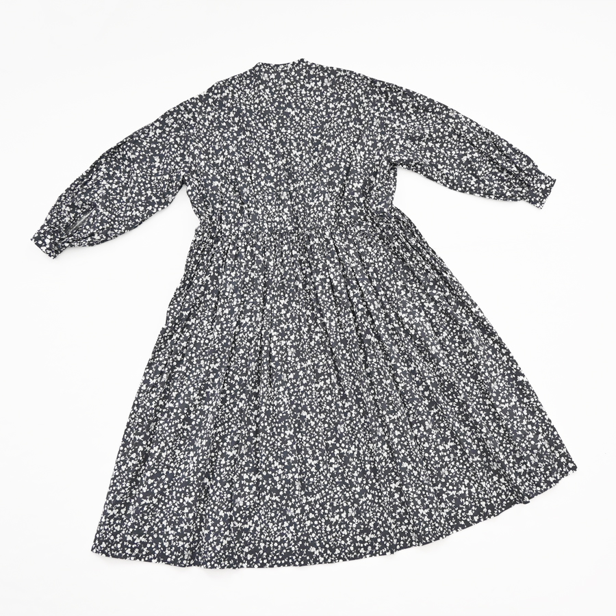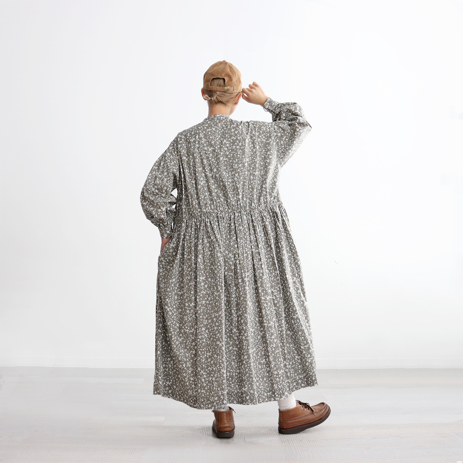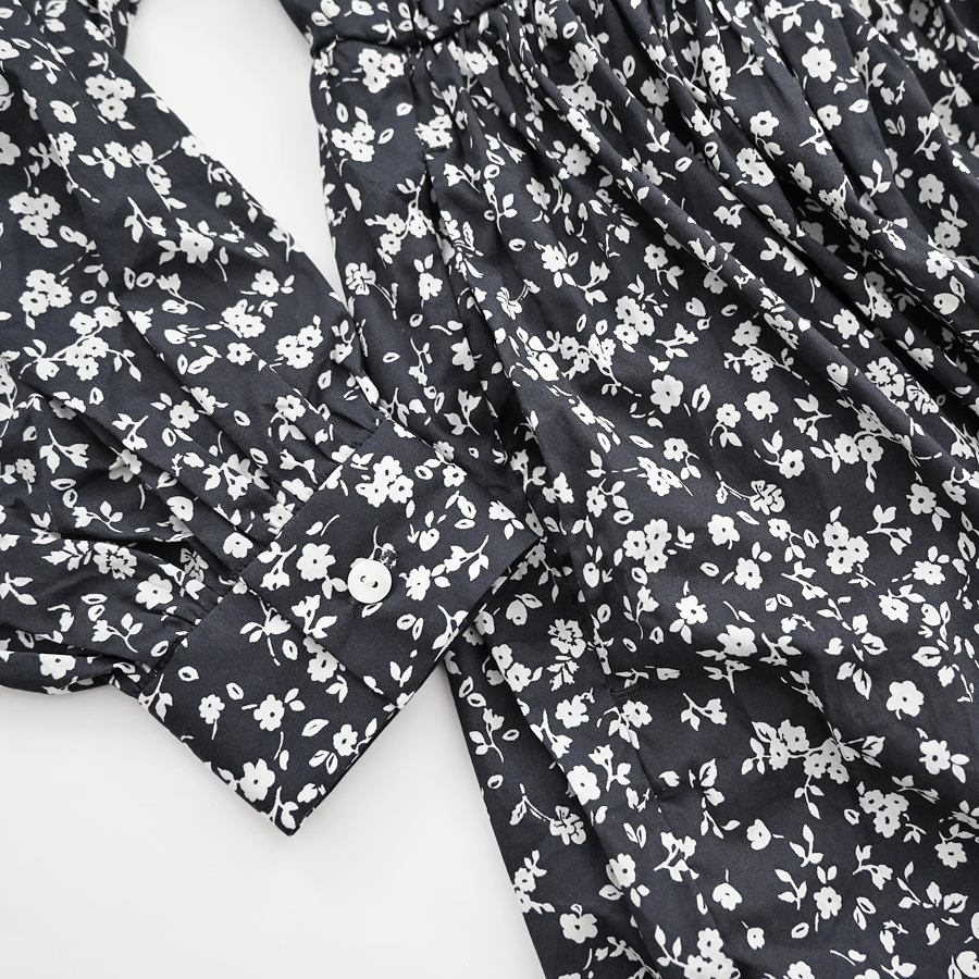 こちらは、小花柄のギャザーワンピース。ウエスト切り替え部分には細かなギャザーがたっぷり。ウエスト部分までフロントの前開きボタン仕様となっています。生地をたっぷりと贅沢に使用しボリュームあるシルエット。生地はコットンストレッチクロス。