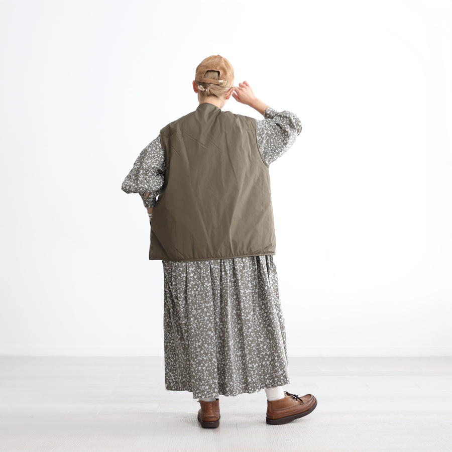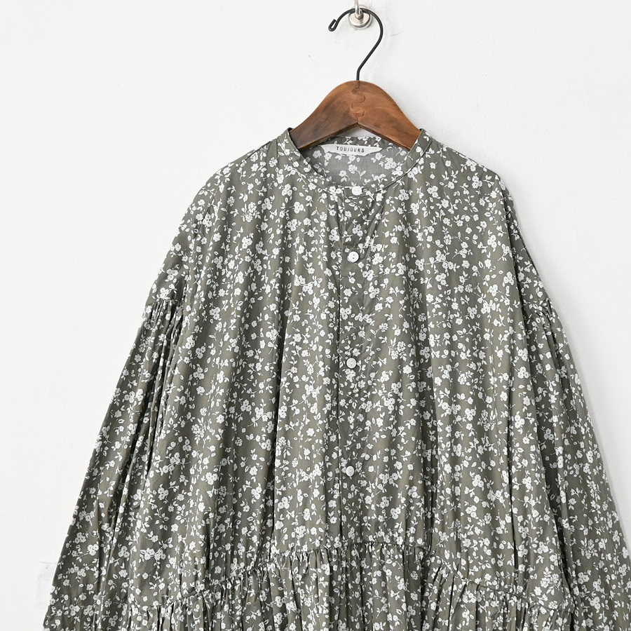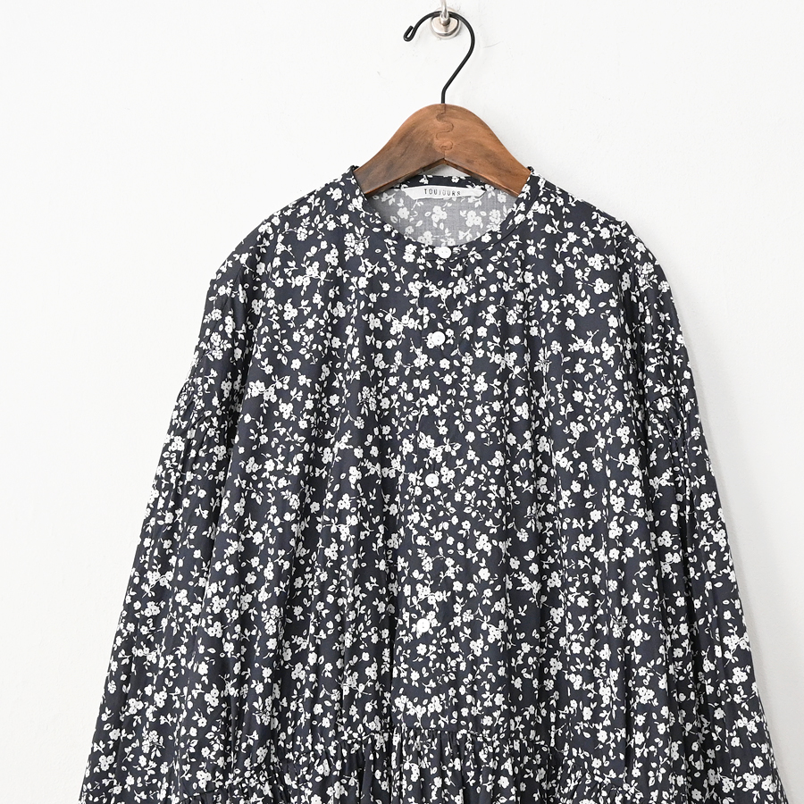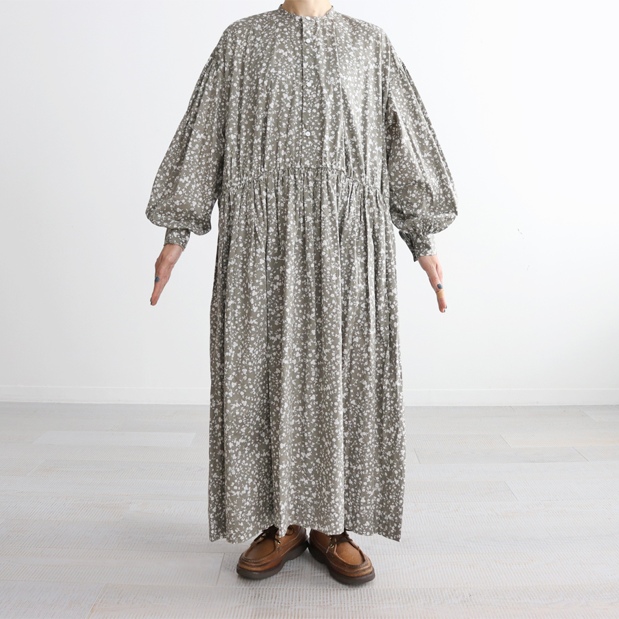 こちらは、小花柄のギャザーワンピース。ウエスト切り替え部分には細かなギャザーがたっぷり。ウエスト部分までフロントの前開きボタン仕様となっています。生地をたっぷりと贅沢に使用しボリュームあるシルエット。生地はコットンストレッチクロス。