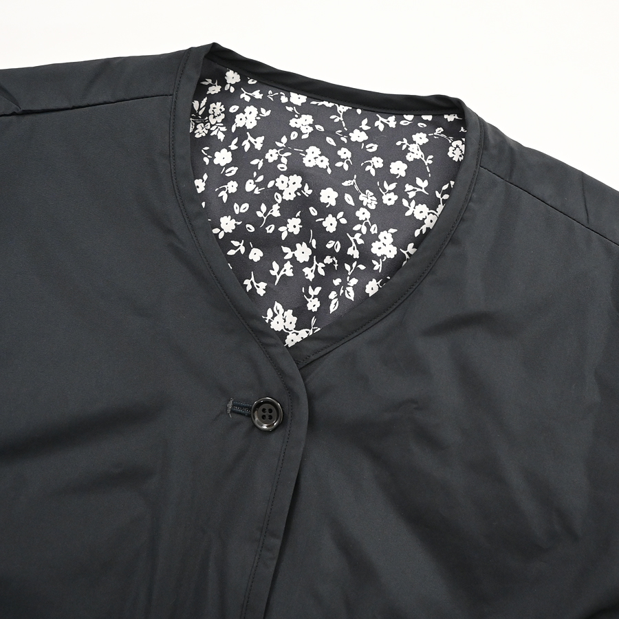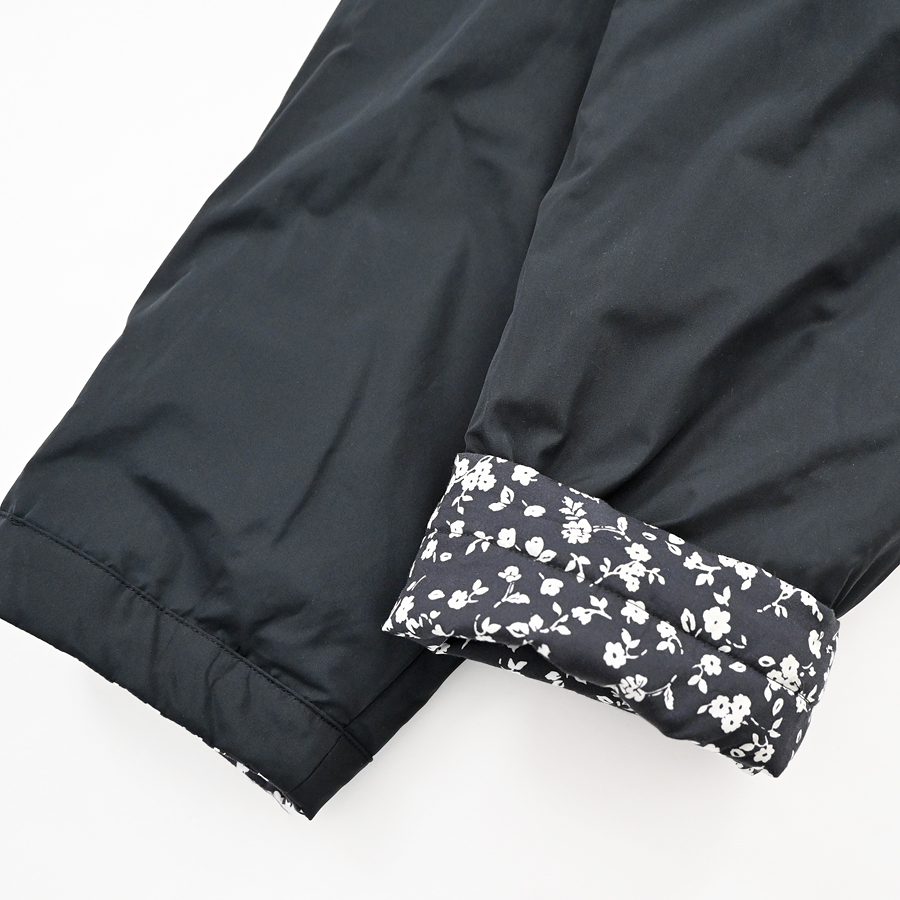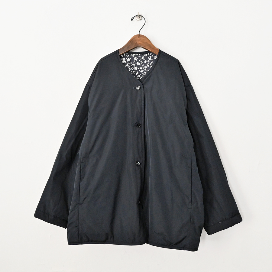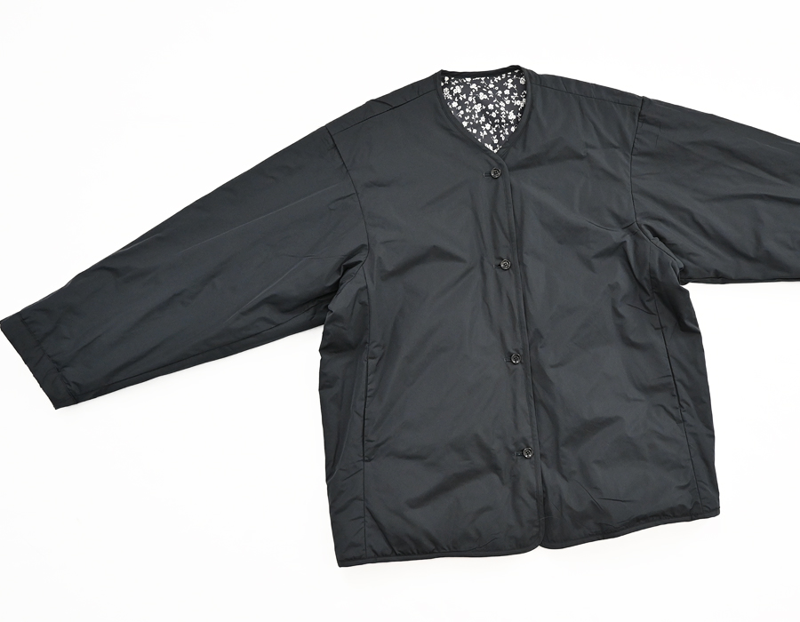 こちらは、小花柄とシックなソリッドカラーとのリバーシブルジャケット。ヴィンテージライクな小花柄の生地はコットンストレッチクロス。 滑らかで光沢感のある生地で、程よくハリ感のある柔らかな肌触りが特徴です。ソリッド面は、ほんのり光沢感のあるポリエステル生地。ボリュームを抑えた中綿入りで、着ぶくれ感もなく、さらには、軽くてラフな着心地です。アームも広めで全体的にはゆったりとしたサイズ感になっています。小花柄面もソリッド面も、どちらにも両サイドにはポケットが付いています。