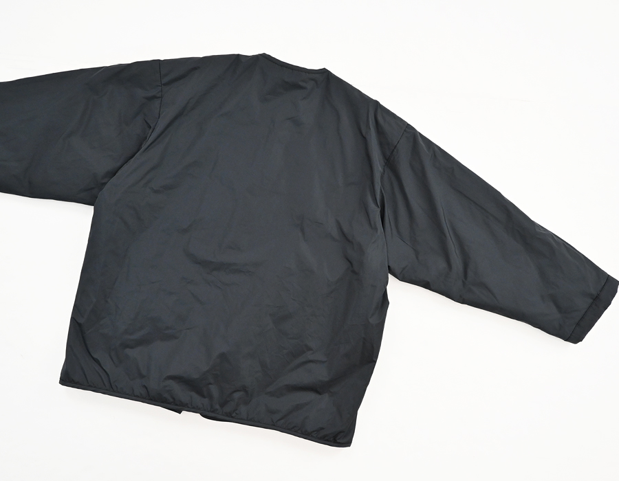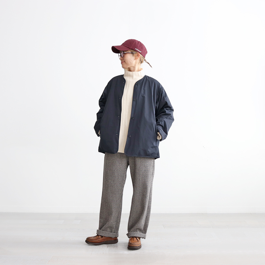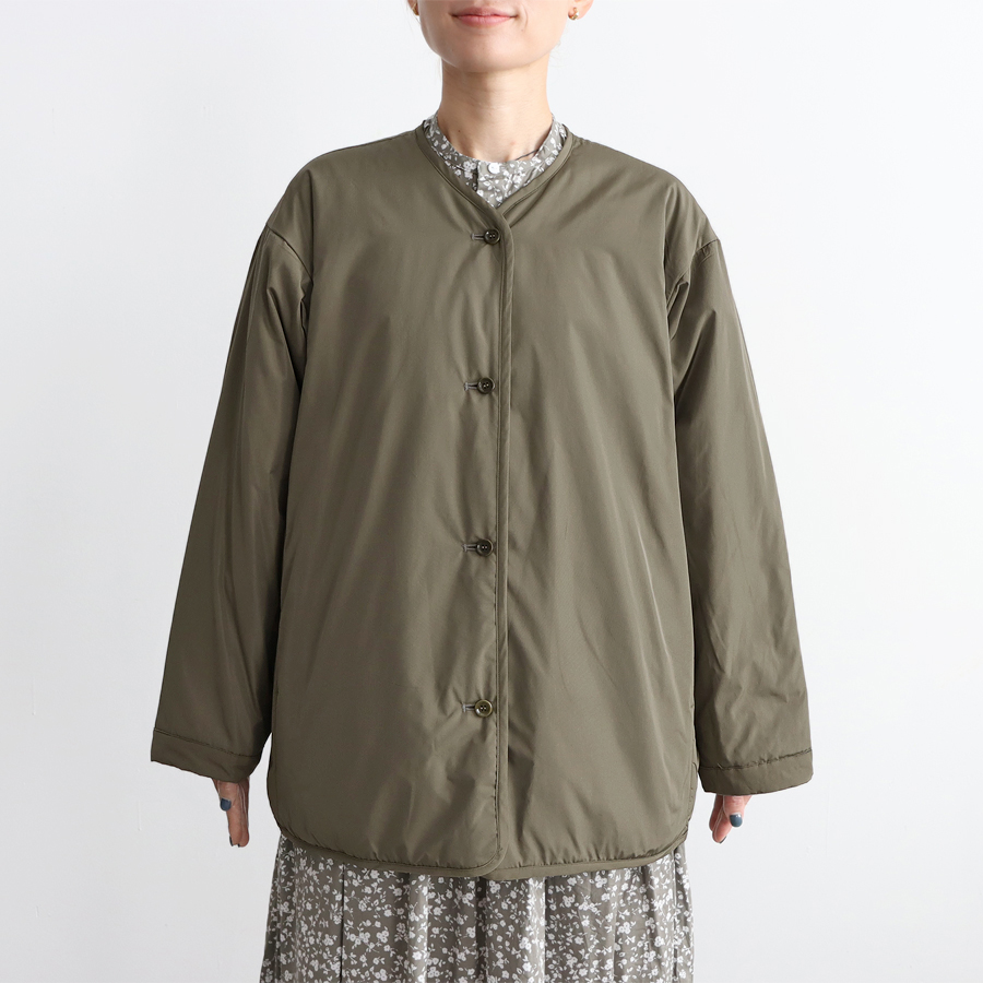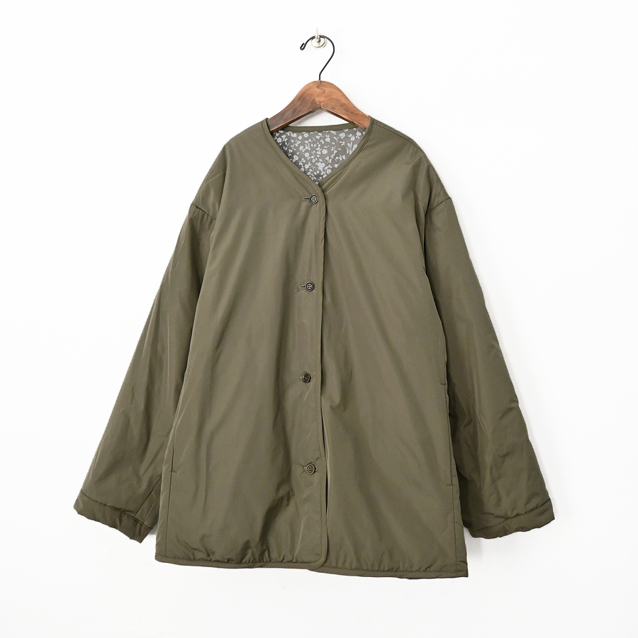 こちらは、小花柄とシックなソリッドカラーとのリバーシブルジャケット。ヴィンテージライクな小花柄の生地はコットンストレッチクロス。 滑らかで光沢感のある生地で、程よくハリ感のある柔らかな肌触りが特徴です。ソリッド面は、ほんのり光沢感のあるポリエステル生地。ボリュームを抑えた中綿入りで、着ぶくれ感もなく、さらには、軽くてラフな着心地です。アームも広めで全体的にはゆったりとしたサイズ感になっています。小花柄面もソリッド面も、どちらにも両サイドにはポケットが付いています。