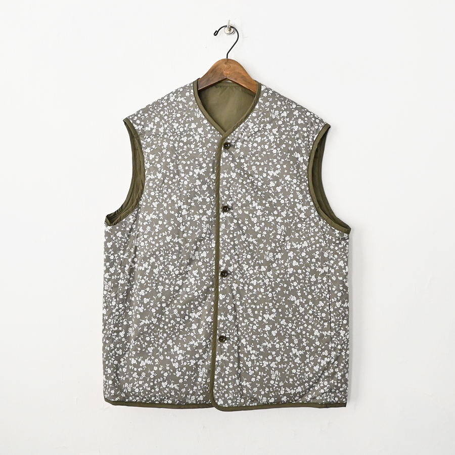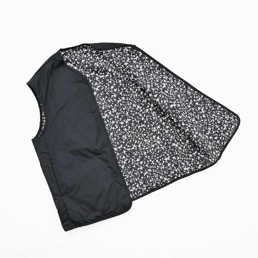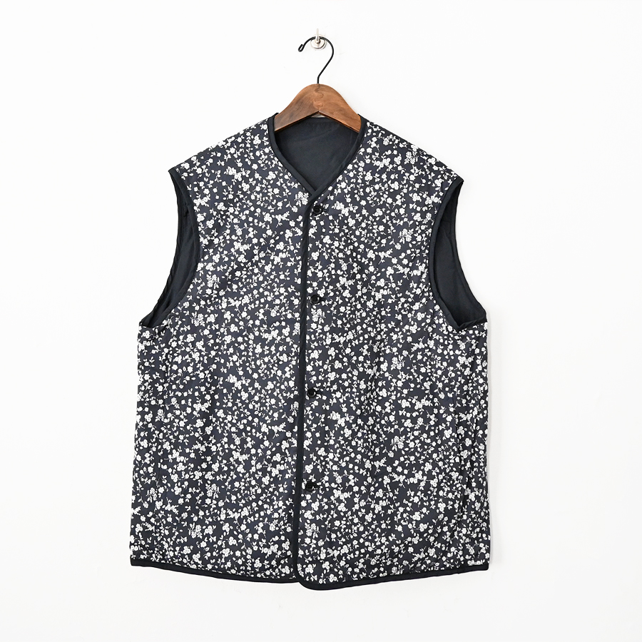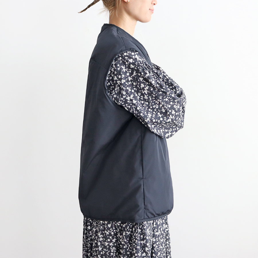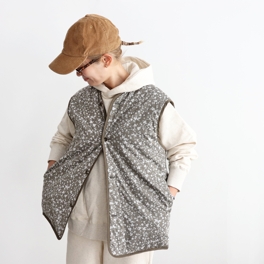 こちらは、小花柄とシックなソリッドカラーとのリバーシブルベスト。ヴィンテージライクな小花柄の生地はコットンストレッチクロス。 滑らかで光沢感のある生地で、程よくハリ感のある柔らかな肌触りが特徴です。ソリッド面は、ほんのり光沢感のあるポリエステル生地。ボリュームを抑えた中綿入りで、着ぶくれ感もなく、さらには、軽くてラフな着心地です。全体的に適度にゆったりとしたサイズ感になっています。小花柄面もソリッド面も、どちらにも両サイドにはポケットが付いています。