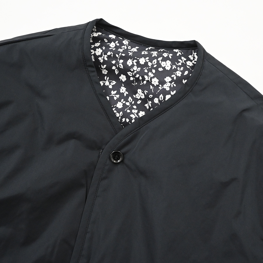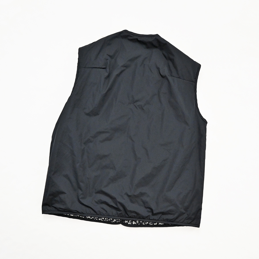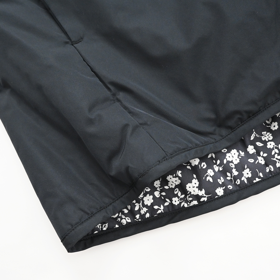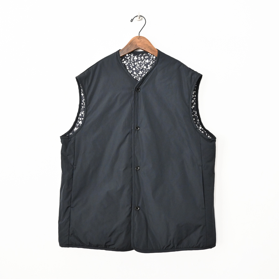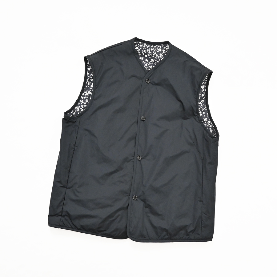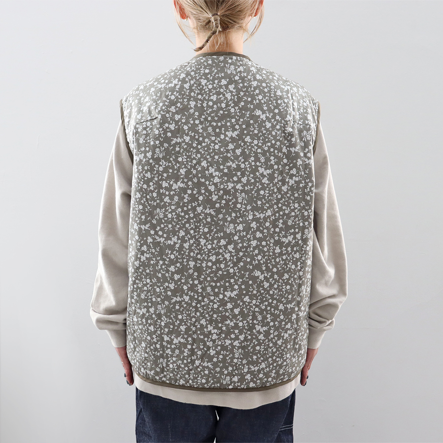 こちらは、小花柄とシックなソリッドカラーとのリバーシブルベスト。ヴィンテージライクな小花柄の生地はコットンストレッチクロス。 滑らかで光沢感のある生地で、程よくハリ感のある柔らかな肌触りが特徴です。ソリッド面は、ほんのり光沢感のあるポリエステル生地。ボリュームを抑えた中綿入りで、着ぶくれ感もなく、さらには、軽くてラフな着心地です。全体的に適度にゆったりとしたサイズ感になっています。小花柄面もソリッド面も、どちらにも両サイドにはポケットが付いています。