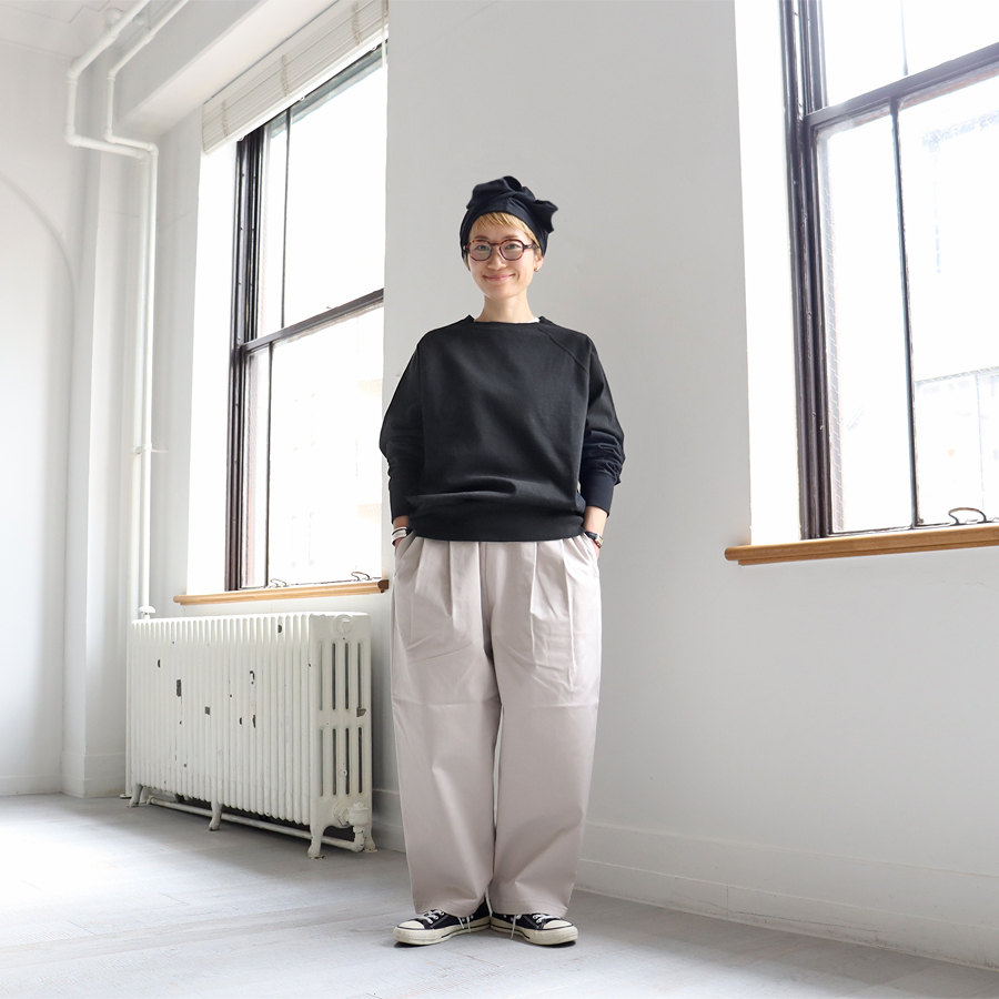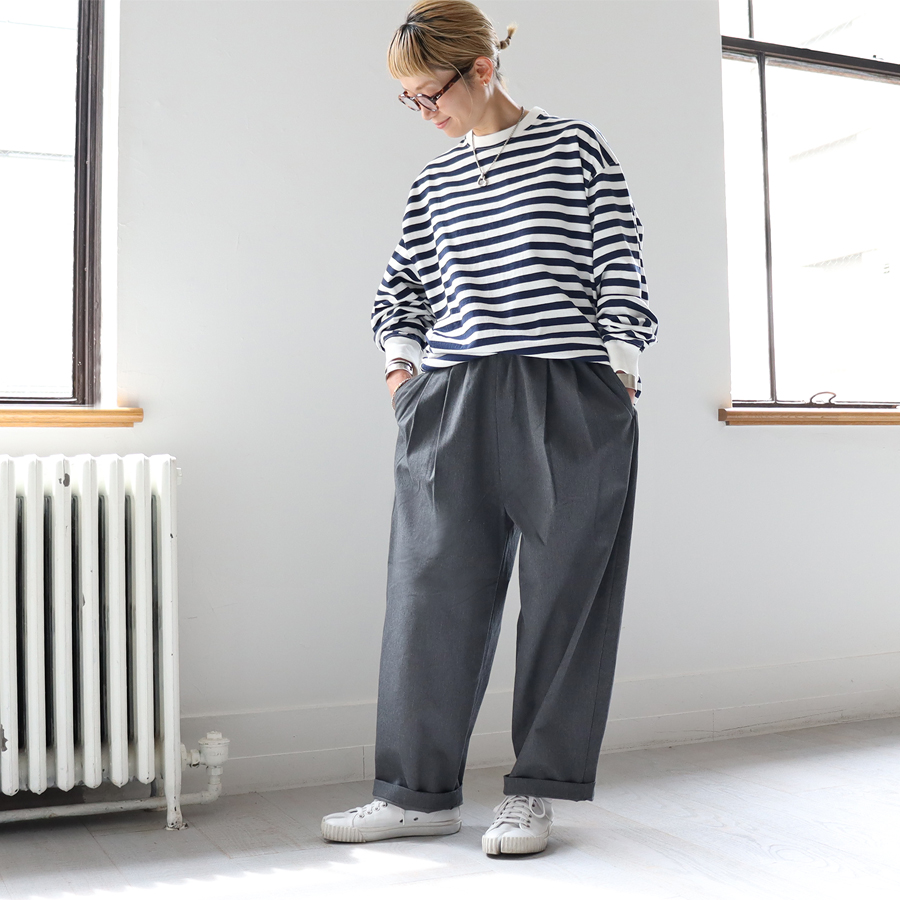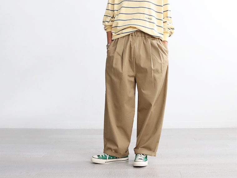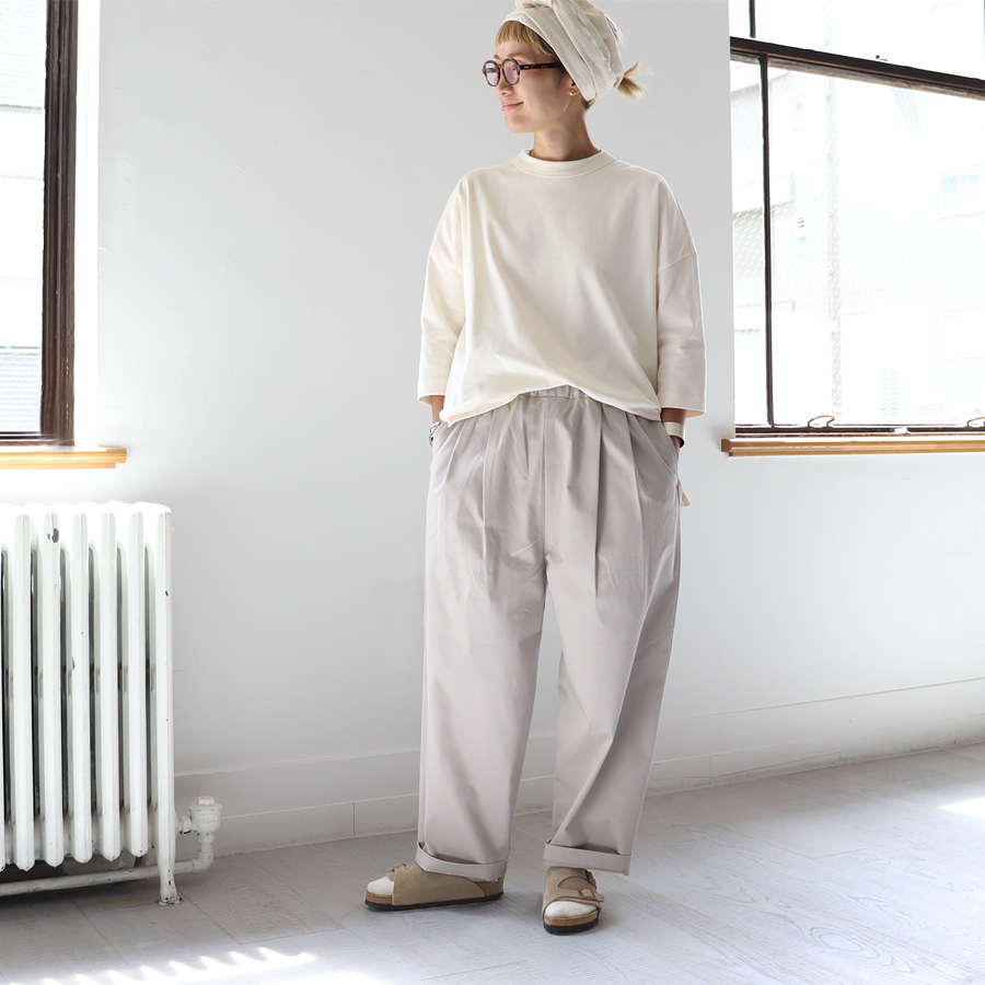 フロントには2タックが入っており、ボリュームがありながらも、控えめなコクーン型でスッキリとした印象のシルエットです。バランスがとりやすく幅広いスタイリングにマッチするパンツ。このボリューム感がサマになりますね。