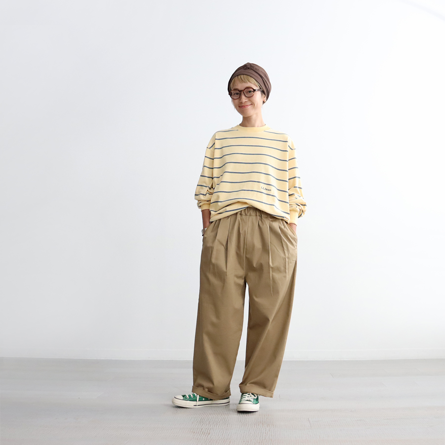 生地は、薄くも厚くもない丁度良い生地厚と、程よいハリのあるストレッチチノ。オールシーズン穿いて頂けます。ウエストはゴムと紐のイージー仕様。股上も深めでラフな穿き心地。