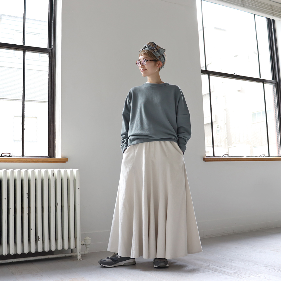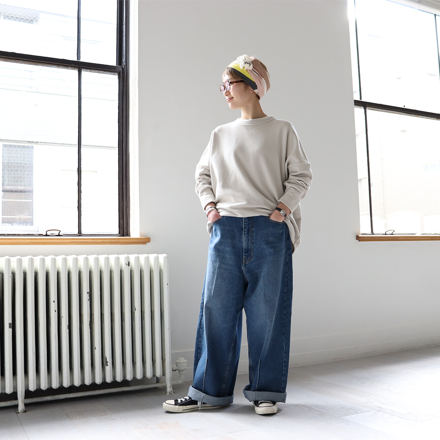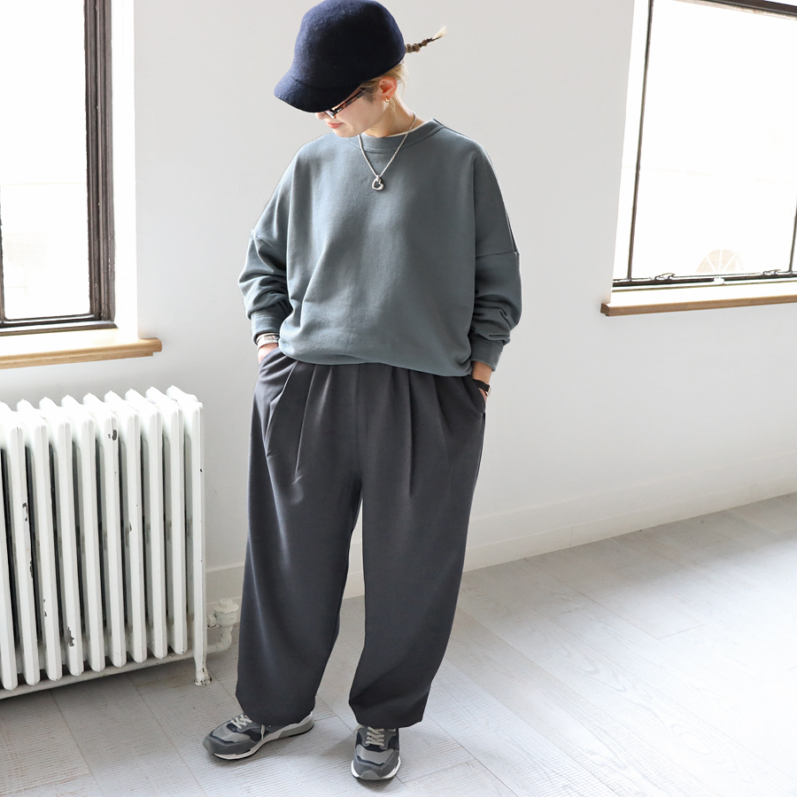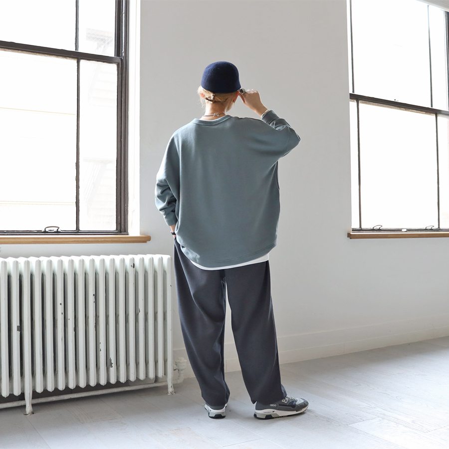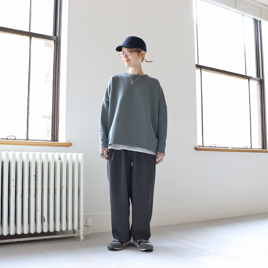 こちらは、ワイドシルエットのプルオーバー。生地はビンテージ感ある裏毛。程よい肉感がありながらもやわらかでドライな風合いのスウェット地といった生地感です。裾に向かってやや細くなった丸みのあるシルエット。肩の落ちたドロップショルダーにゆったりとしたサイズでトレンド感ある一枚に仕上げています。カジュアル感を抑えたトラバイユマニュアルらしいトップス。シンプルながらもデザイン性が効いていますのでさらっと着るだけでサマになる一枚です。