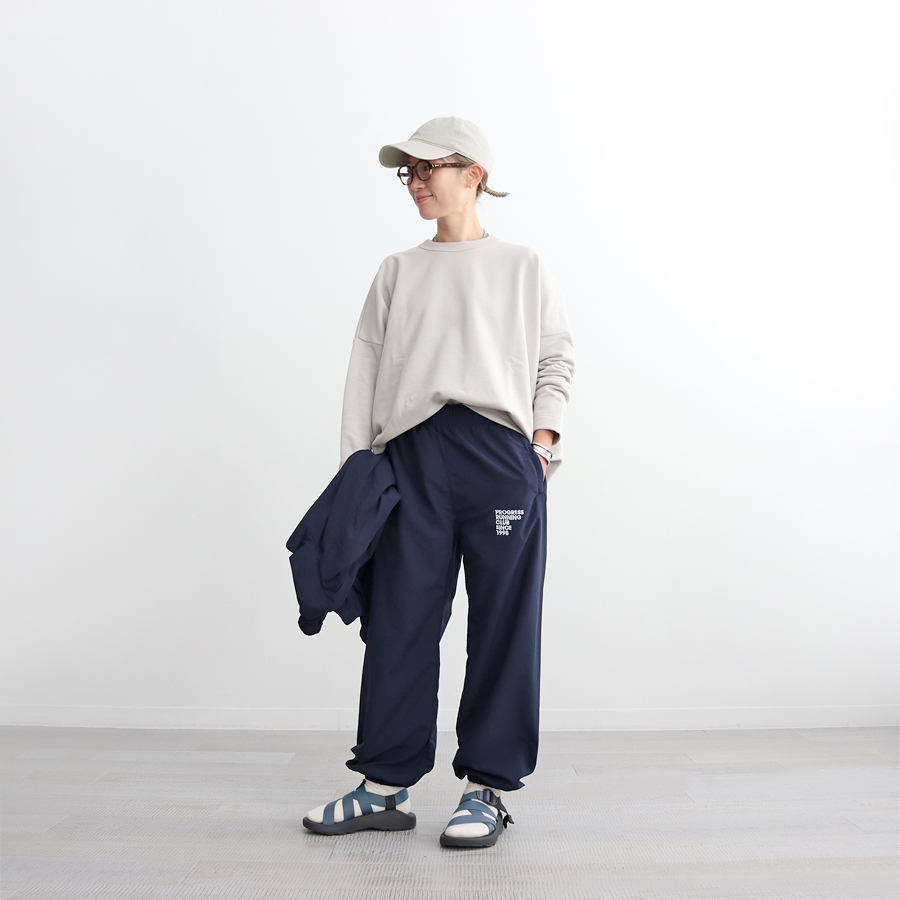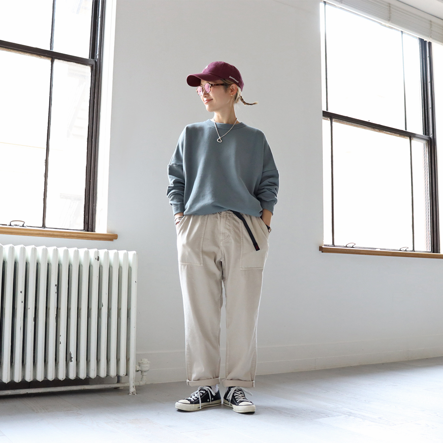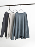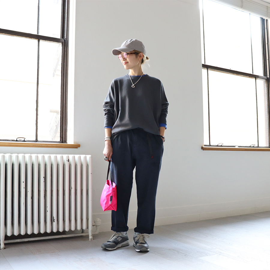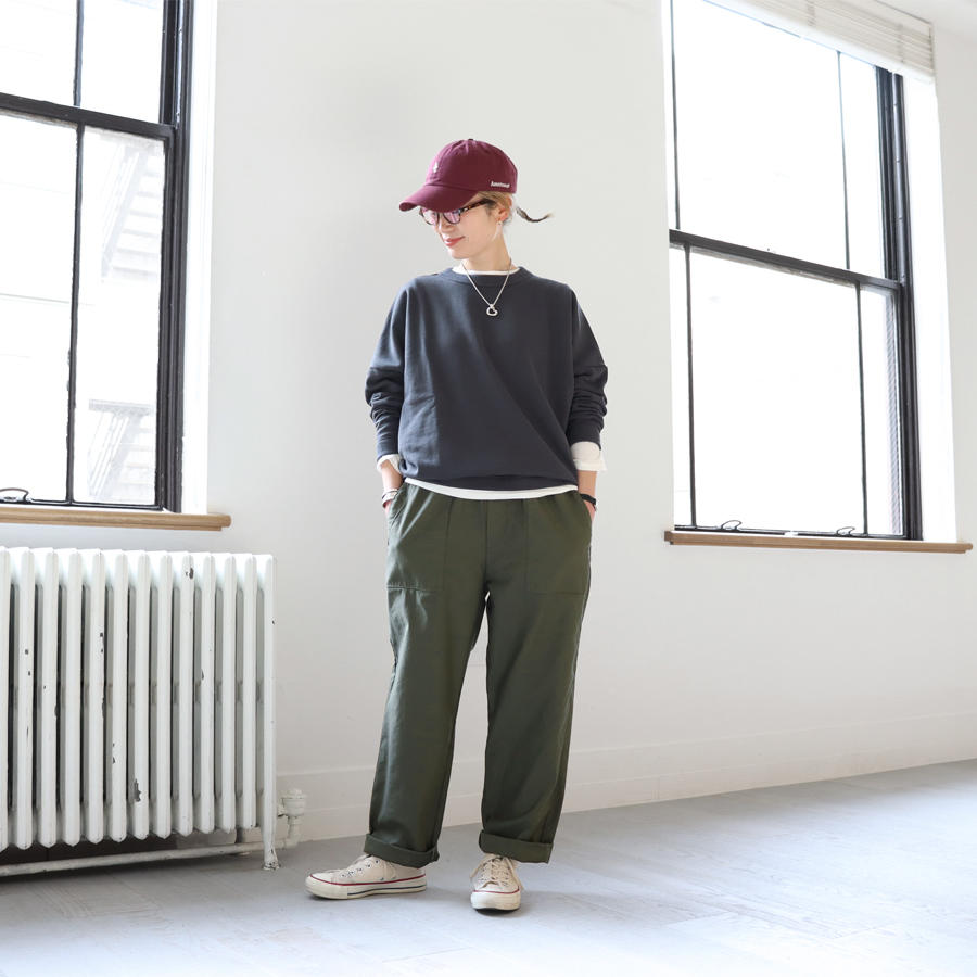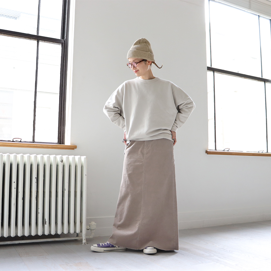 こちらは、ワイドシルエットのプルオーバー。生地はビンテージ感ある裏毛。程よい肉感がありながらもやわらかでドライな風合いのスウェット地といった生地感です。裾に向かってやや細くなった丸みのあるシルエット。肩の落ちたドロップショルダーにゆったりとしたサイズでトレンド感ある一枚に仕上げています。カジュアル感を抑えたトラバイユマニュアルらしいトップス。シンプルながらもデザイン性が効いていますのでさらっと着るだけでサマになる一枚です。
