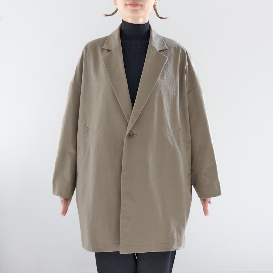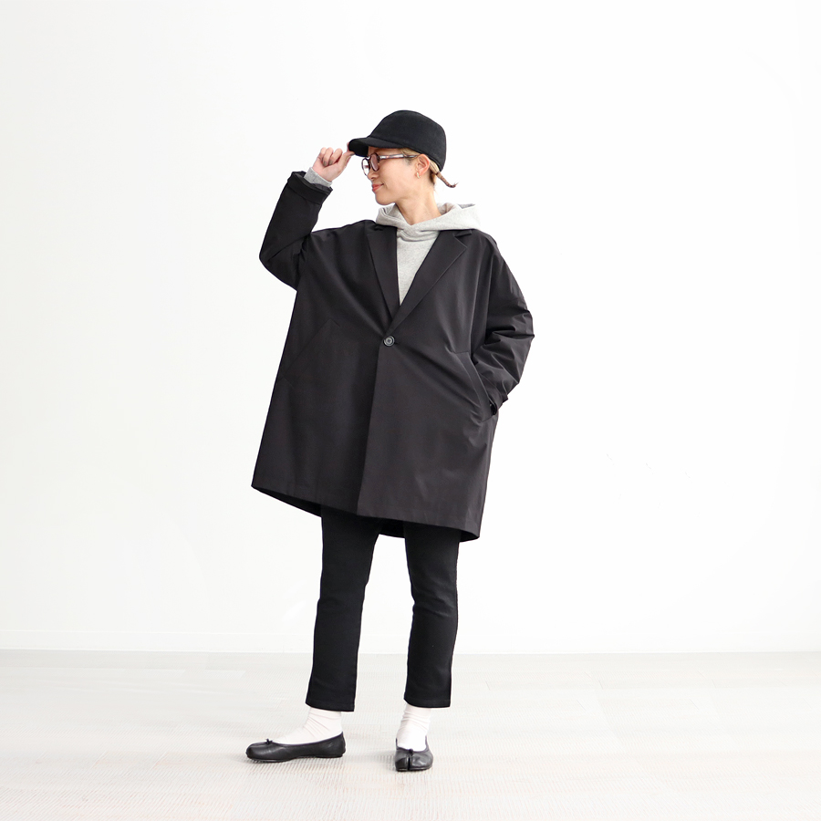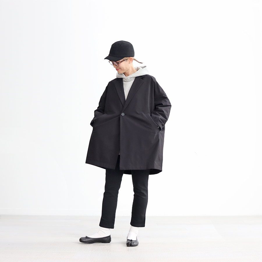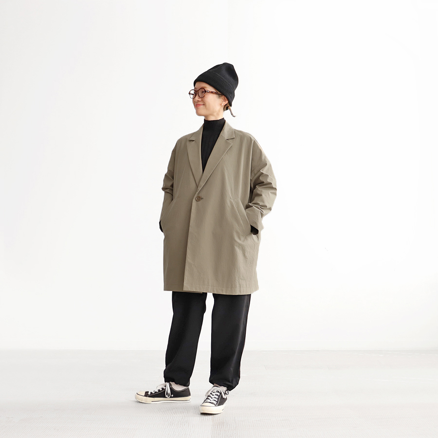 サラッとラフな雰囲気で羽織ったり、キレイめな着こなしも楽しめるハーフコートです。