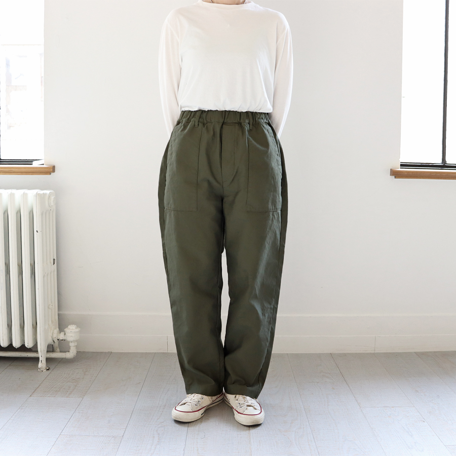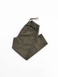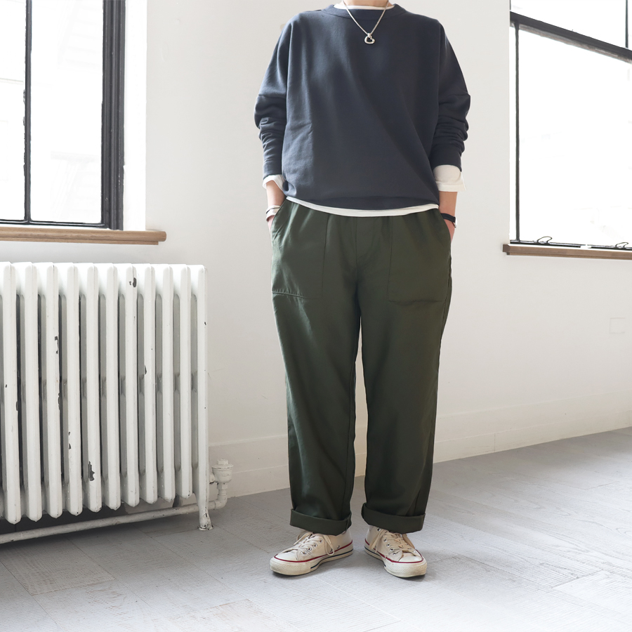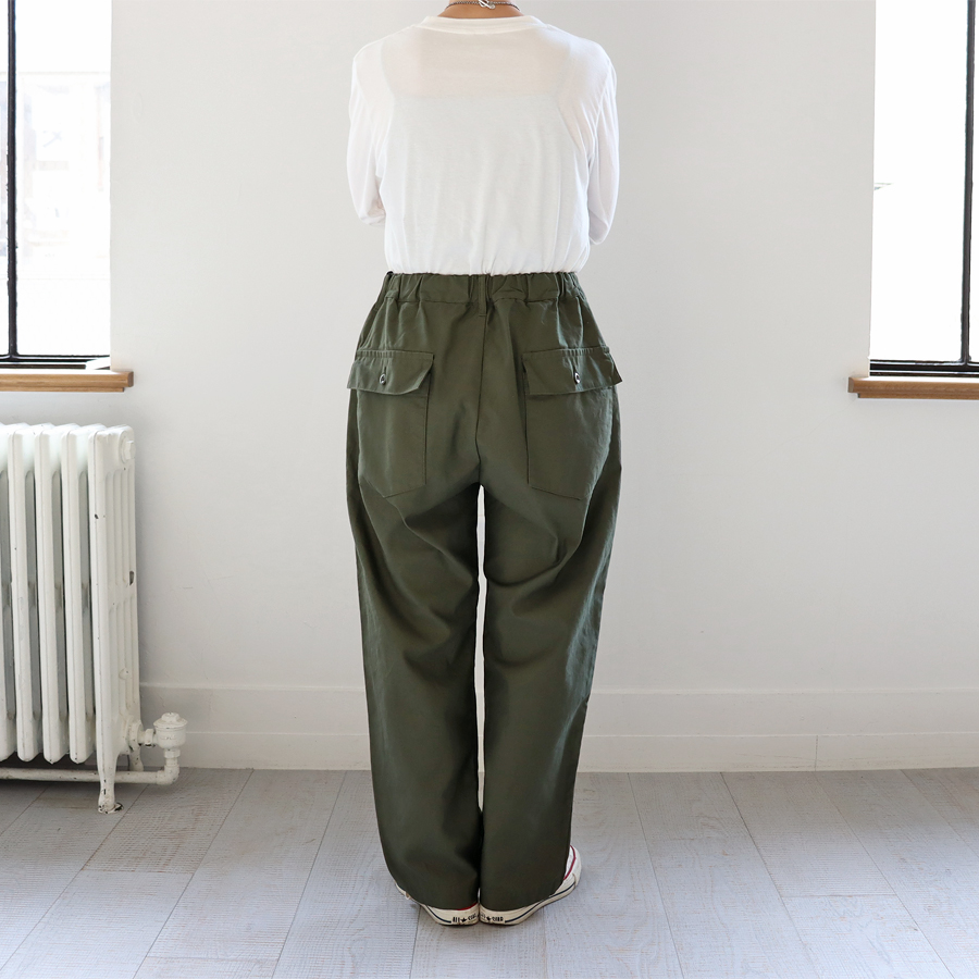 こちらは、ファティーグパンツのイージーパンツ。一般的なファティーグパンツを "TRAVAIL MANUEL" らしくアレンジ。ウエストはゴムと紐のイージータイプでラクな仕様。裾に向かってやや細くテーパードが入っている為、すっきりとした印象です。生地は、バックサテン地。薄くも厚手なもない程よい生地感でオールシーズン穿いて頂けます。一般的なファティーグパンツ同様、着回しの効くパンツです。