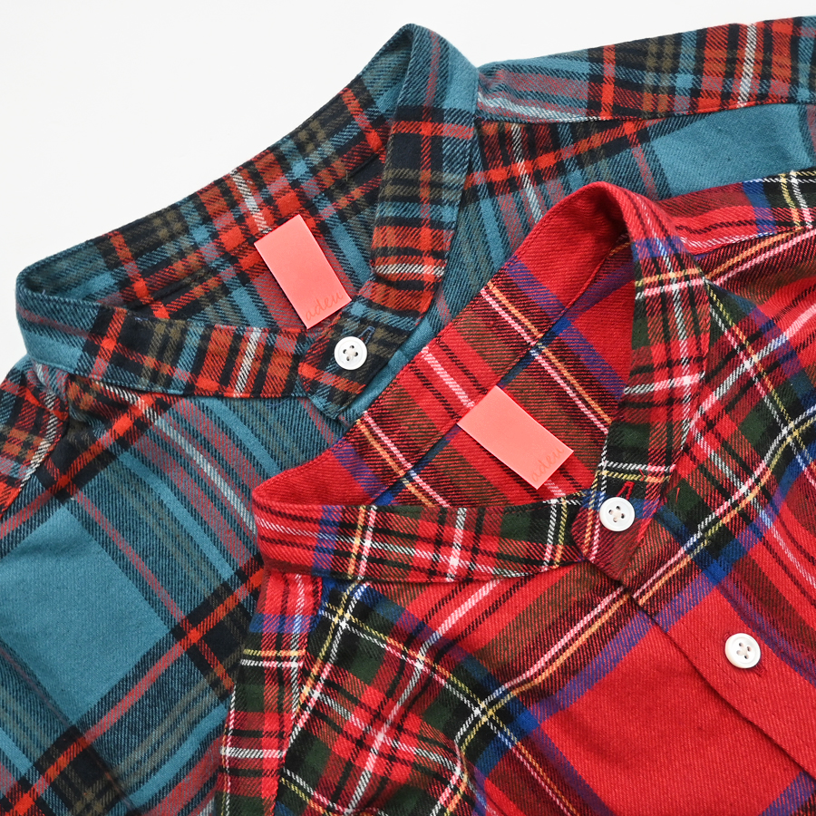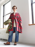 こちらは、クラシカルで鮮やかな色合いのタータンチェックが目を惹くビッグシャツ。生地はコットンネル素材で起毛がかった季節感ある風合いです。ゆったりとした身幅にヒップの隠れるロング丈は体型をカバーして、コーディネイトの幅を広げてくれます。そのゆったり身幅に対して、お袖を9分袖にすることで、ルーズになりすぎないシルエットを目指しました。すっきりとしたスタンドカラーに両サイドには便利なポケットを付けています。