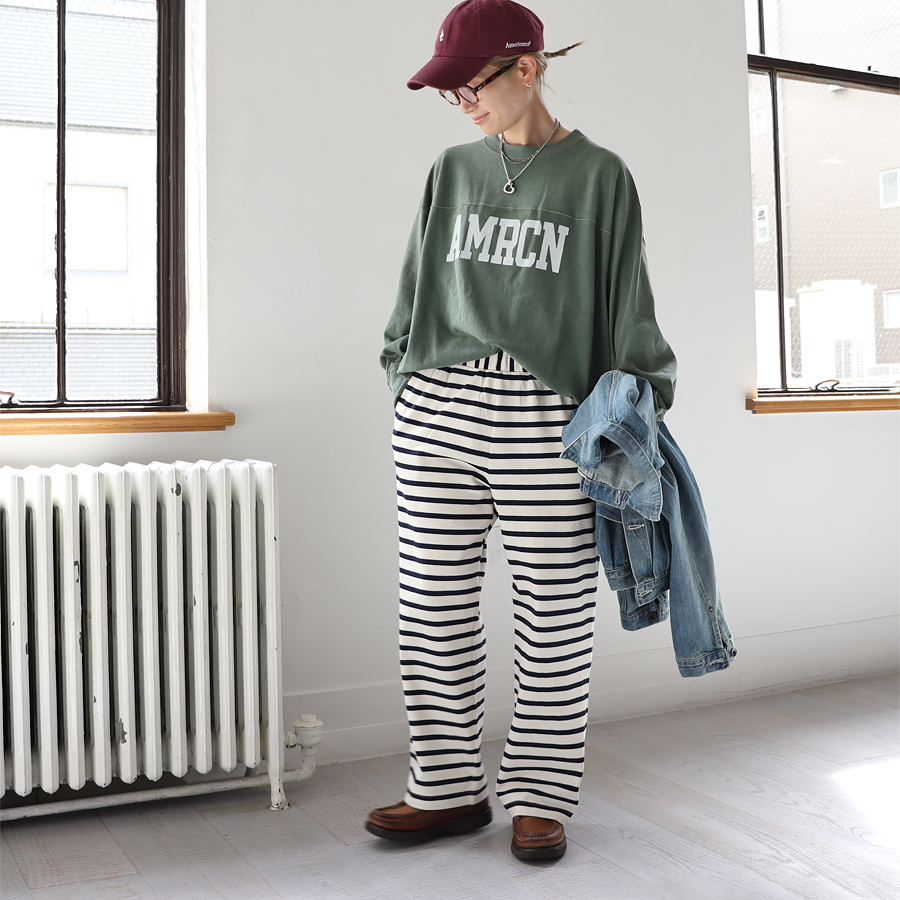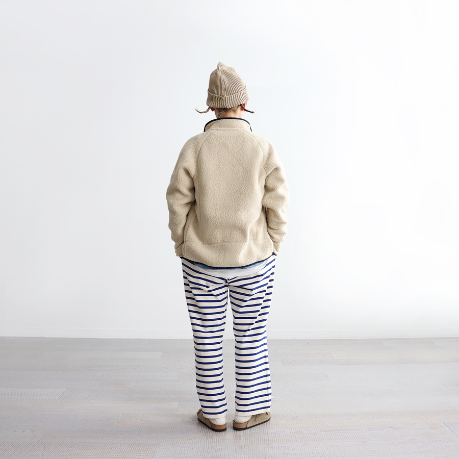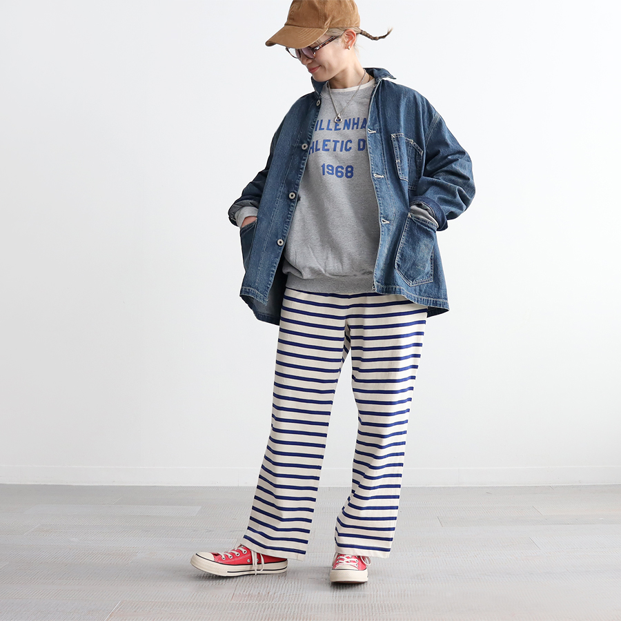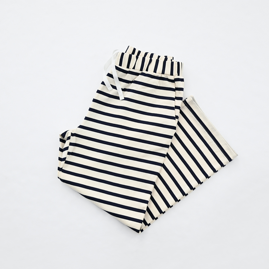 こちらは、ボーダー柄が爽やかなイージーパンツ。生地は厚くも薄すぎでもない適度な生地厚のコットン天竺。冬は軽い印象になりますが、あえてニットやフリースなどとコーデしても良いかと ! そんな思いを込めてロングシーズン穿けることを目指しました。ウエストはゴムと紐のイージー仕様。股上は普通、裾に向かってすとんとしたストレート気味のシルエットです。両サイドには便利なスラッシュポケット。ベーシックなボーダーピッチがカジュアルコーディネイトに映えそうです! 締め付け感のないラフな穿き心地です。
