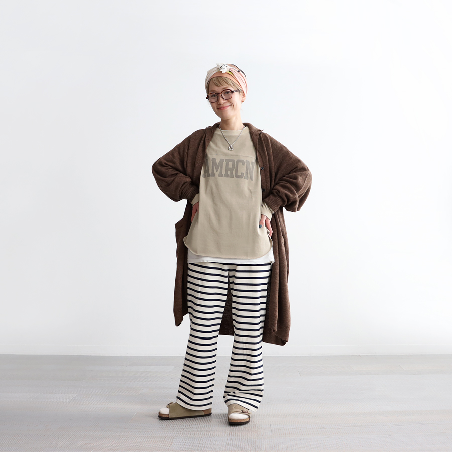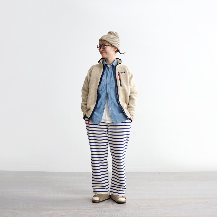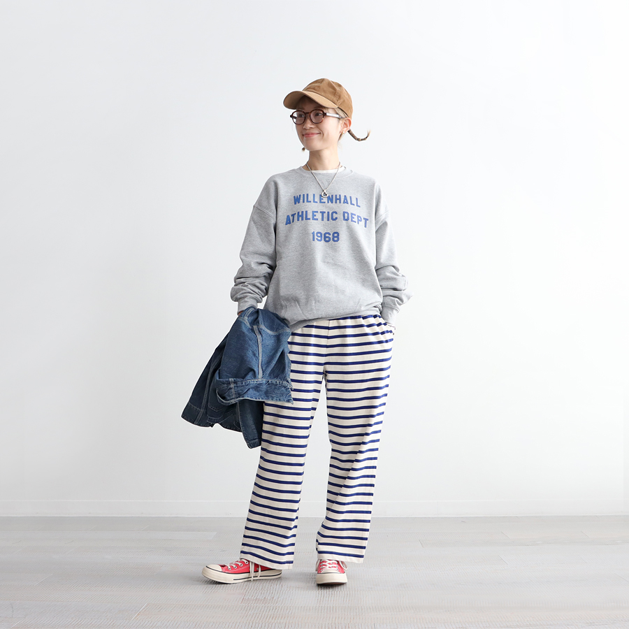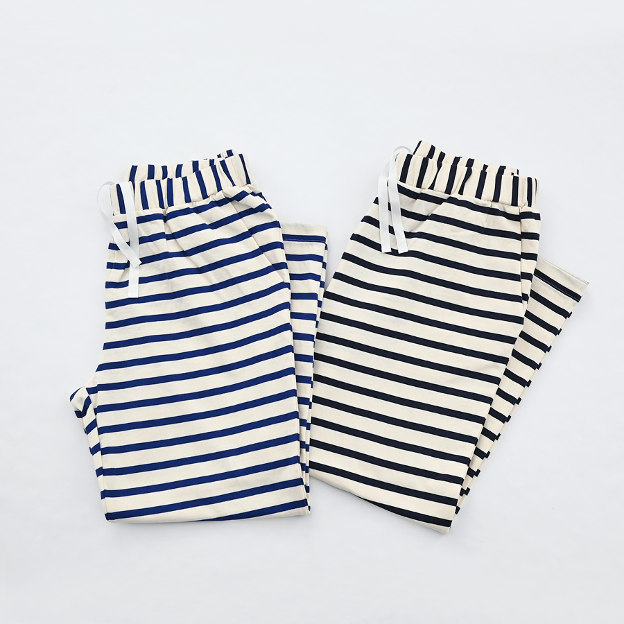 こちらは、ボーダー柄が爽やかなイージーパンツ。生地は厚くも薄すぎでもない適度な生地厚のコットン天竺。冬は軽い印象になりますが、あえてニットやフリースなどとコーデしても良いかと ! そんな思いを込めてロングシーズン穿けることを目指しました。ウエストはゴムと紐のイージー仕様。股上は普通、裾に向かってすとんとしたストレート気味のシルエットです。両サイドには便利なスラッシュポケット。ベーシックなボーダーピッチがカジュアルコーディネイトに映えそうです! 締め付け感のないラフな穿き心地です。