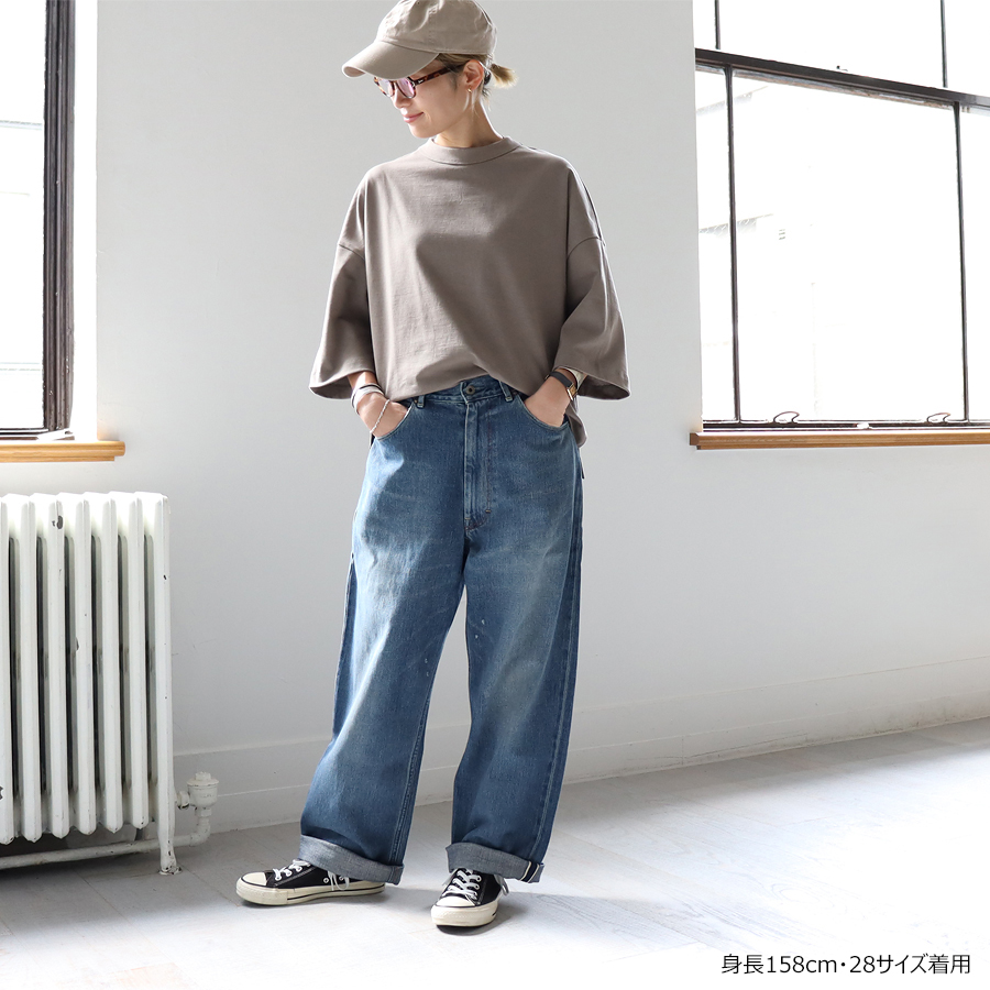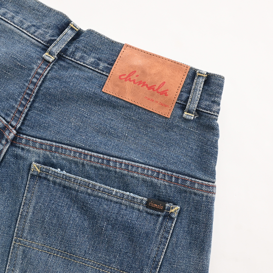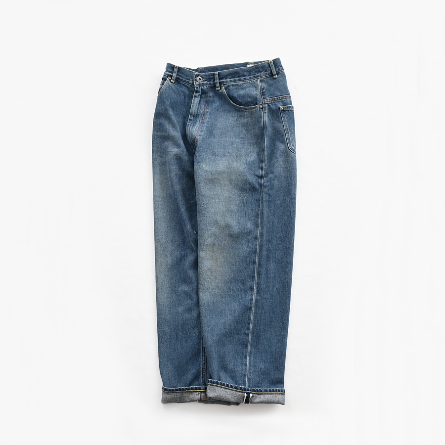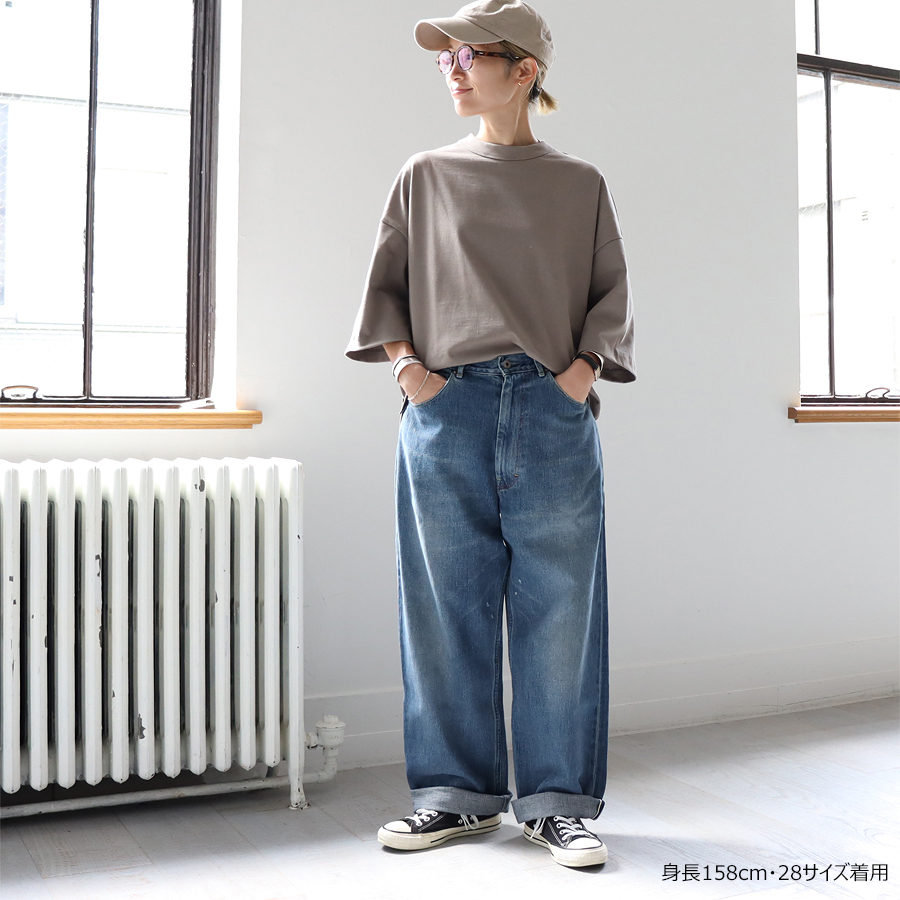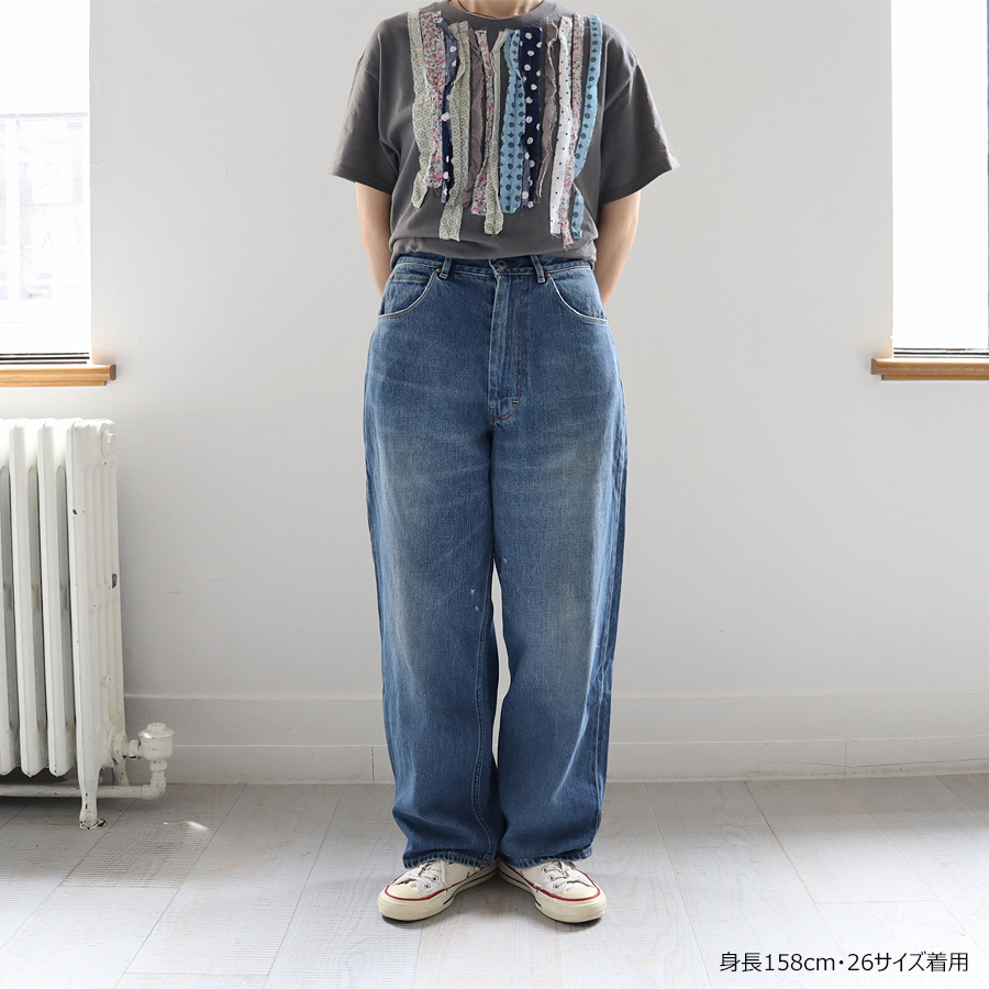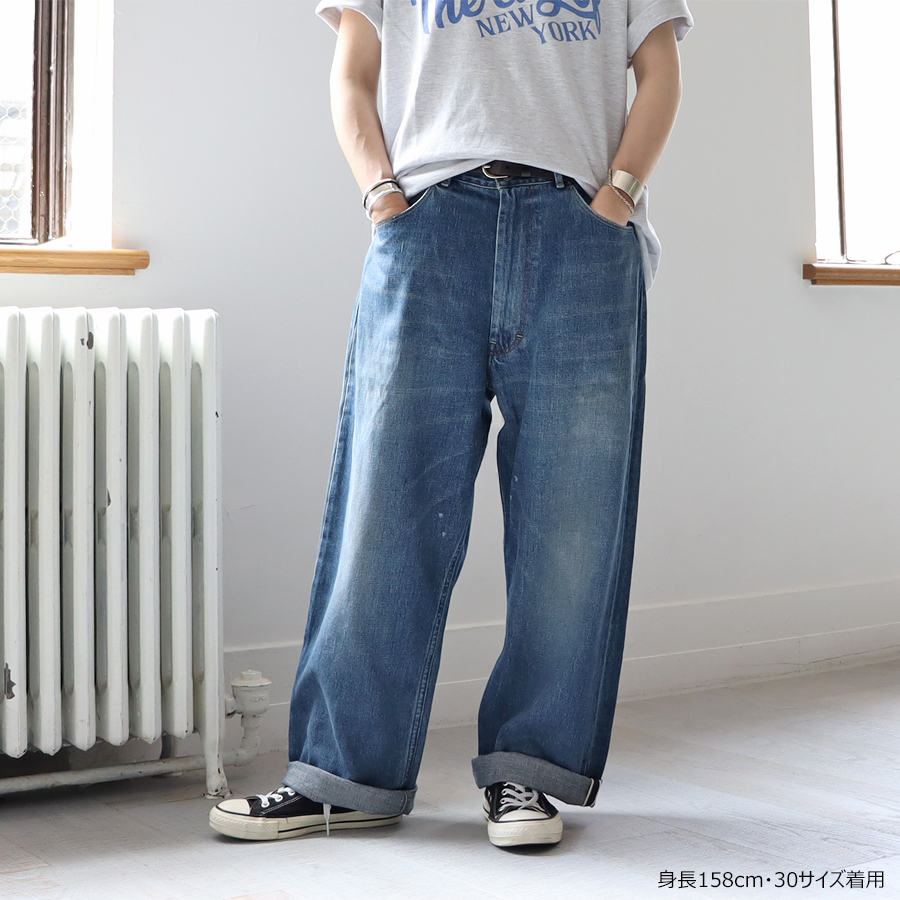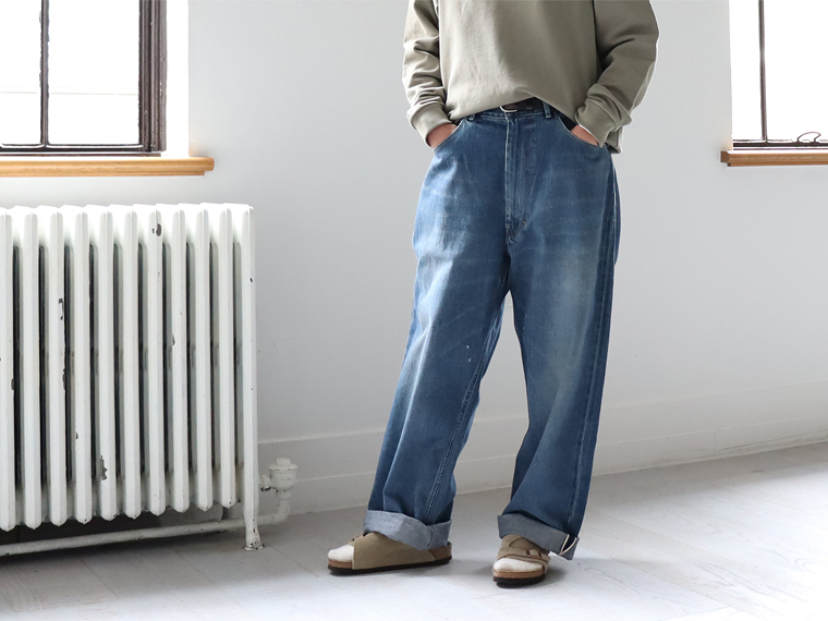 こちらは、ランチパンツ。ハイウエストでウエスト回りがすっきりめでやや太めのストレートシルエットです。汚れ、色あせ、洗い、傷、穴あき、ほつれ、補修・・・。ダメージの完成度は高く、チマラが表現するリアルすぎる加工が魅力的。中間色でオールシーズン合わせやすく、幅広いスタイリングにマッチするシルエットと色合いです。