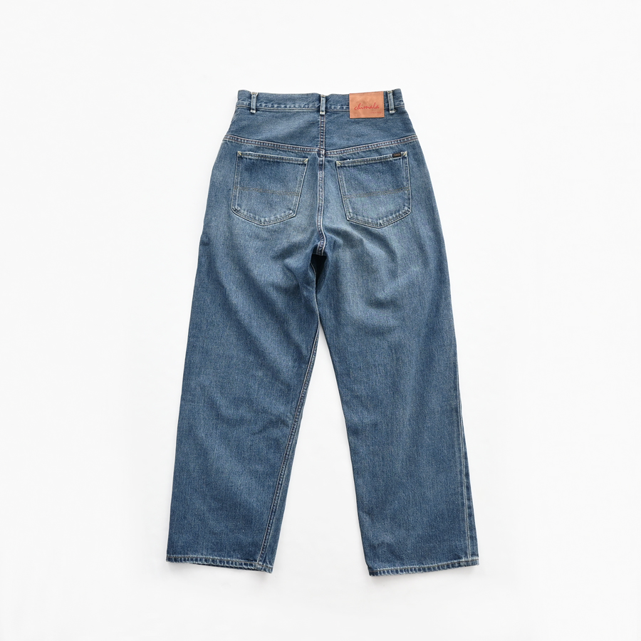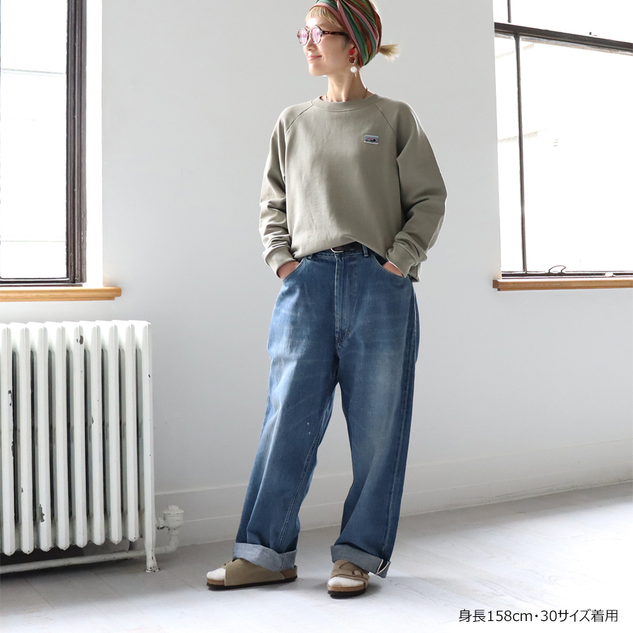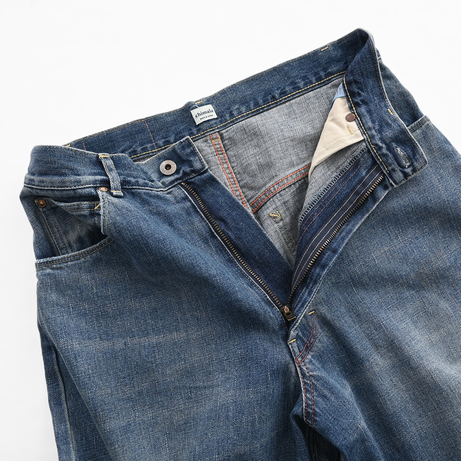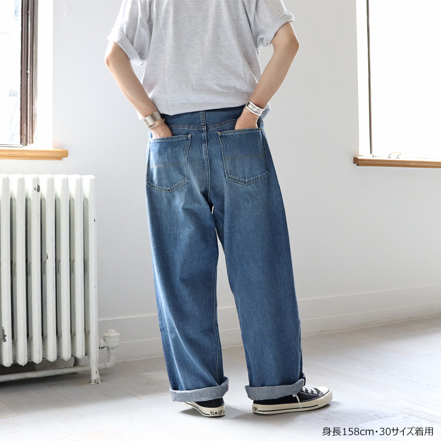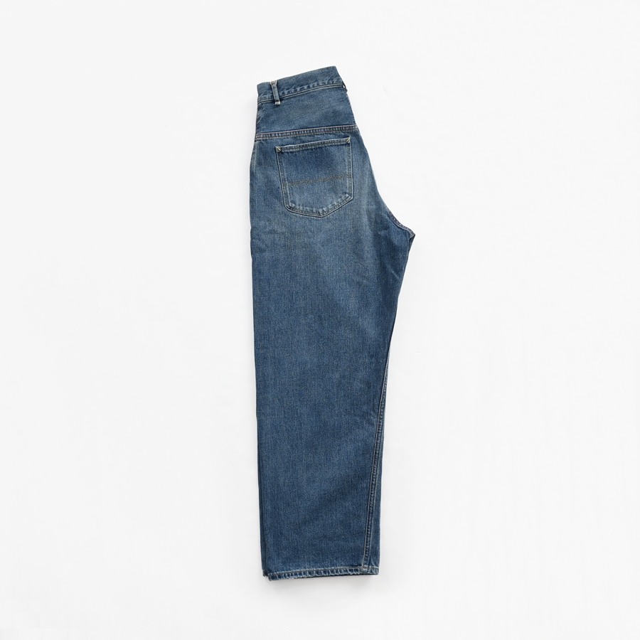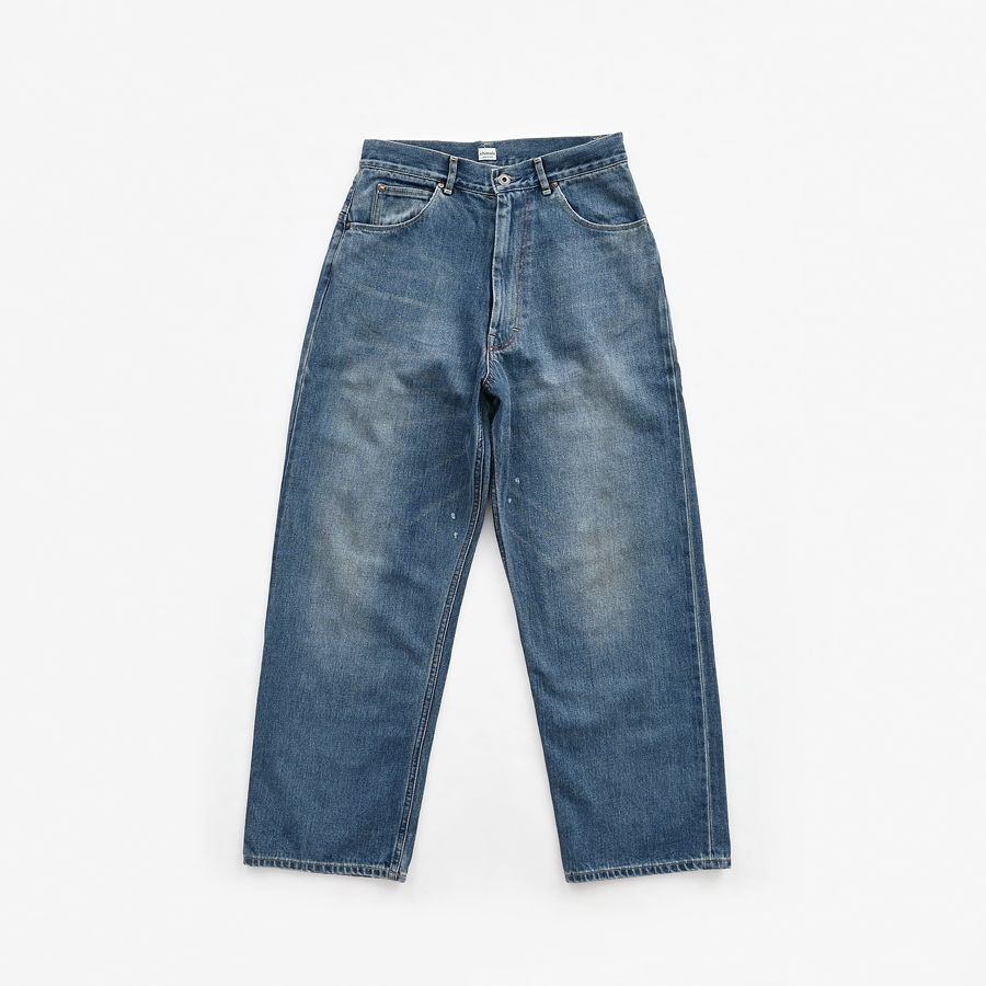 こちらは、ランチパンツ。ハイウエストでウエスト回りがすっきりめでやや太めのストレートシルエットです。汚れ、色あせ、洗い、傷、穴あき、ほつれ、補修・・・。ダメージの完成度は高く、チマラが表現するリアルすぎる加工が魅力的。中間色でオールシーズン合わせやすく、幅広いスタイリングにマッチするシルエットと色合いです。