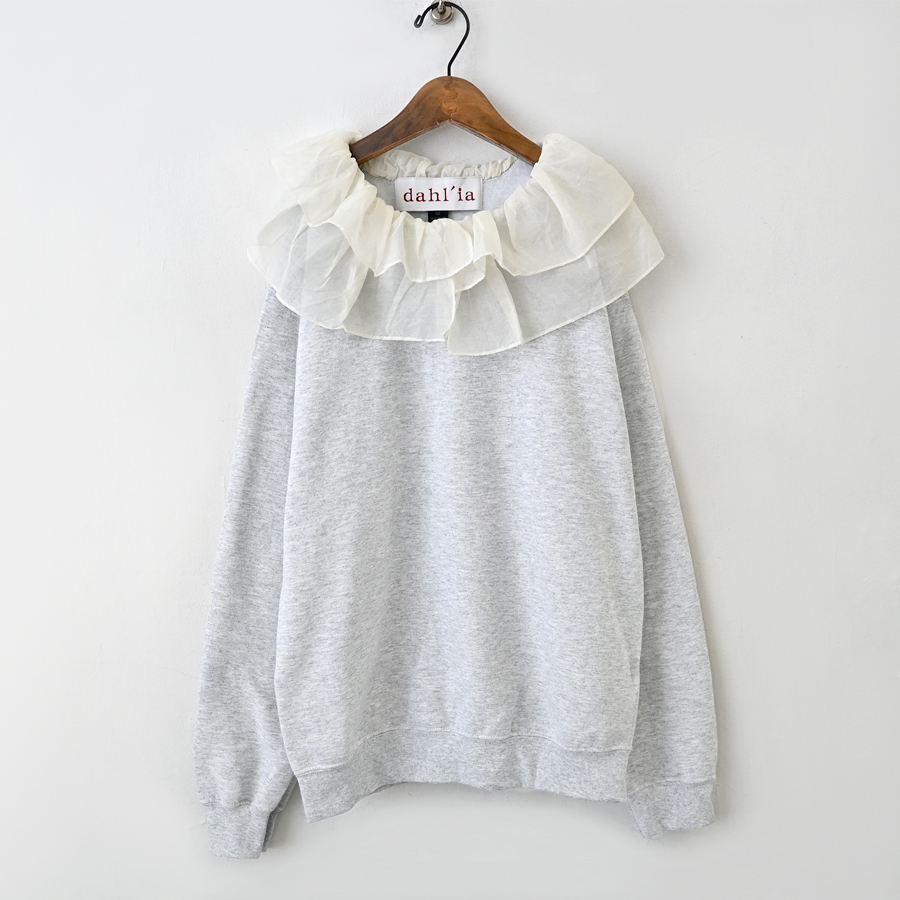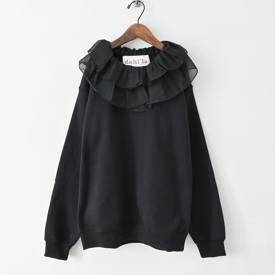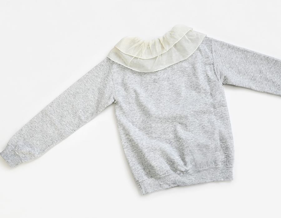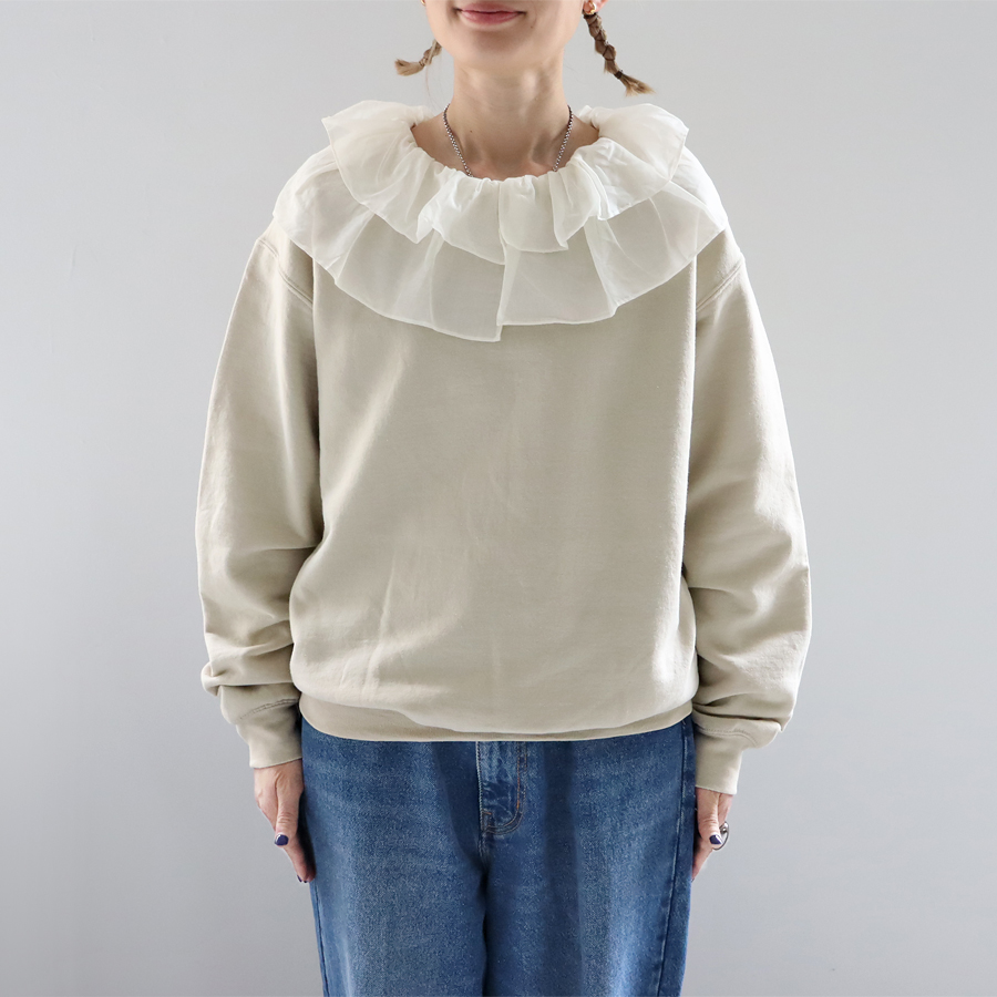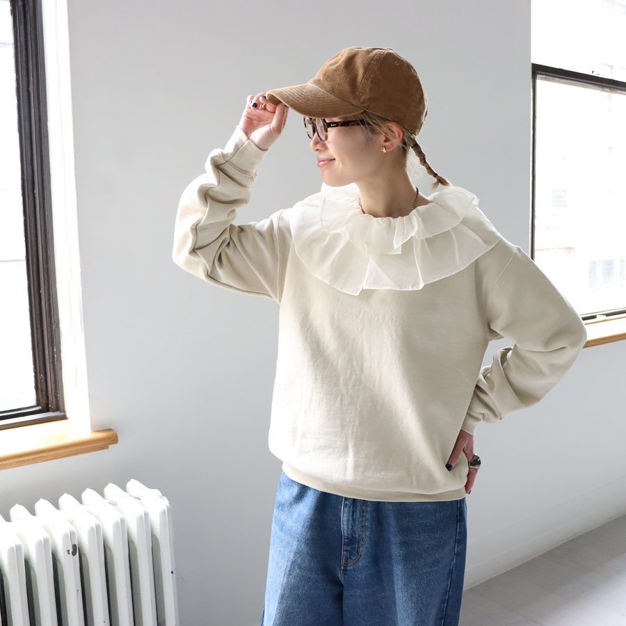 こちらは、プレーンなスウェットに2段フリルの襟を施したリメイクアイテム。ボディはカナダ生まれアメリカ育ちの"GILDAN/ギルダン"メンズSサイズのスウェット。適度な生地厚で弾力のある裏起毛です。裾のフリルは透け感と適度なハリのあるコットン地。アメリカンカジュアルな無骨なクルースウェットと女子なフリルを組み合わせた個性的なアイテムに仕上がっています。