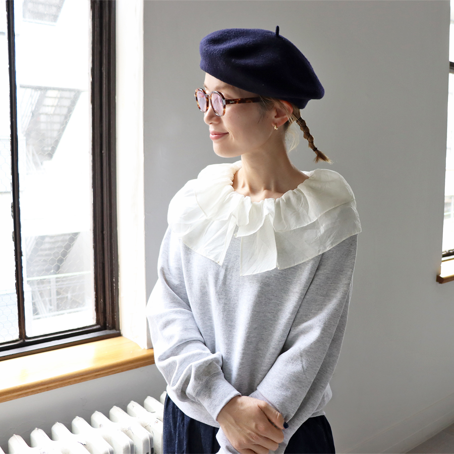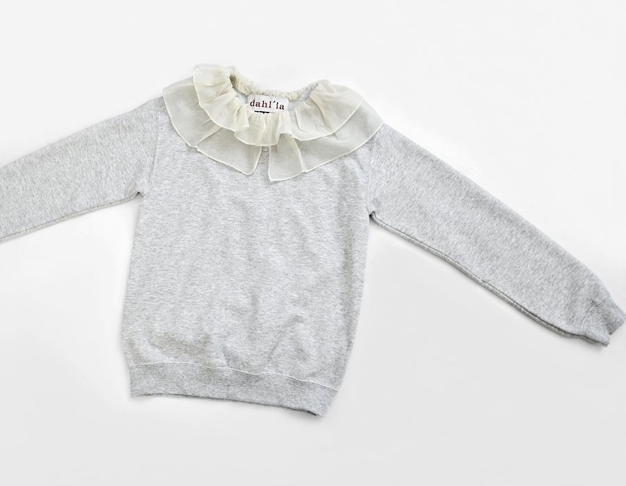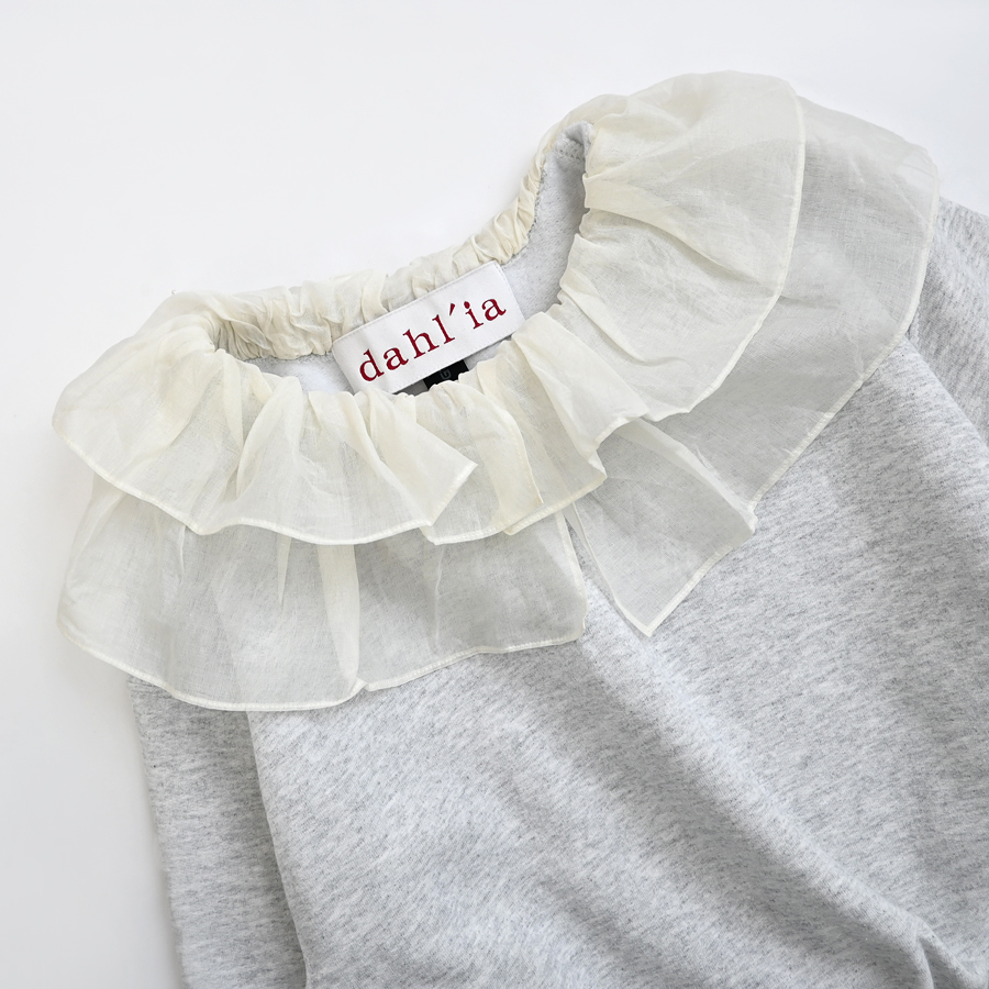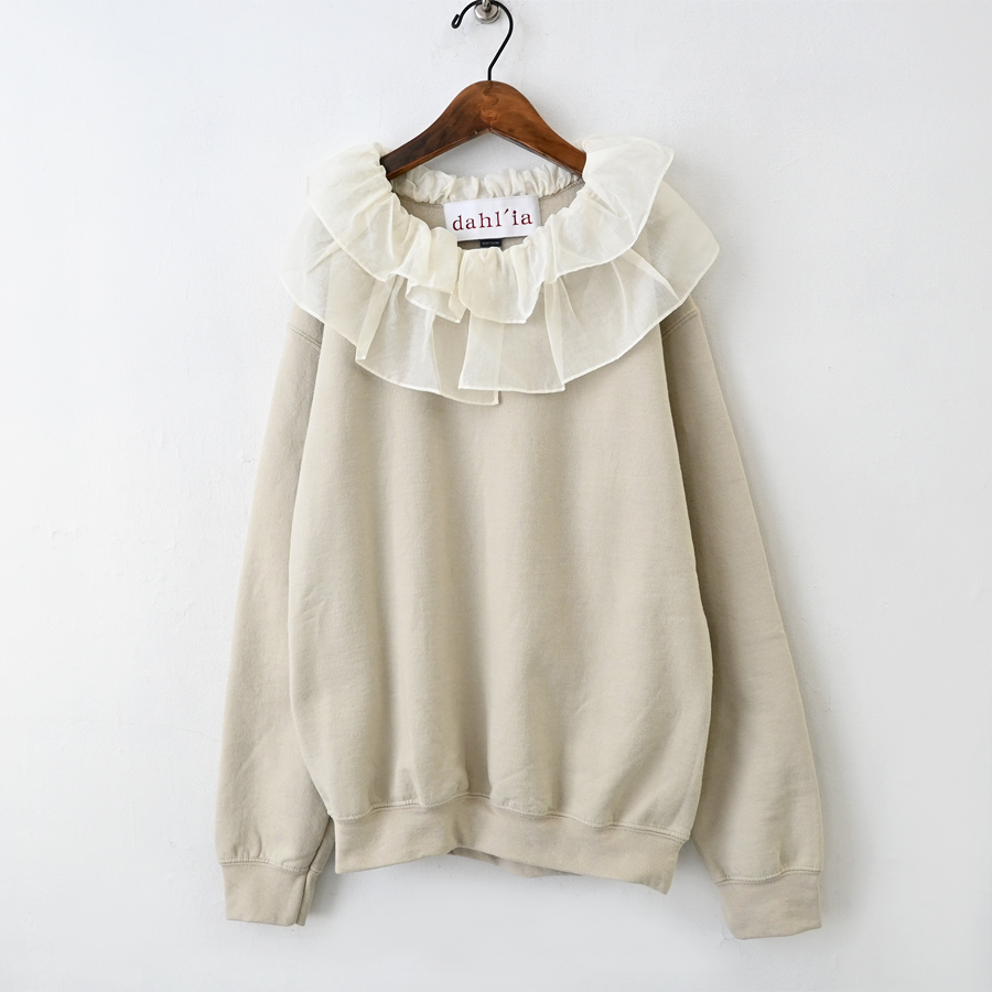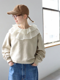 こちらは、プレーンなスウェットに2段フリルの襟を施したリメイクアイテム。ボディはカナダ生まれアメリカ育ちの"GILDAN/ギルダン"メンズSサイズのスウェット。適度な生地厚で弾力のある裏起毛です。裾のフリルは透け感と適度なハリのあるコットン地。アメリカンカジュアルな無骨なクルースウェットと女子なフリルを組み合わせた個性的なアイテムに仕上がっています。