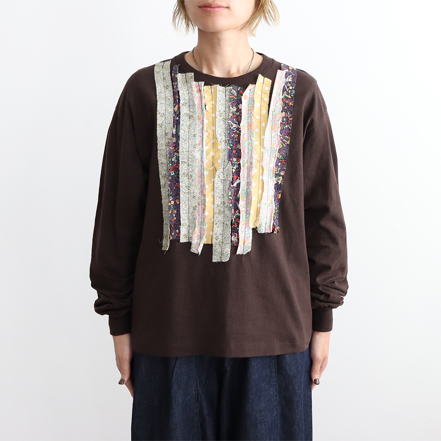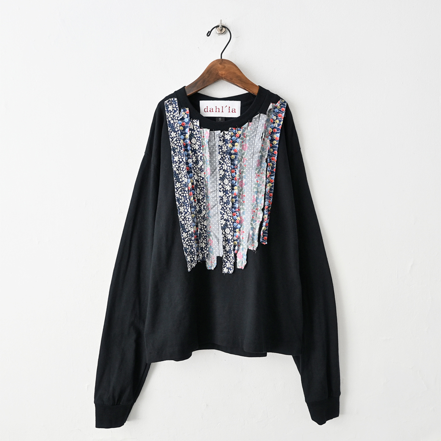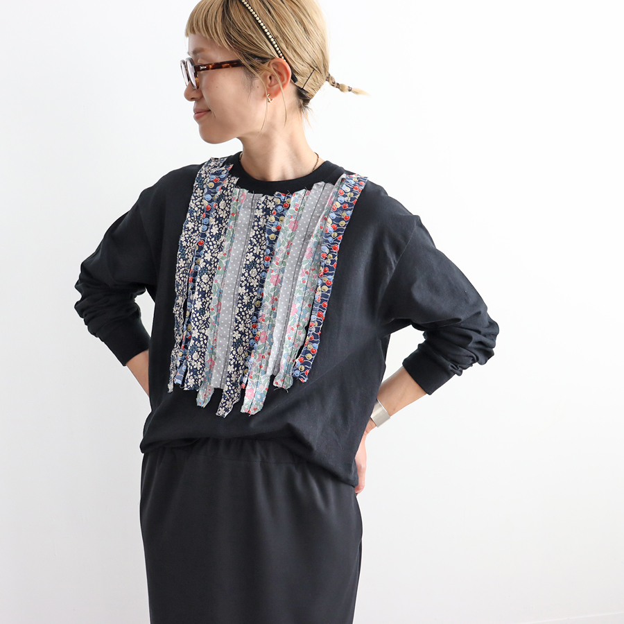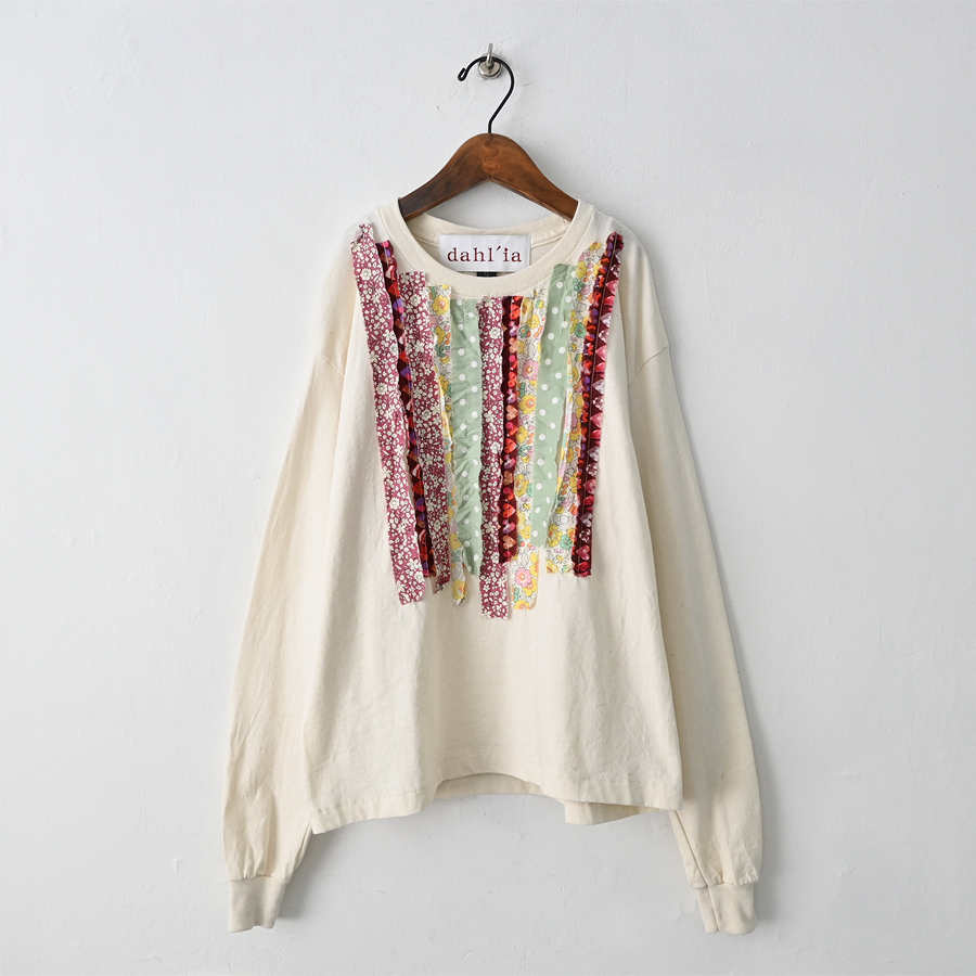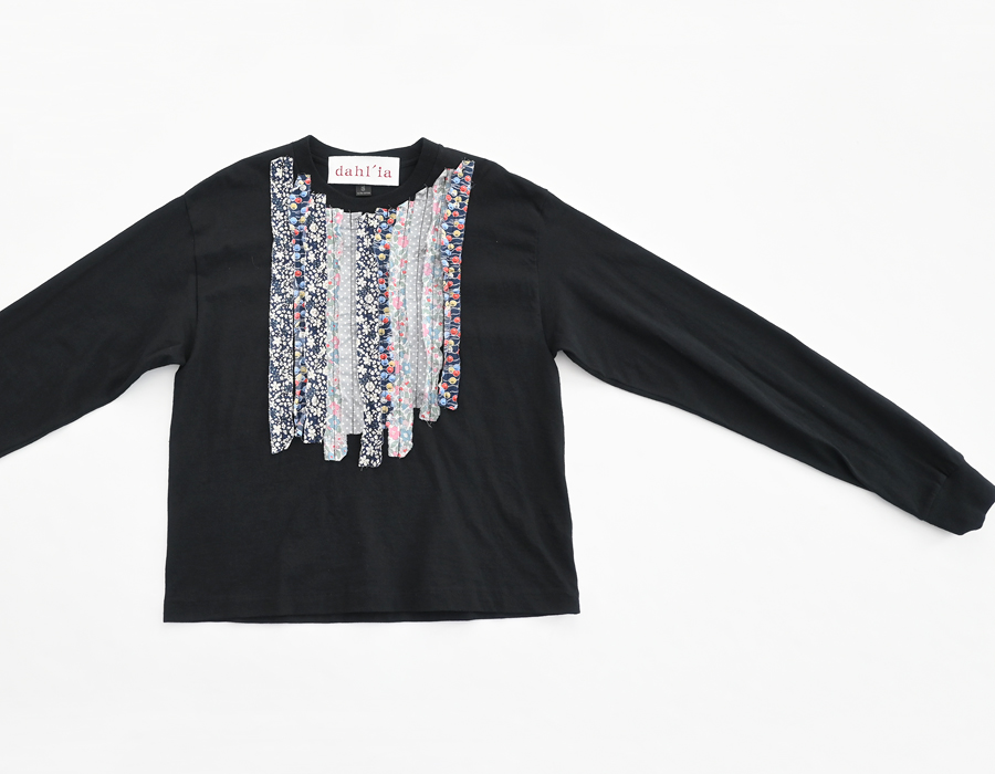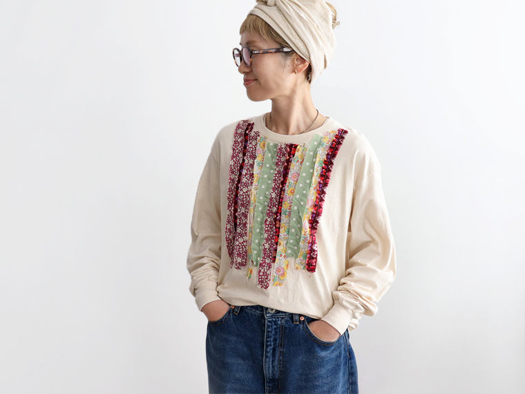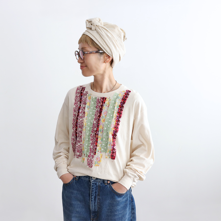 こちらは、フリルデコレーションTee。 花柄やドット柄などの切りっぱなしの生地をテープ状にデコレーション。とても印象的なアイテムに仕上がっています。ボディは、メンズのMサイズの長袖Tシャツ。適度なしっかり感のある程よい生地感のコットン素材です。あえて長めのお袖とゆったりしたサイズ感。ジーンズや軍パン、そのほかにもスカートやワイドパンツなど、ボトムを選ばず、コーディネイトしやすいです。