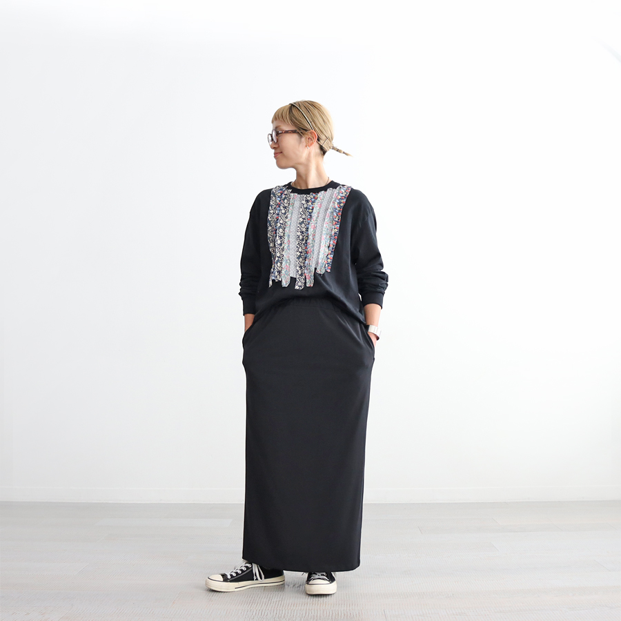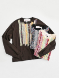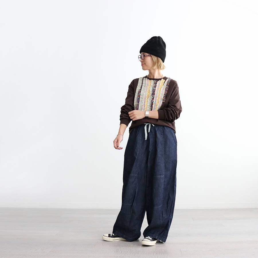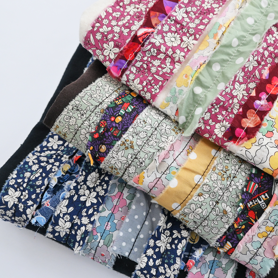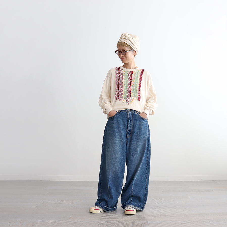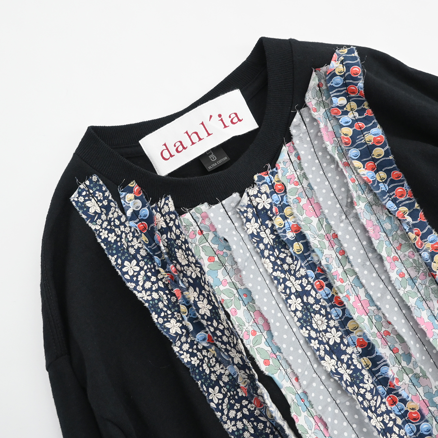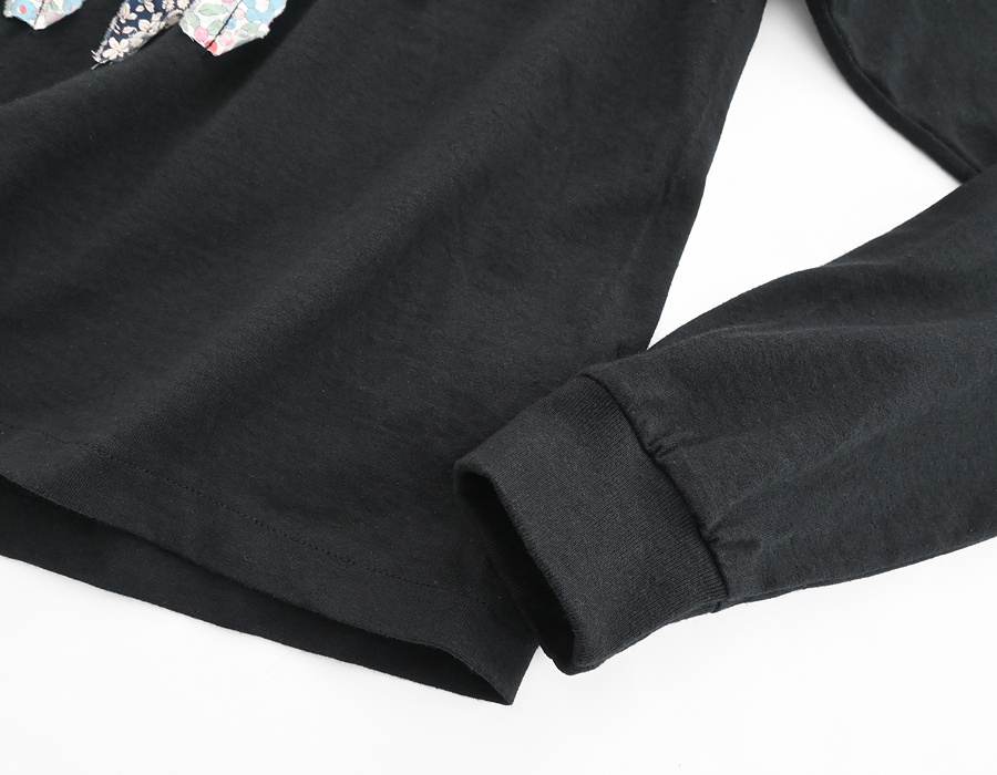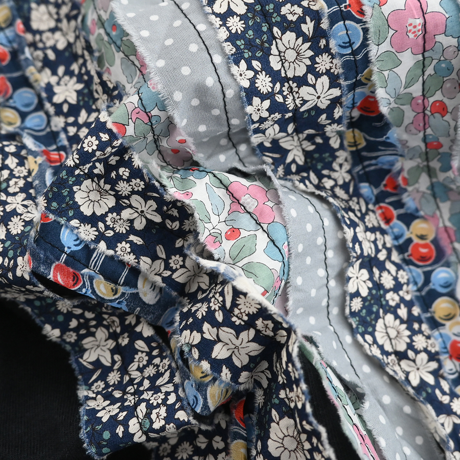 こちらは、フリルデコレーションTee。 花柄やドット柄などの切りっぱなしの生地をテープ状にデコレーション。とても印象的なアイテムに仕上がっています。ボディは、メンズのMサイズの長袖Tシャツ。適度なしっかり感のある程よい生地感のコットン素材です。あえて長めのお袖とゆったりしたサイズ感。ジーンズや軍パン、そのほかにもスカートやワイドパンツなど、ボトムを選ばず、コーディネイトしやすいです。