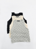 こちらは、フリンジがついたテープヤーンをダイヤ柄で編んだパターンベストです。透け感と立体感のあるベストを表現。インナーの配色によって生地のダイヤ柄がより鮮明になります。同色でインナーを合わせても生地に特徴があるので重ね着を魅力的にしてくれます。アームが広く重ね着がしやすいのがポイント。伸縮性に優れていて、柔らかく軽さのあるニットベストです。