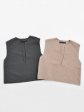 こちらは、深めのVネックデザインのニットベスト。軽くて丸みのある糸で編んでいることで表面にポコポコとしたスポンジリリーヤーン編みが雰囲気あります。速乾性もあり、伸縮性もあり、締め付け感のないラフで軽い着心地です。コンパクトめなシルエットなので重ね着もすっきりとした着こなしを表現します。ノースリーブでも素敵で、コーディネイトの幅を広げてくれるアイテムです。