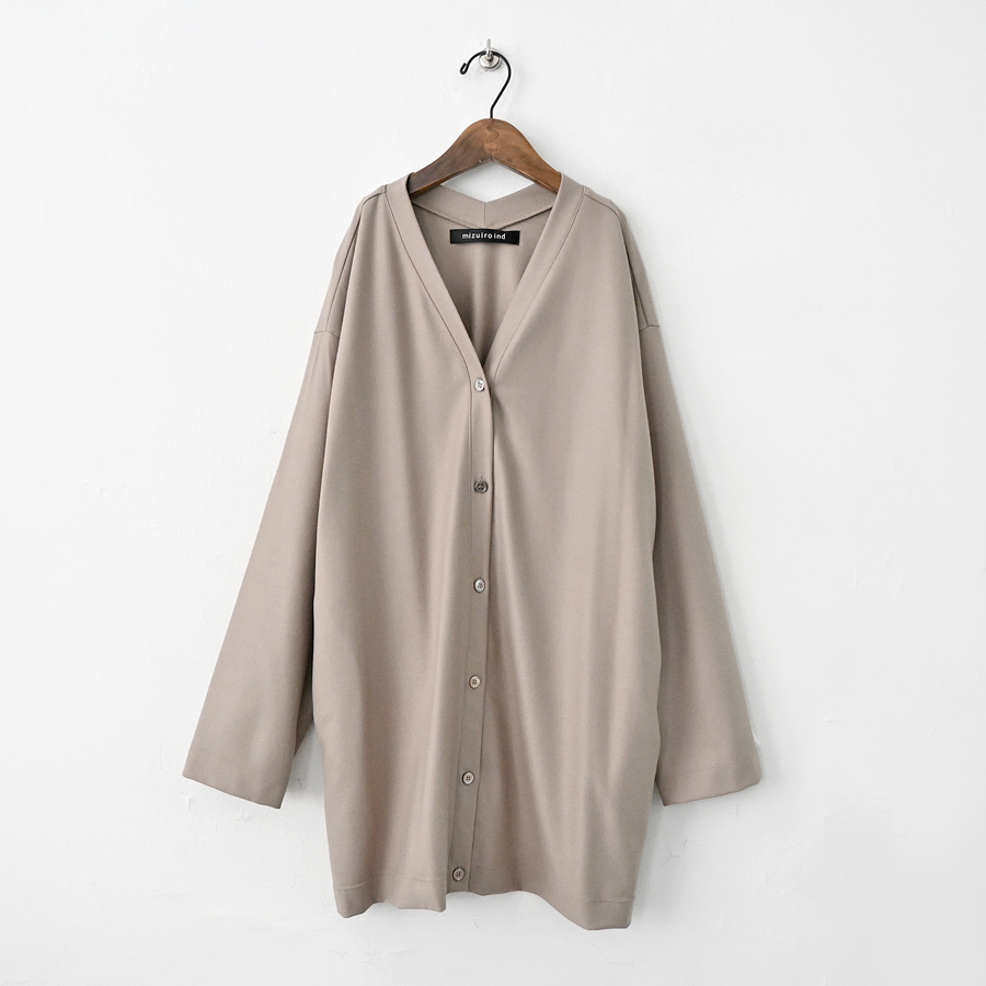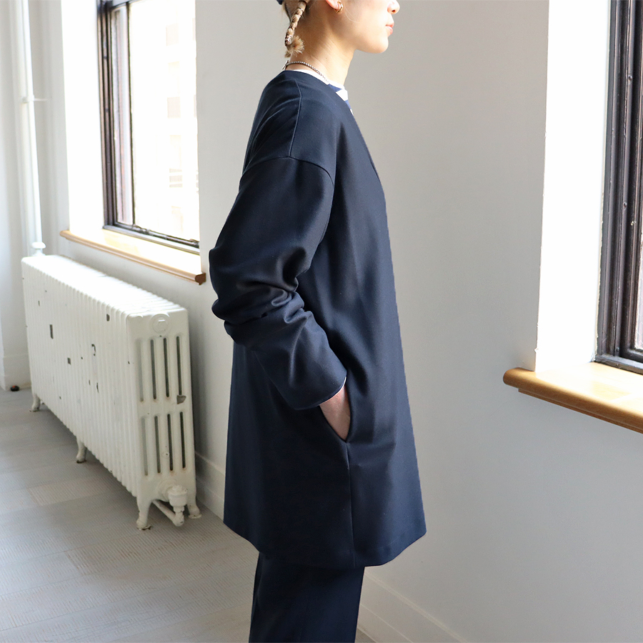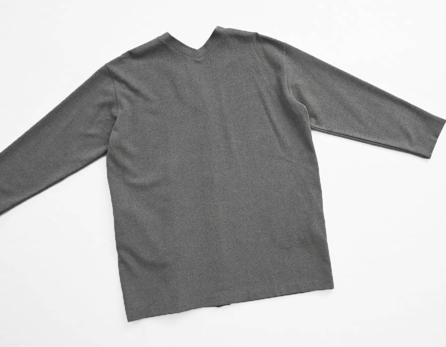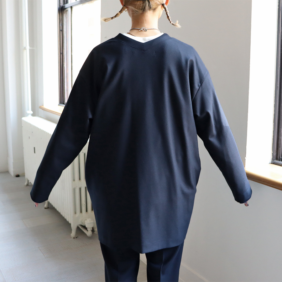首の後ろまで続くVネックデザインが特徴。肩を落としたドロップショルダーと落ち感のある程よくゆったりとしたシルエットで、体のラインを拾いすぎずリラックス感のある着心地です。