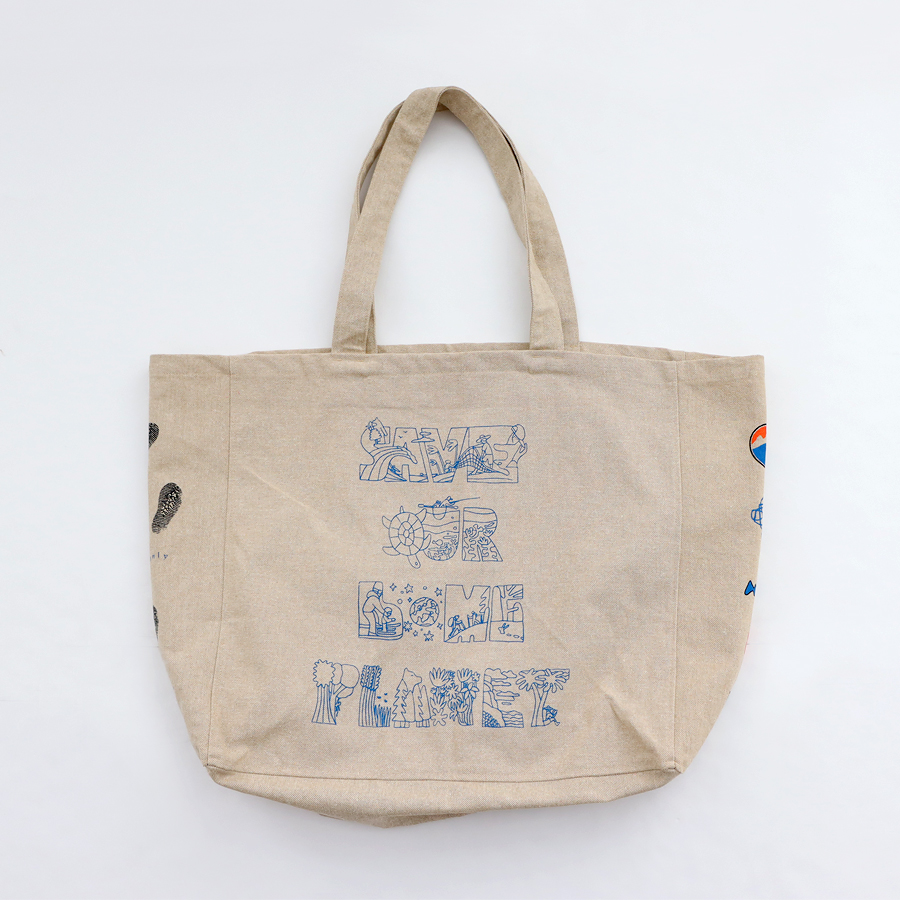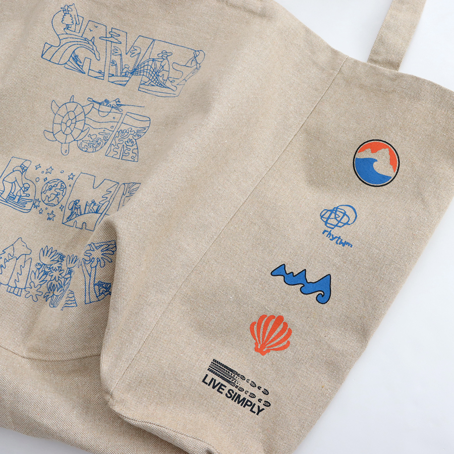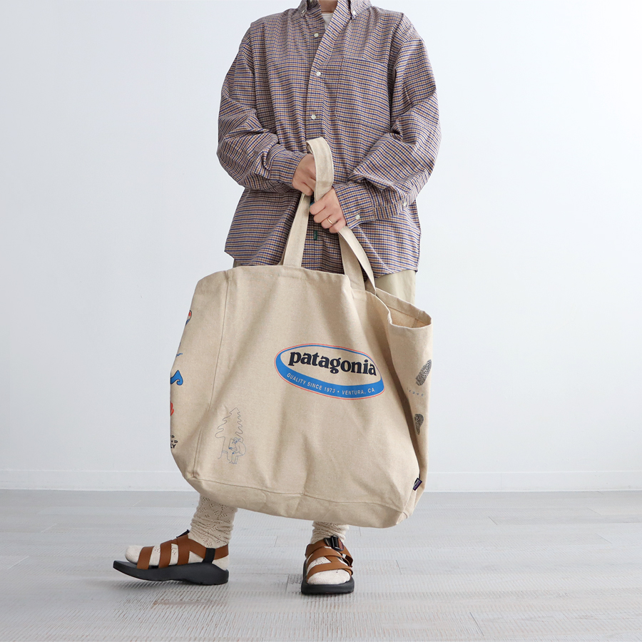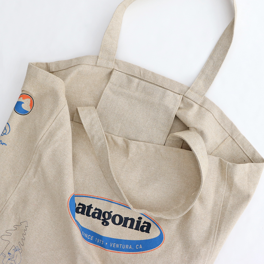 こちらは、ビッグサイズのトートバッグ。素材はパタゴニアのアップライザル製品の端切れを利用。端切れと回収されたペットボトルを利用したリサイクル素材を100%使用し、バージン原料への依存を削減しています。程よくしっかり感のあるコットンキャンバスのような生地感。大容量で旅行やショッピングなど用途もさまざま。便利な内ポケット付きです。