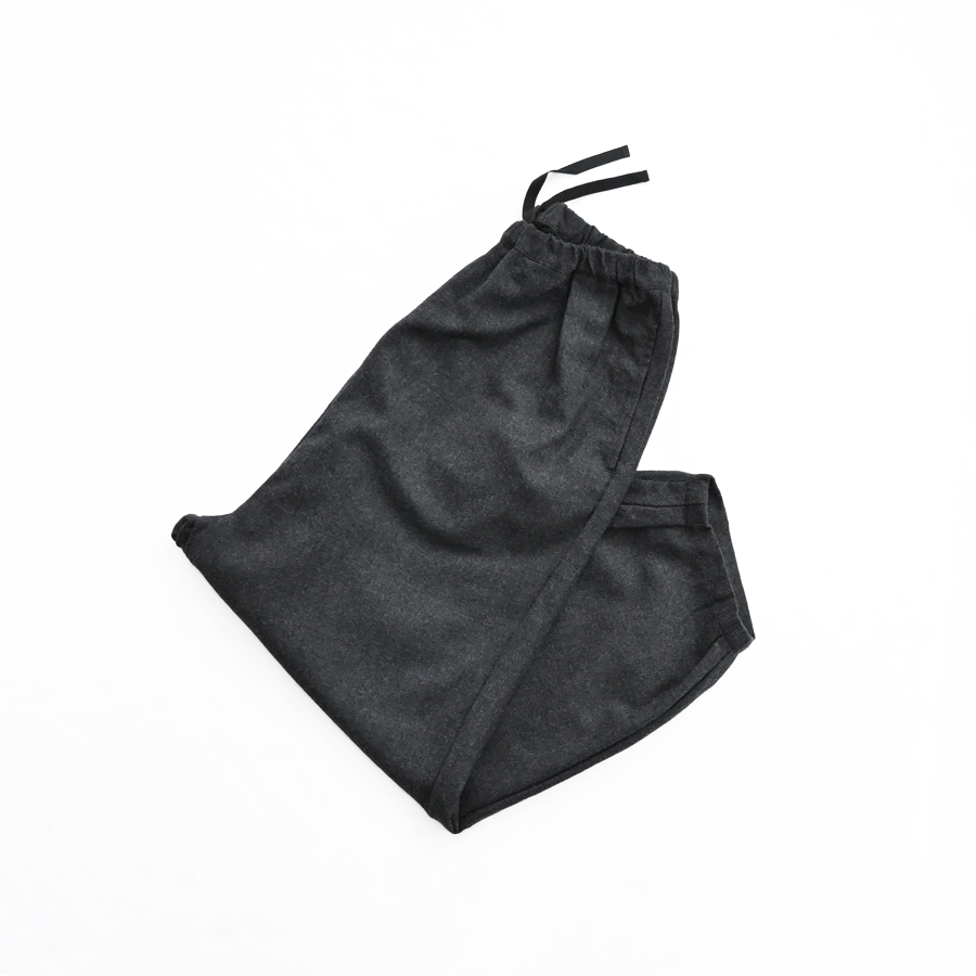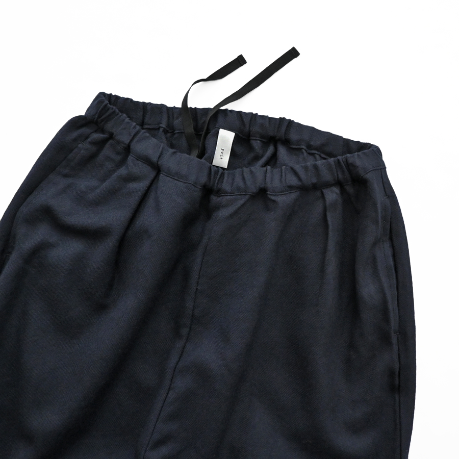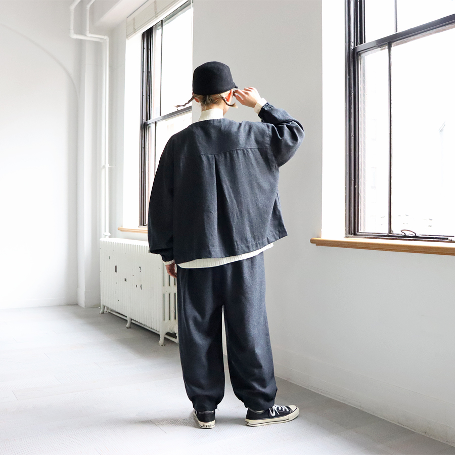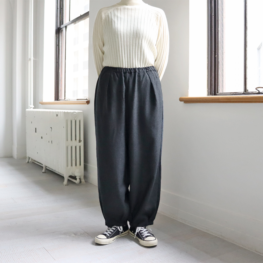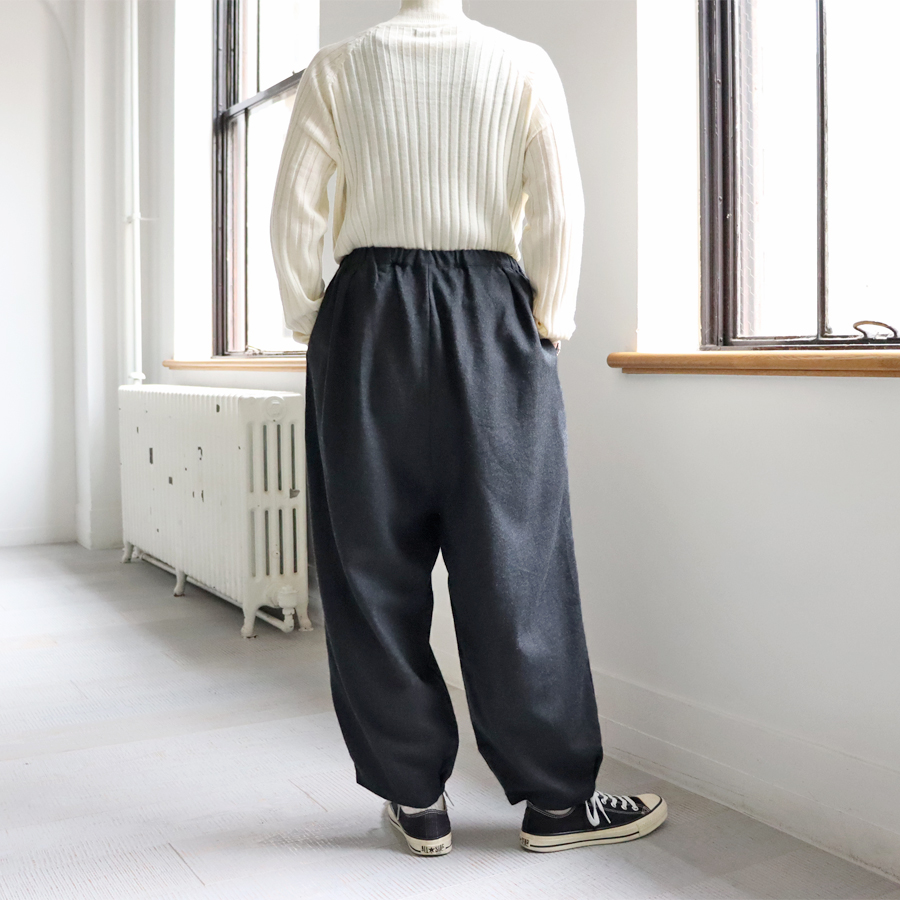 ウエストはゴムと紐のイージー仕様。お揃いのノーカラーブラウスとのセットアップでのコーディネートもオススメです。