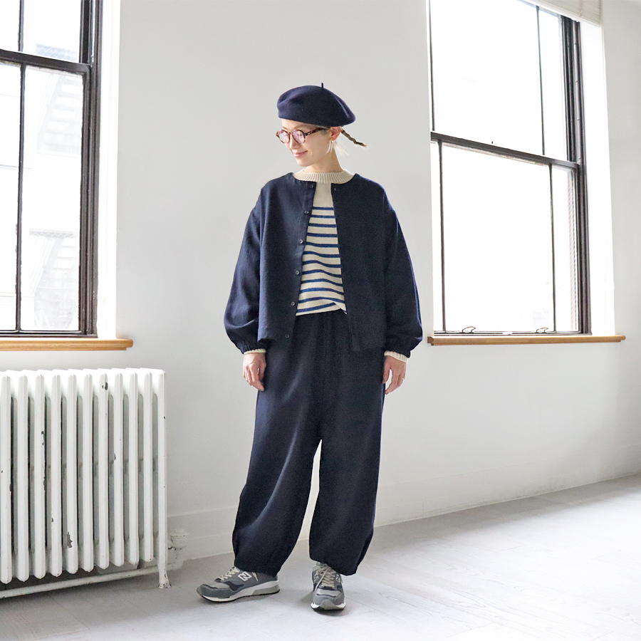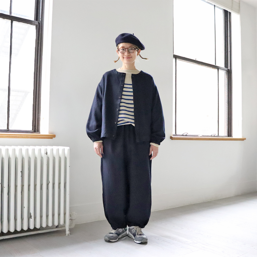 ■ネイビー(身長158cm)お揃いのノーカラーブラウスとセットアップで着用