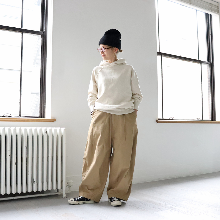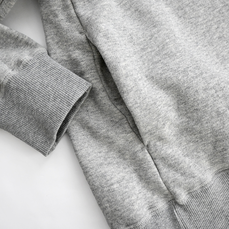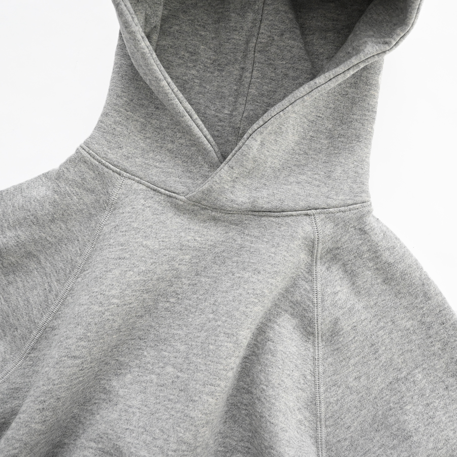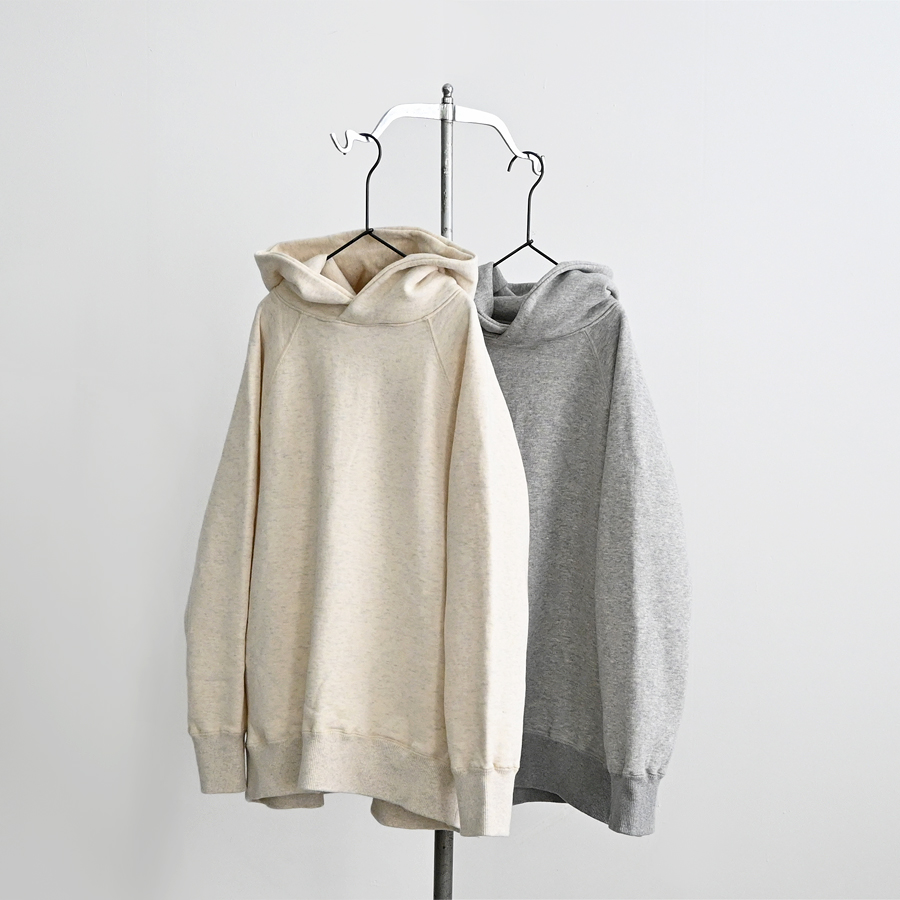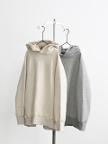 こちらは、ふんわりと柔らかな肌触りで着心地のよい裏起毛生地を使用したフードプルオーバー。
