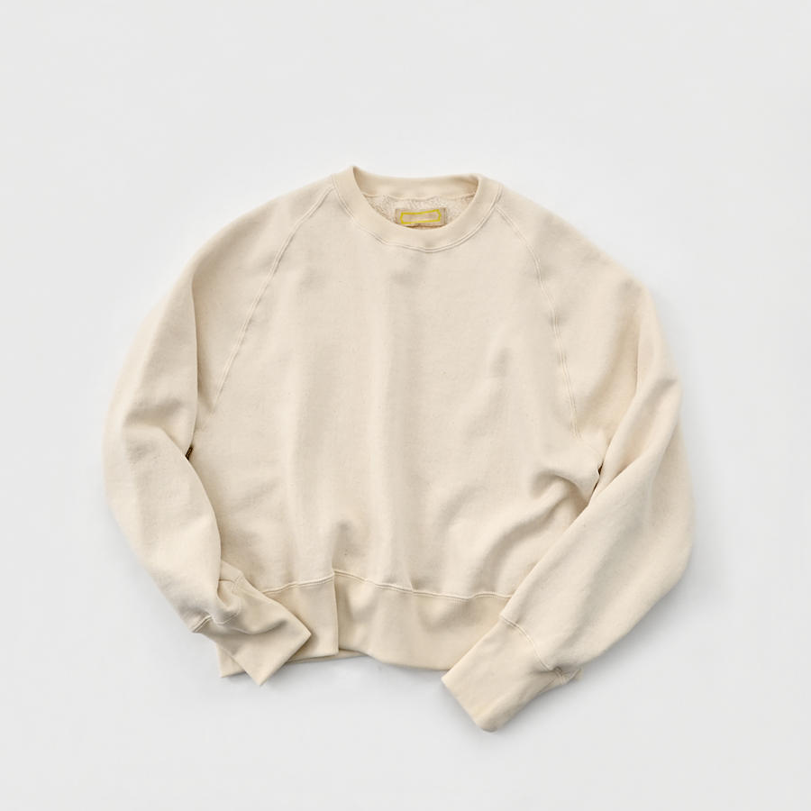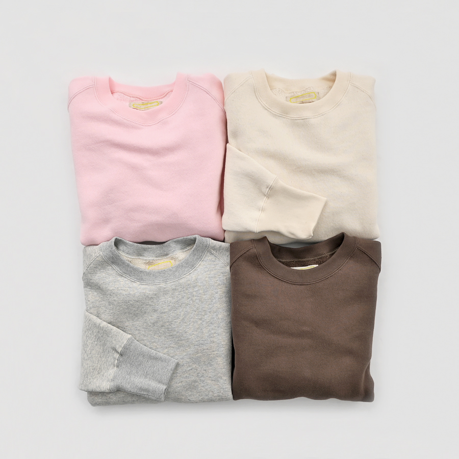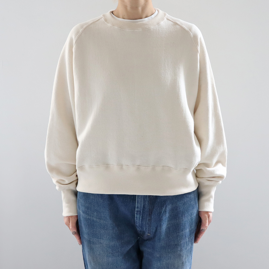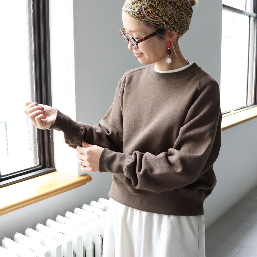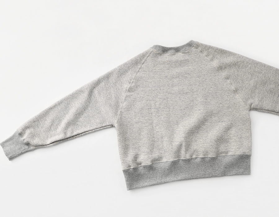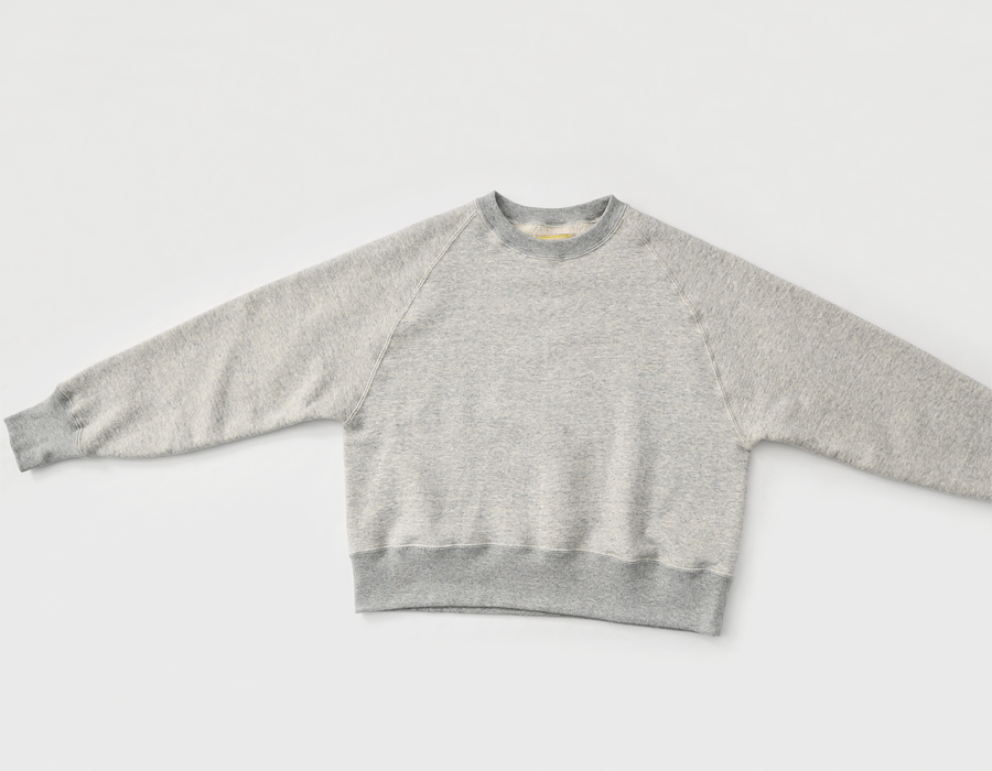 そしてこちらは、ラグランスリーブのクルーネックスウェット。詰まり気味なクルーネック、ヴィンテージライクな長めの袖口のリブ。バランスのとりやすいやや短めの着丈に、ゆとりあるアーム。シンプルながらも拘りの詰まった一枚です。お揃いのスウェットパンツとのセットアップもおすすめです。