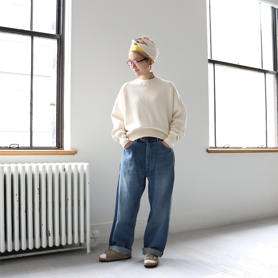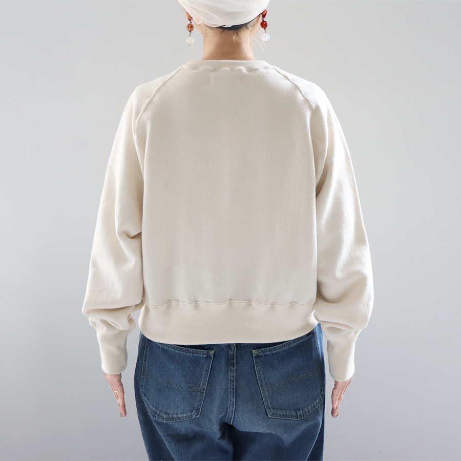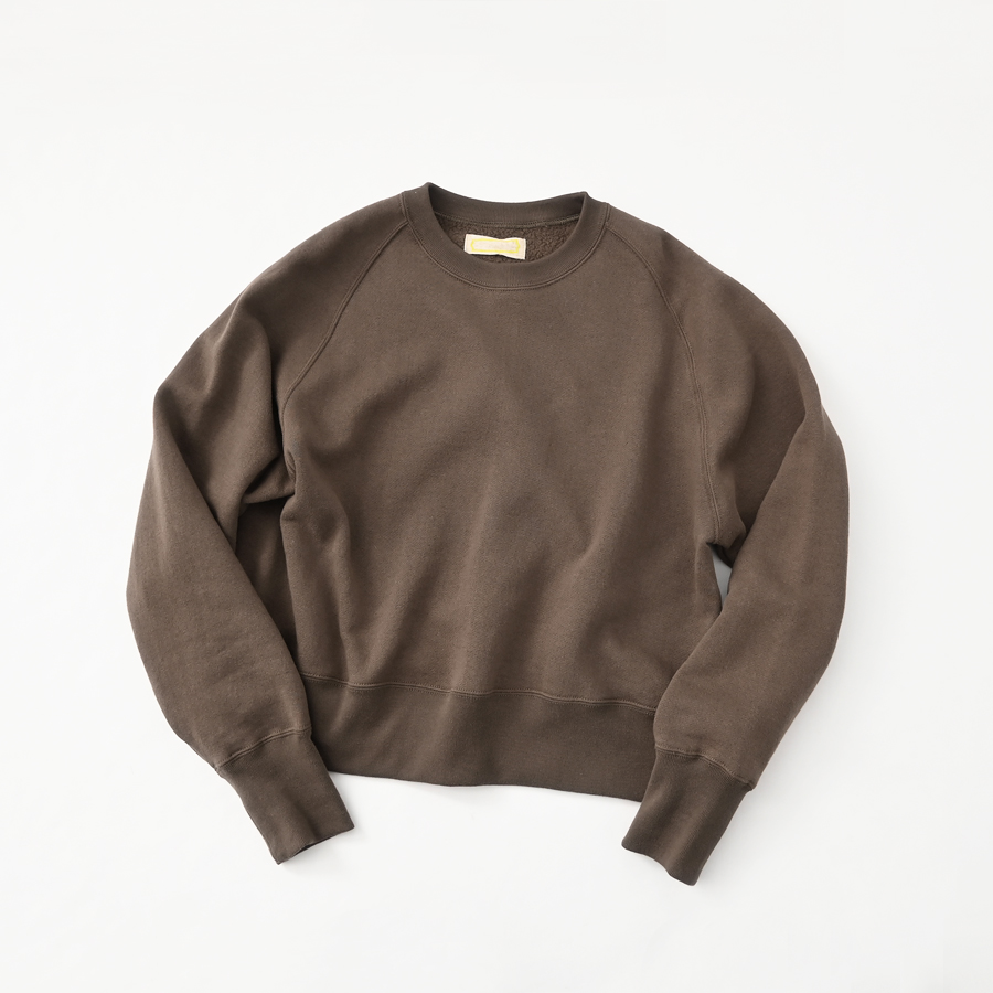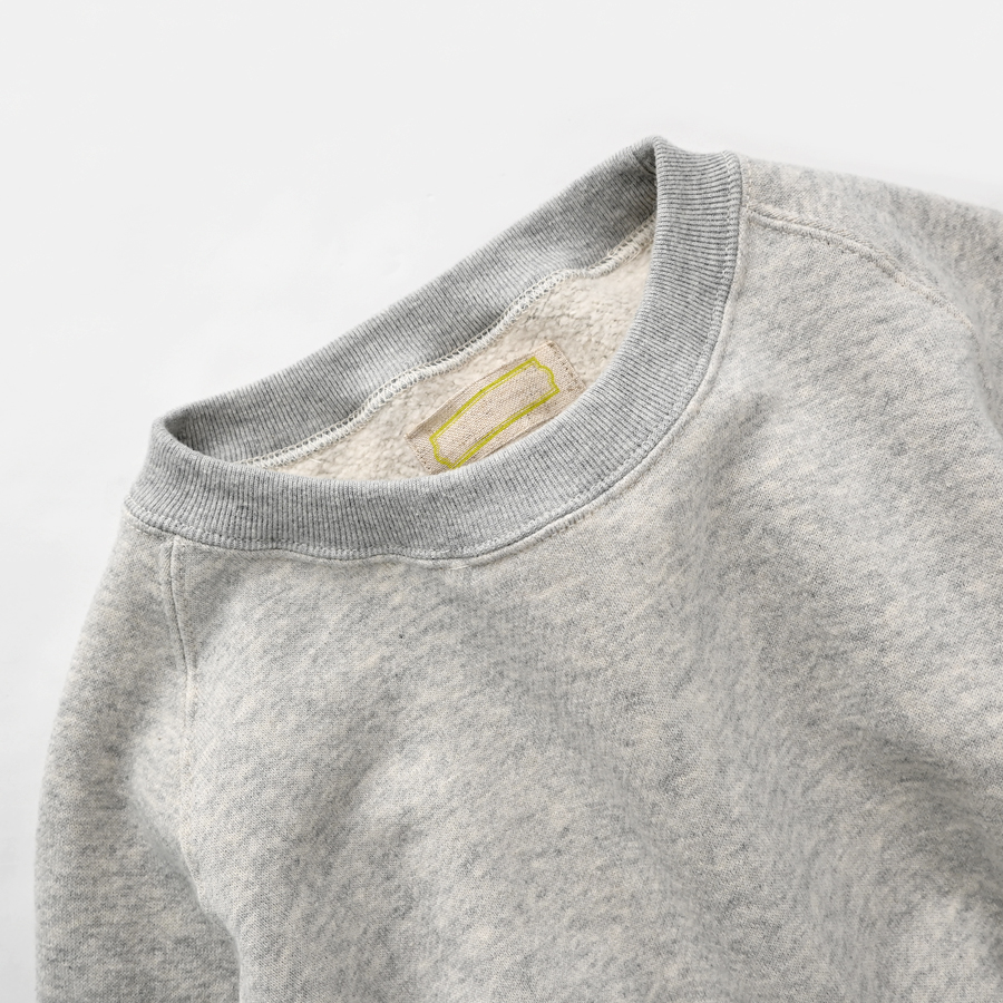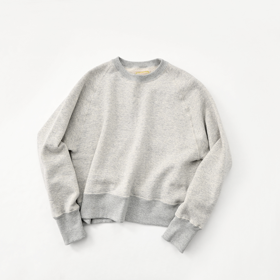 そしてこちらは、ラグランスリーブのクルーネックスウェット。詰まり気味なクルーネック、ヴィンテージライクな長めの袖口のリブ。バランスのとりやすいやや短めの着丈に、ゆとりあるアーム。シンプルながらも拘りの詰まった一枚です。お揃いのスウェットパンツとのセットアップもおすすめです。