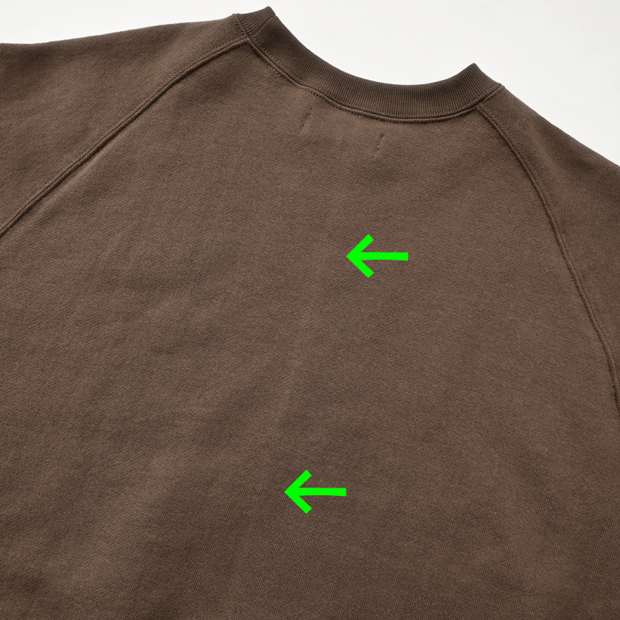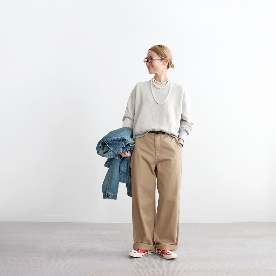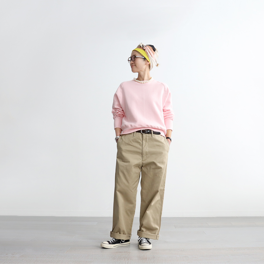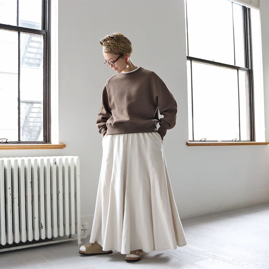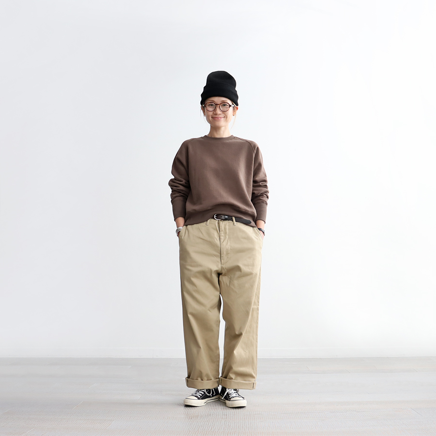 そしてこちらは、ラグランスリーブのクルーネックスウェット。詰まり気味なクルーネック、ヴィンテージライクな長めの袖口のリブ。バランスのとりやすいやや短めの着丈に、ゆとりあるアーム。シンプルながらも拘りの詰まった一枚です。お揃いのスウェットパンツとのセットアップもおすすめです。
