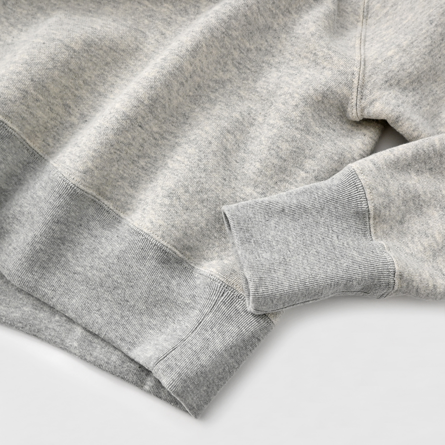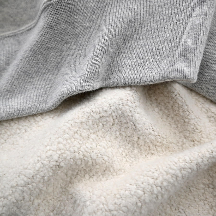 厚すぎず薄すぎず、ごつ感のないふんわりとした弾力と優しい肌触りのふっかふかの裏起毛スウェット地です。約100年前に活躍していた起毛機を復活させて作られた、独特のパイルのような起毛感が特徴的。サイドに縫い目のない丸胴編みで、軽くて優しいストレスフリーな着心地です。
