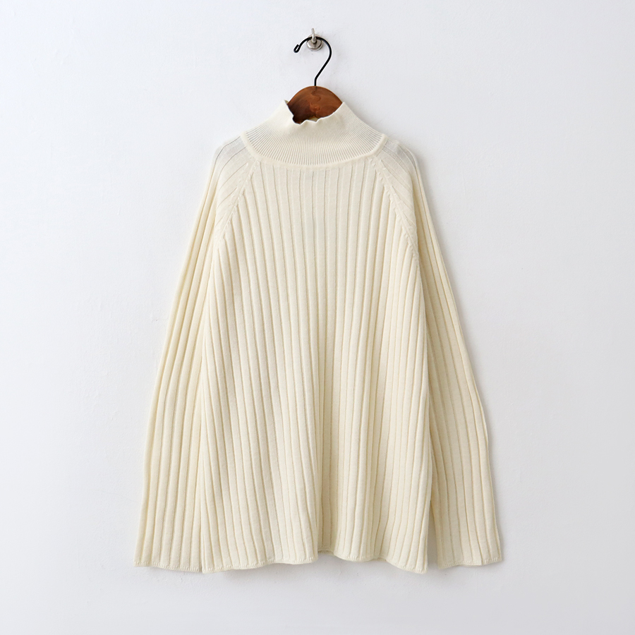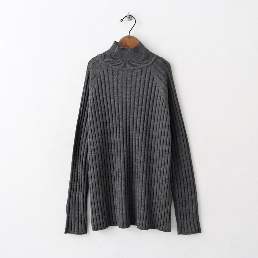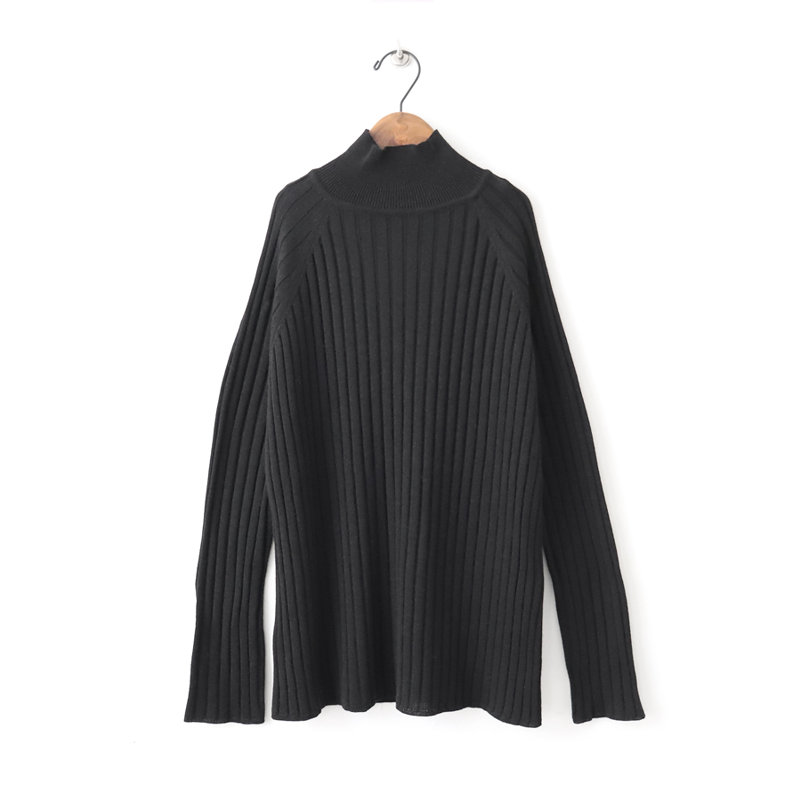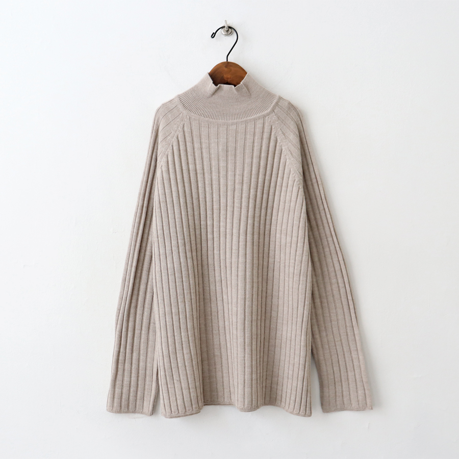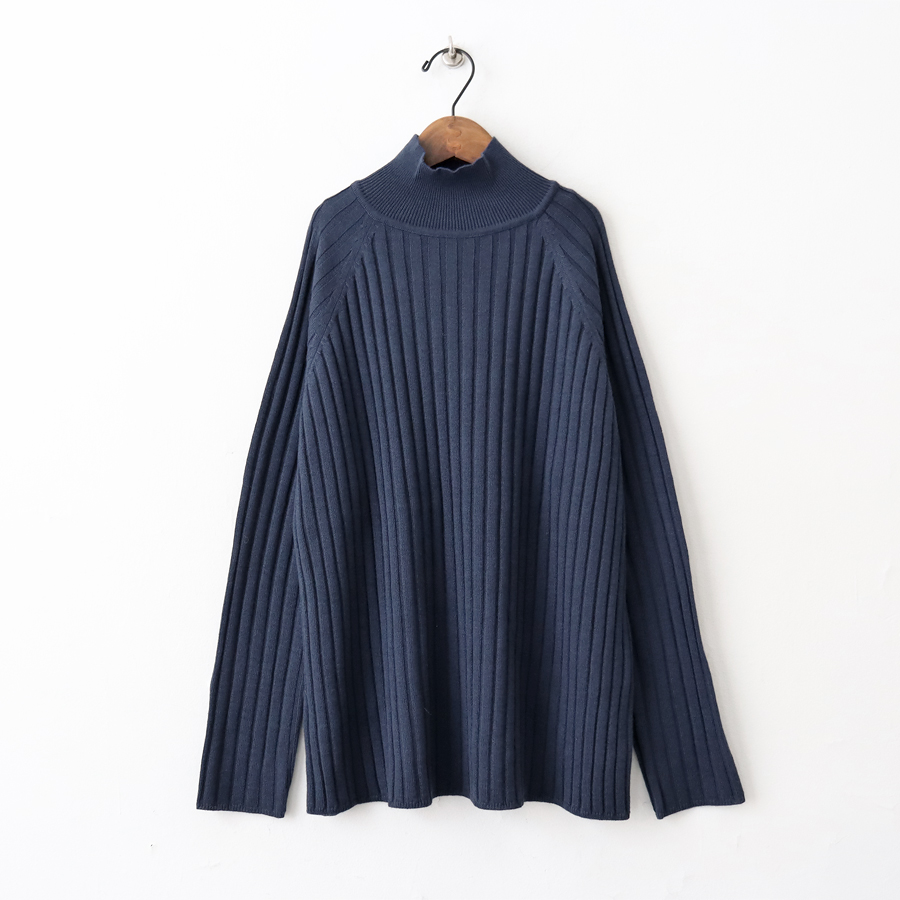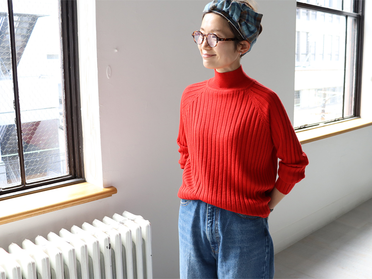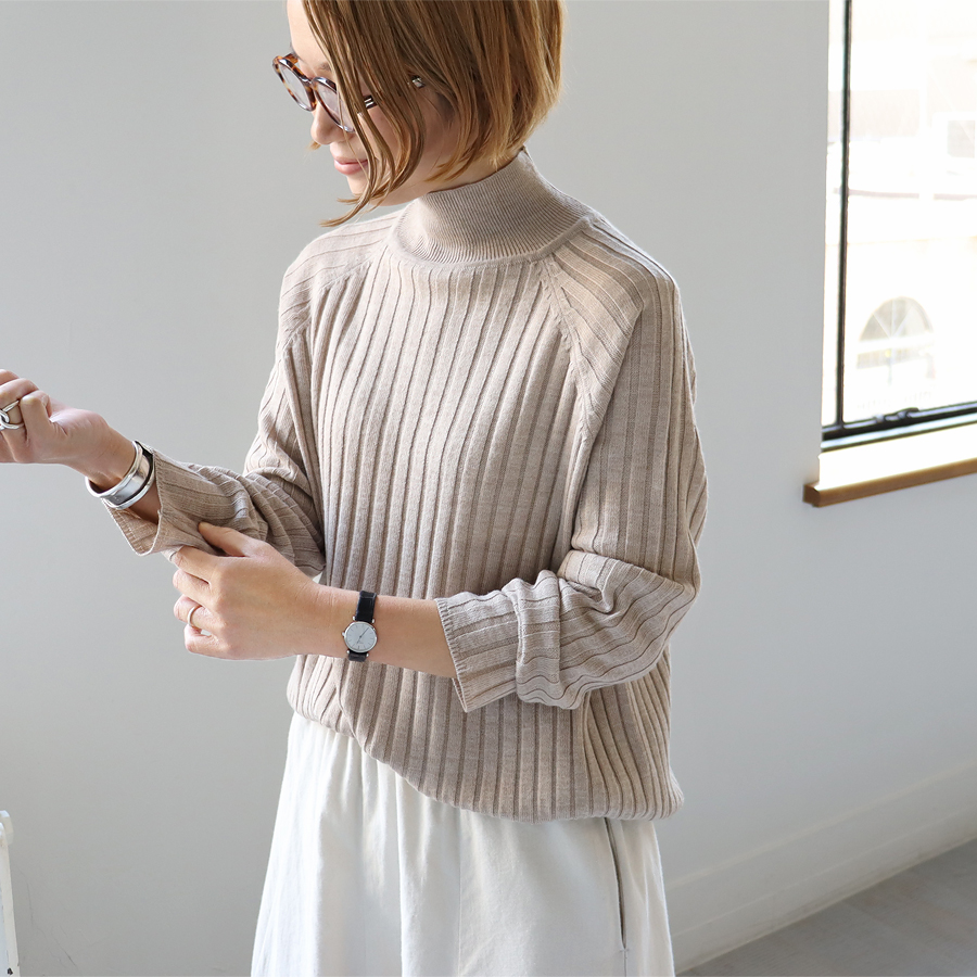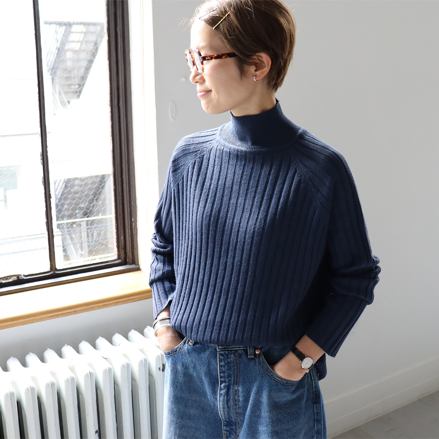 こちらは、サロ別注のリブ編みのハイネックセーター。アクリル×ウールの滑らかでチクチク感を抑えたライトな風合いを目指しました。ジャケットやシャツなどのインナーに着やすいように、やや薄手仕様にし、肩馴染みのよいラグランスリーブにしています。また、伸縮性があり、すっきりとした見た目ながらも締め付け感なくラフな着心地です。シルエットはルーズを抑え、タイトすぎない程よくゆとりあるサイズ感で一枚でもインナー使いにも活躍してくれると思います。また、アクリル混でチクチク感を抑えた優しい肌触りです。