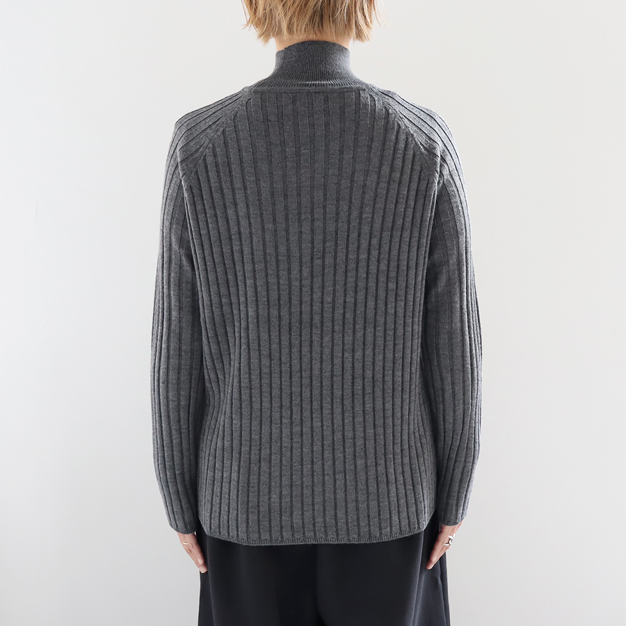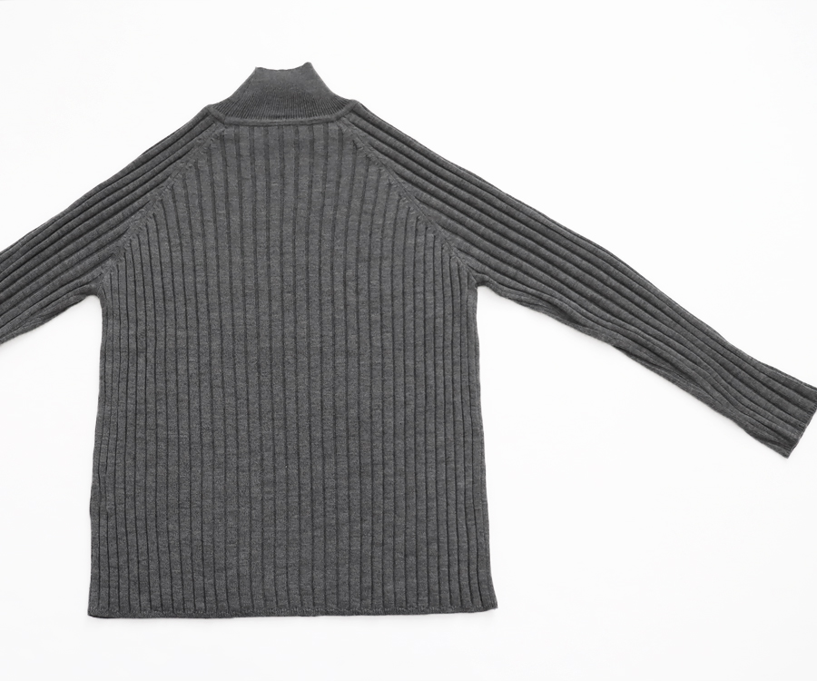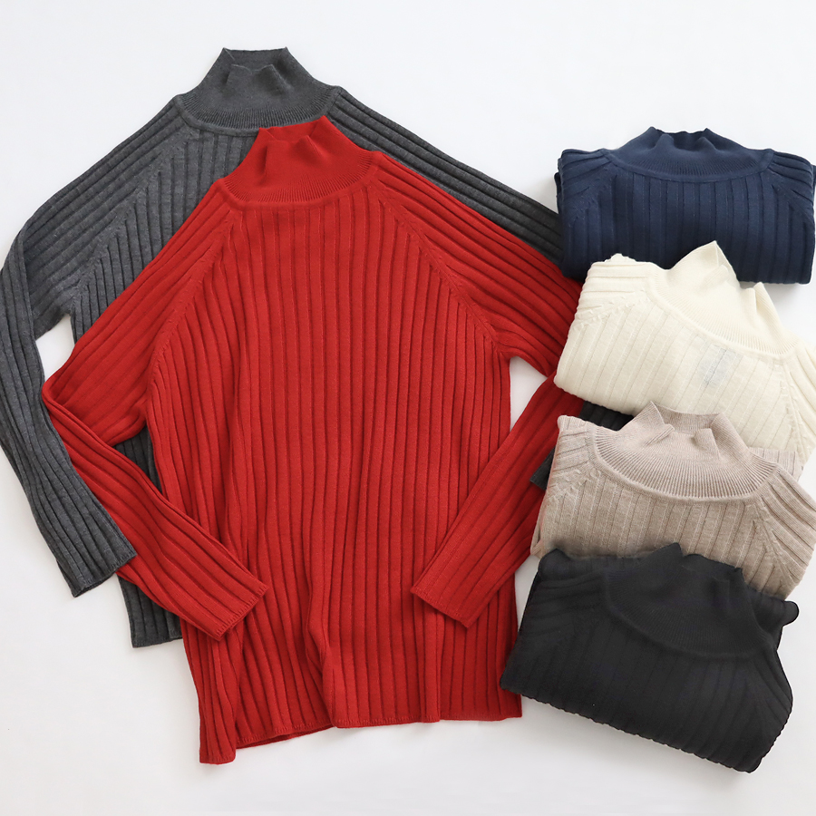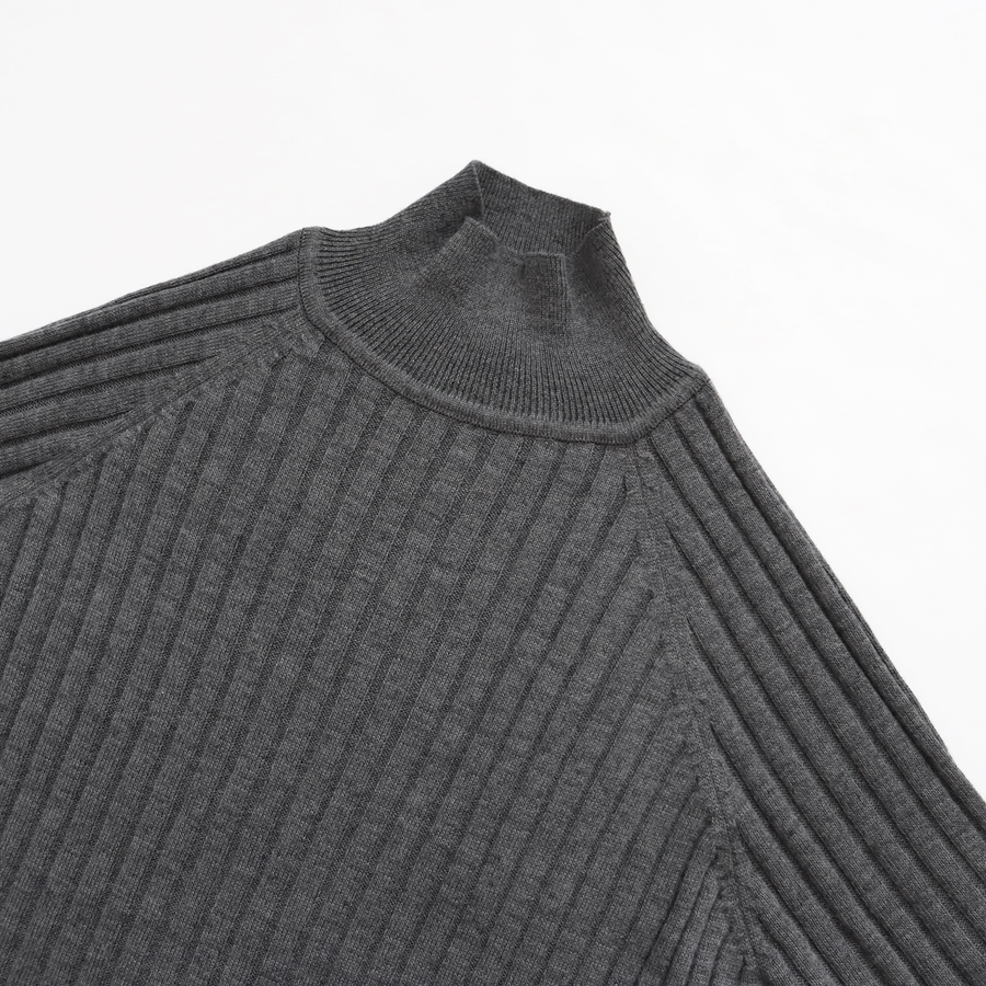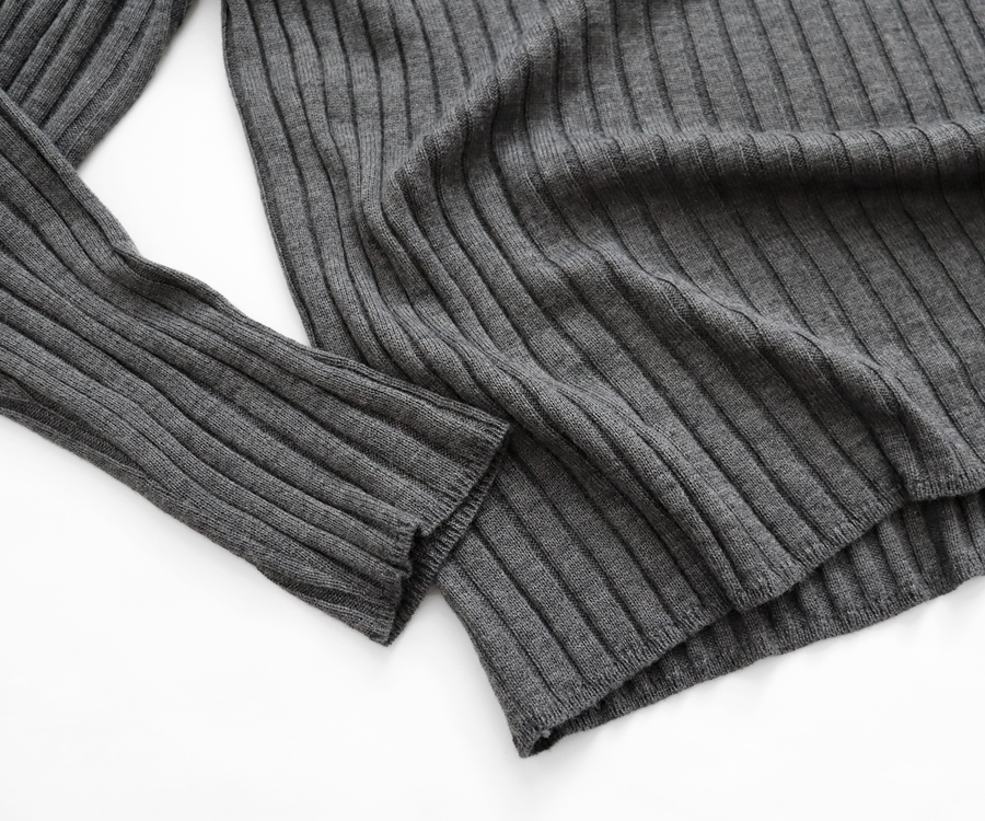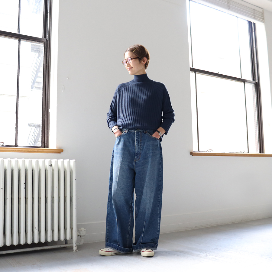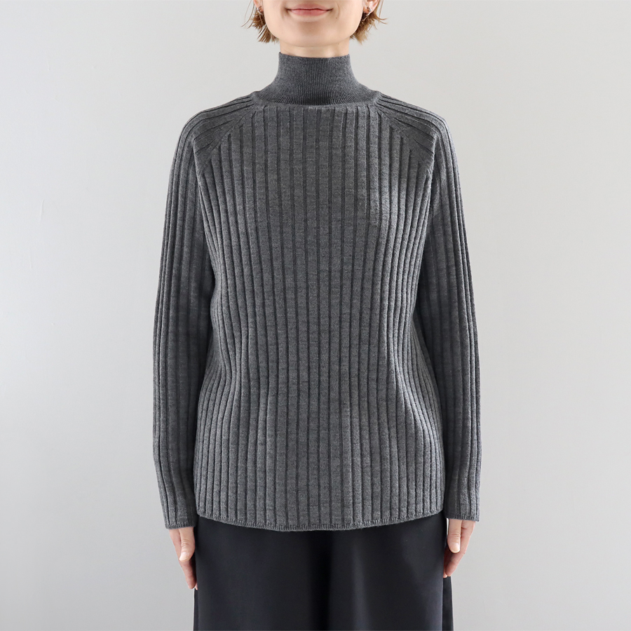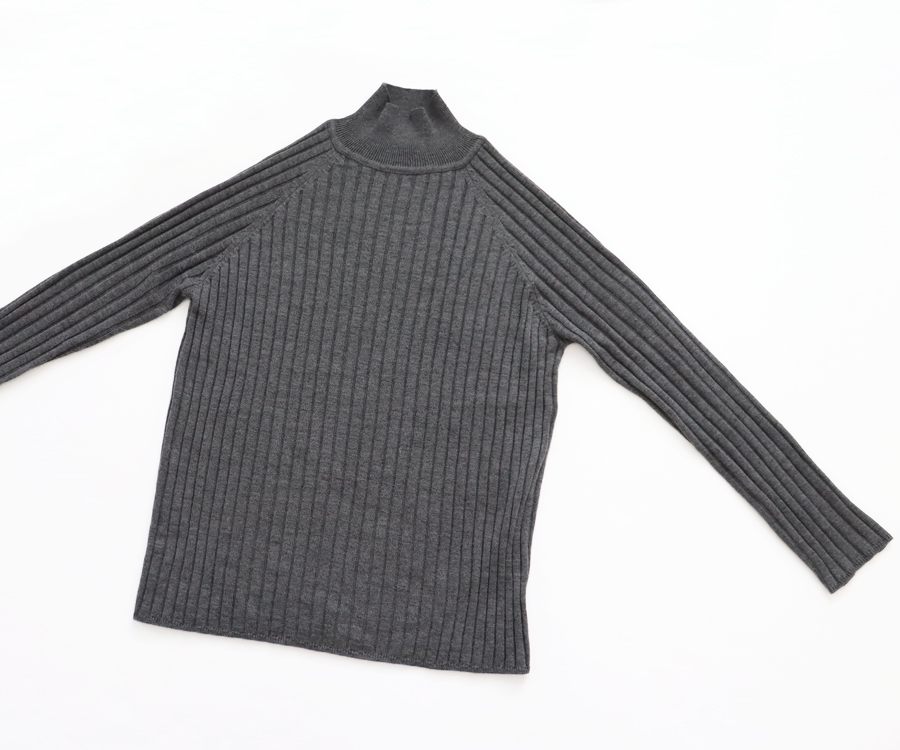 こちらは、サロ別注のリブ編みのハイネックセーター。アクリル×ウールの滑らかでチクチク感を抑えたライトな風合いを目指しました。ジャケットやシャツなどのインナーに着やすいように、やや薄手仕様にし、肩馴染みのよいラグランスリーブにしています。また、伸縮性があり、すっきりとした見た目ながらも締め付け感なくラフな着心地です。シルエットはルーズを抑え、タイトすぎない程よくゆとりあるサイズ感で一枚でもインナー使いにも活躍してくれると思います。また、アクリル混でチクチク感を抑えた優しい肌触りです。