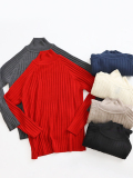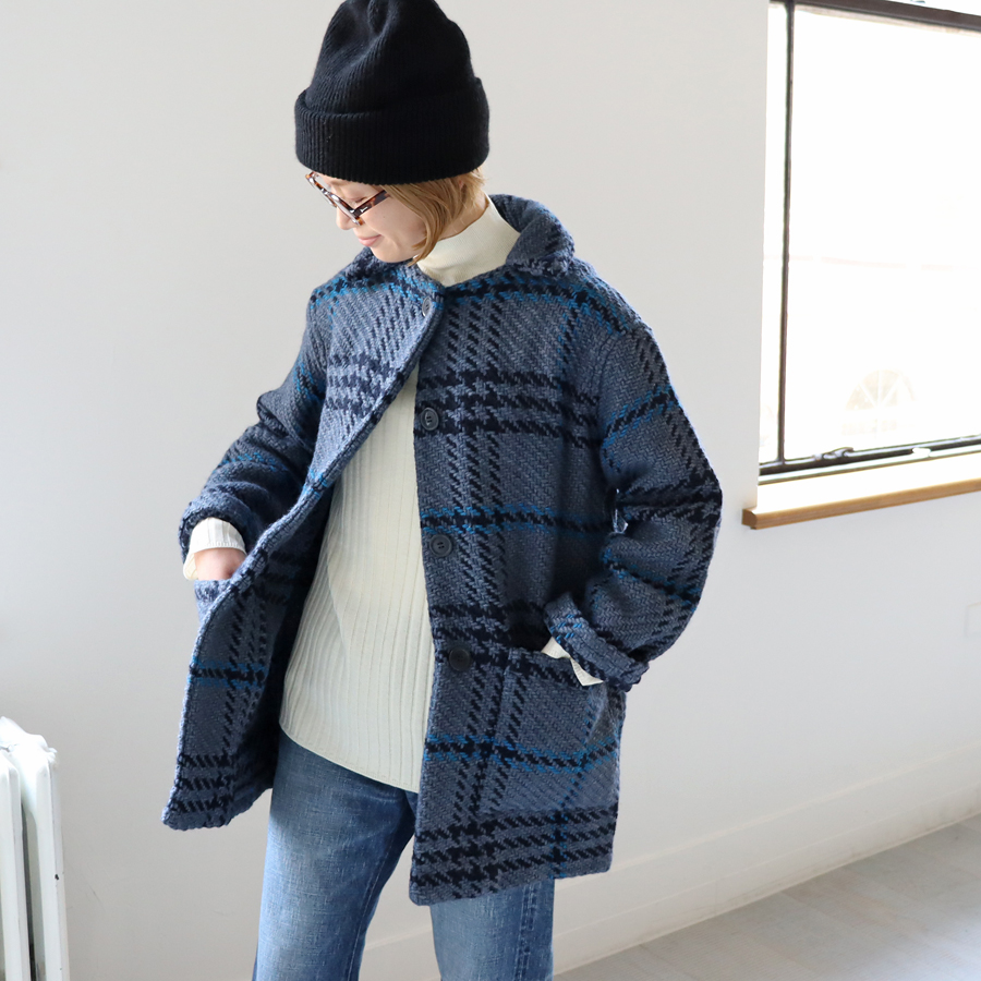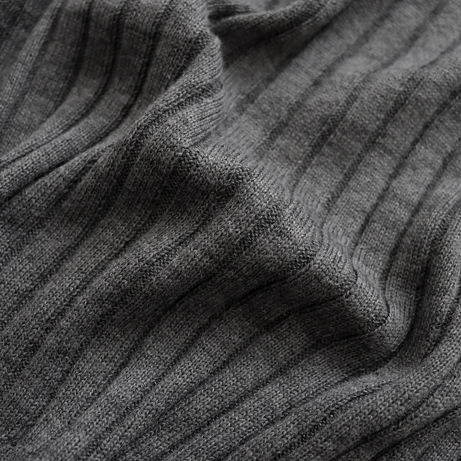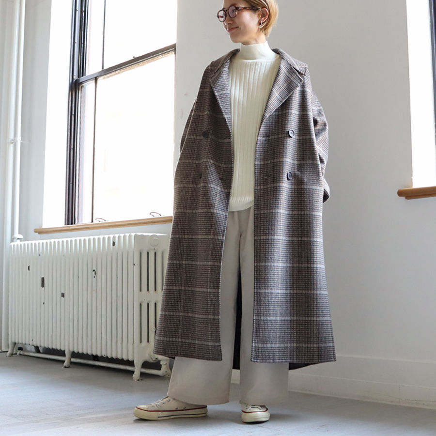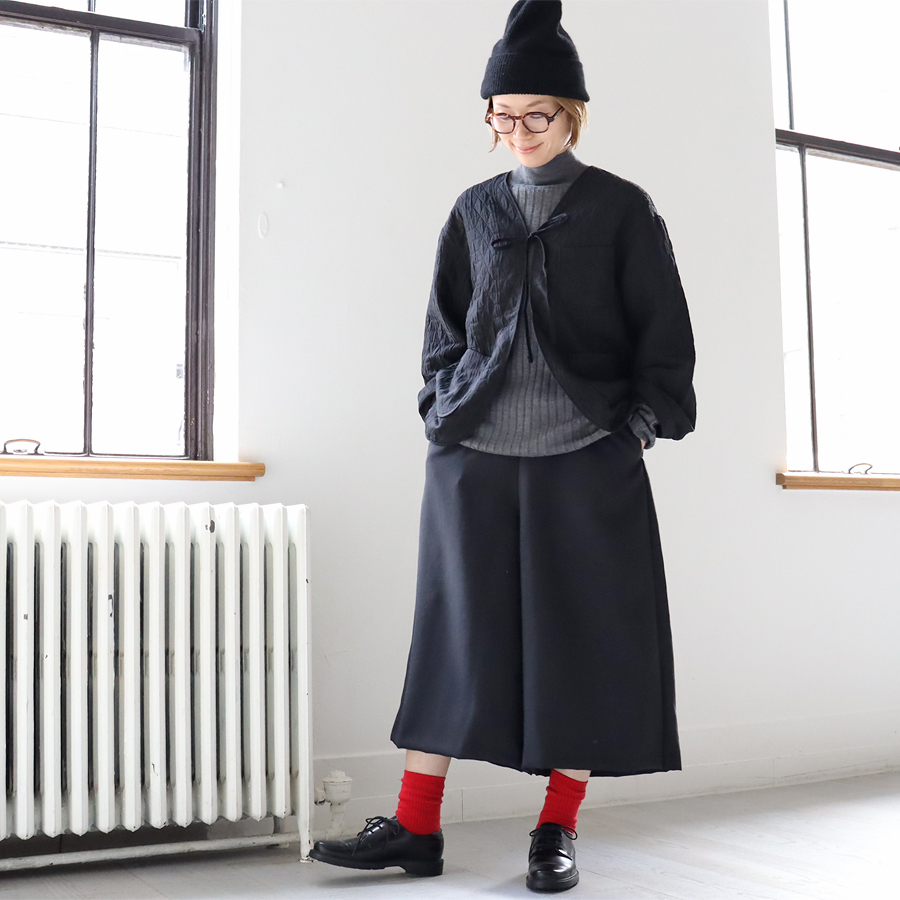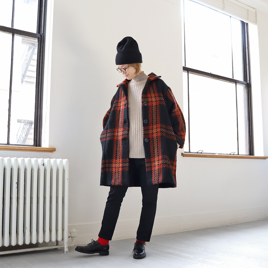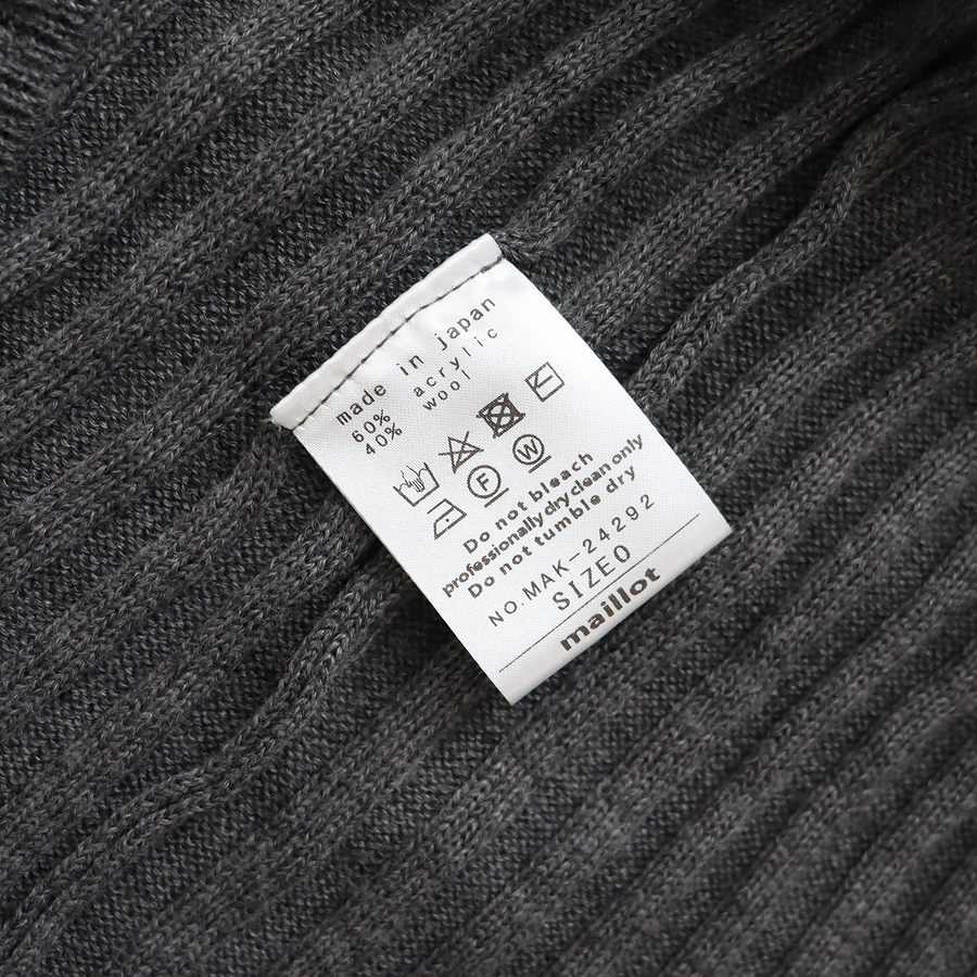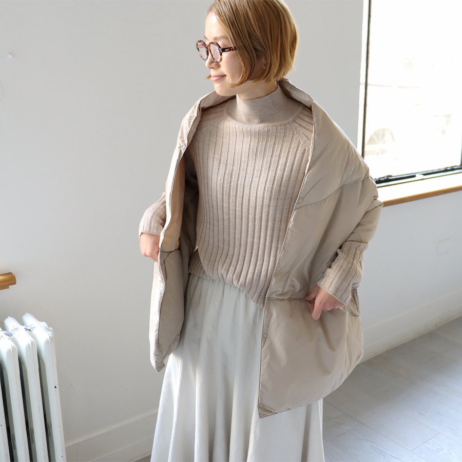 こちらは、サロ別注のリブ編みのハイネックセーター。アクリル×ウールの滑らかでチクチク感を抑えたライトな風合いを目指しました。ジャケットやシャツなどのインナーに着やすいように、やや薄手仕様にし、肩馴染みのよいラグランスリーブにしています。また、伸縮性があり、すっきりとした見た目ながらも締め付け感なくラフな着心地です。シルエットはルーズを抑え、タイトすぎない程よくゆとりあるサイズ感で一枚でもインナー使いにも活躍してくれると思います。また、アクリル混でチクチク感を抑えた優しい肌触りです。