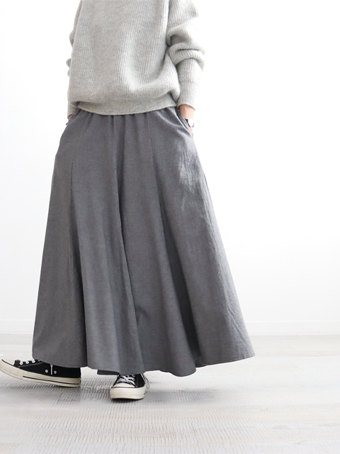 こちらは、8枚はぎのロングスカート。生地はコットンネル素材で起毛がかった季節感ある風合いです。8枚はぎにすることによって、ウエスト、腰周りを比較的すっきりとした印象に仕上げました。裾に向かって広がるキレイなフレアーシルエットも魅力的。ウエストはゴムなので、見た目以上にラフに穿いて頂けます。